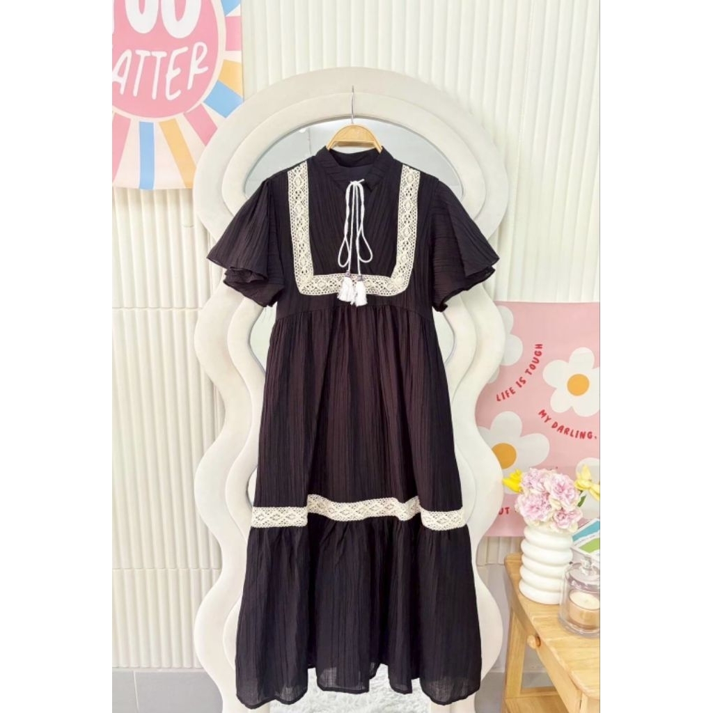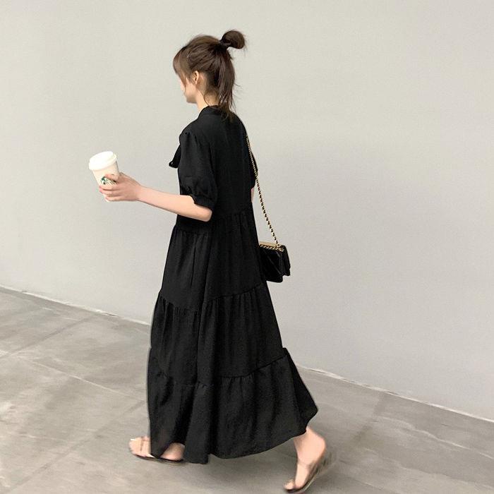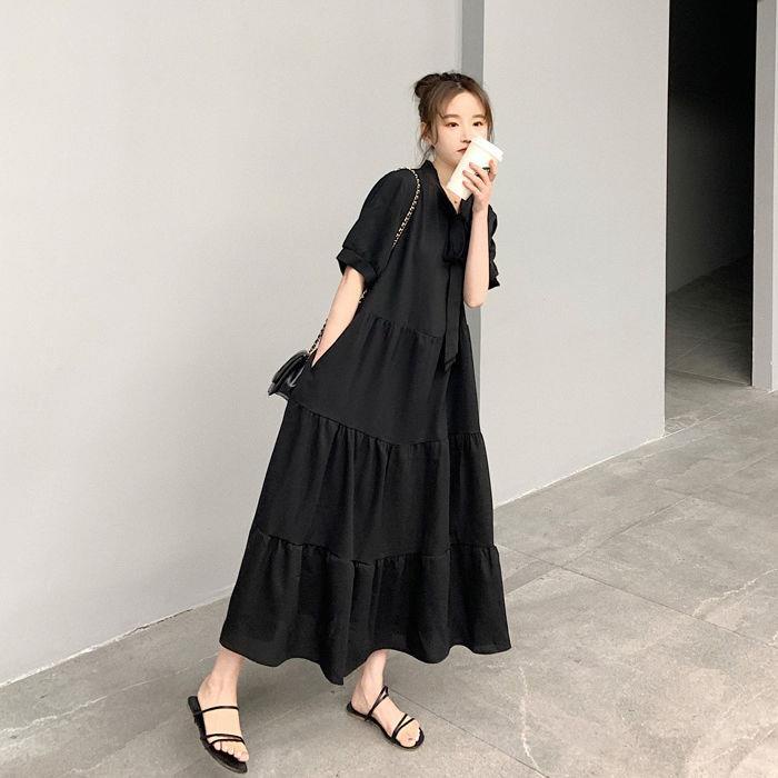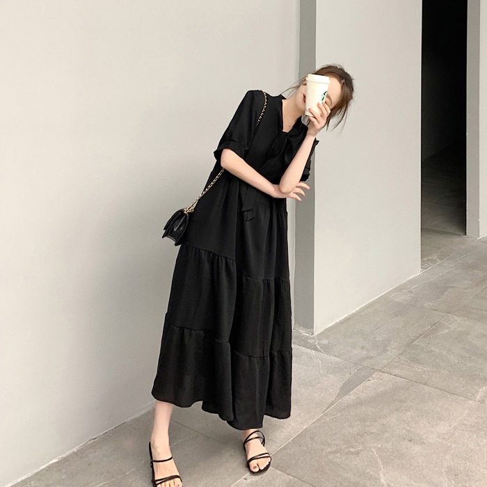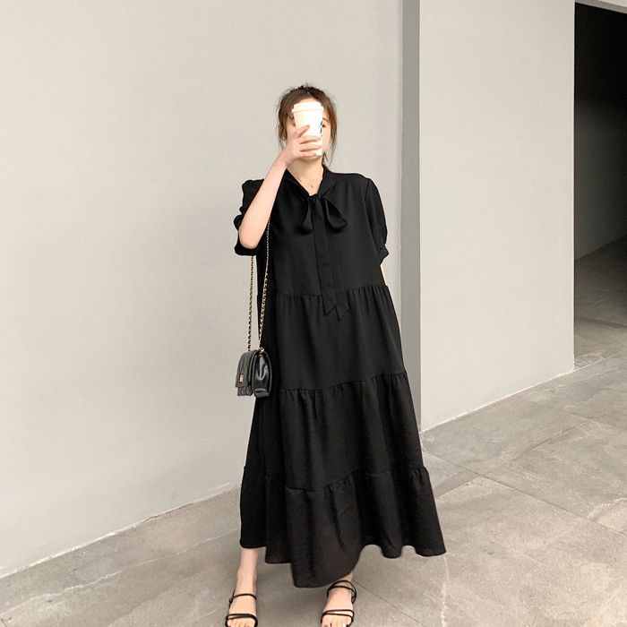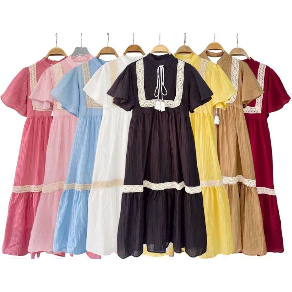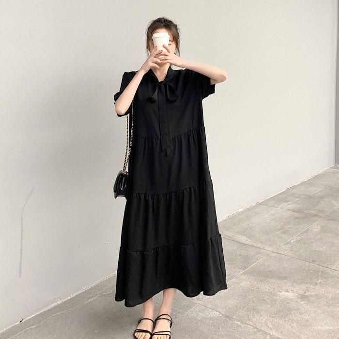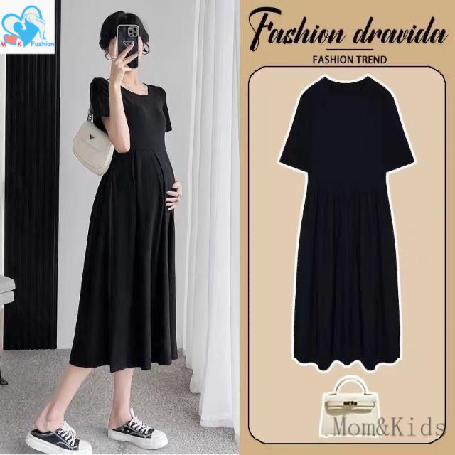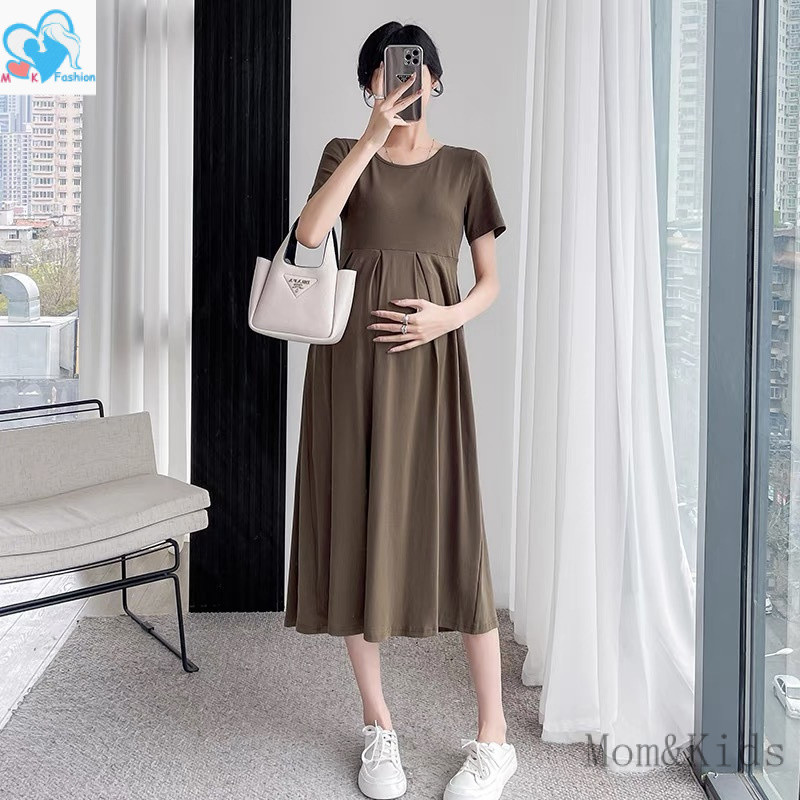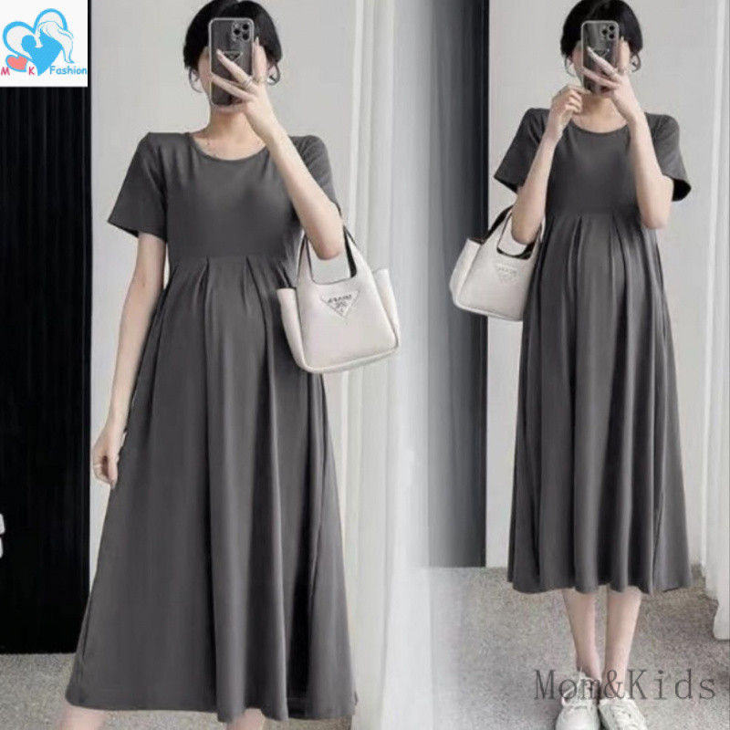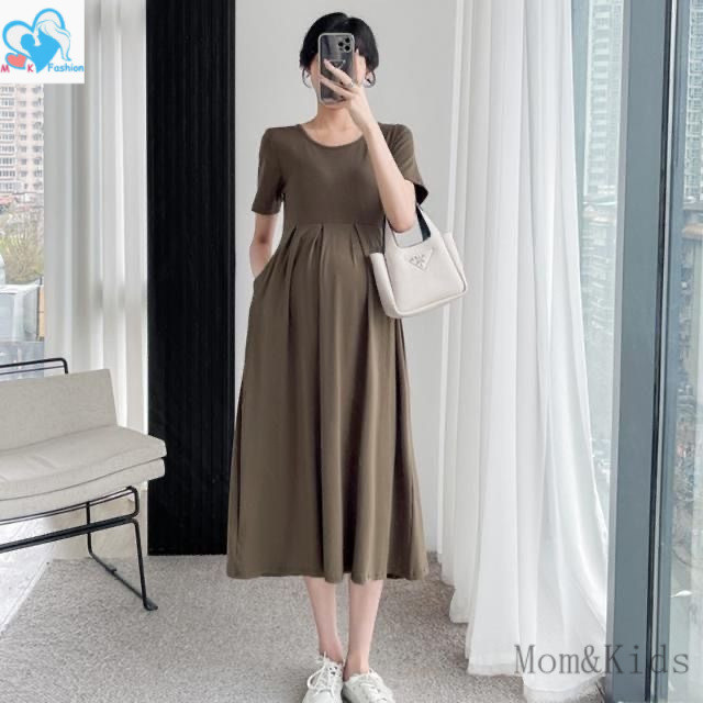 ชุดเดรสทรงสวยสีพื้นคนท้องใส่ได้34-44 ผ้าสลาฟอัดพลีทมีซับในผ้าดีใส่สบายยาว45นิ้ว