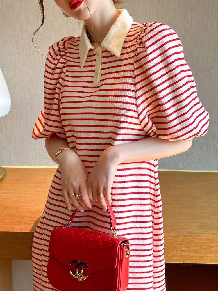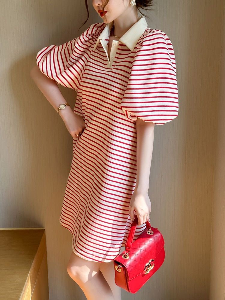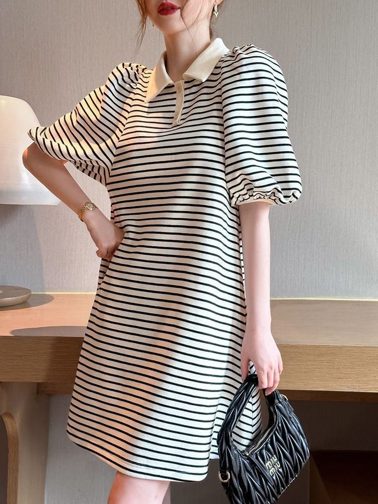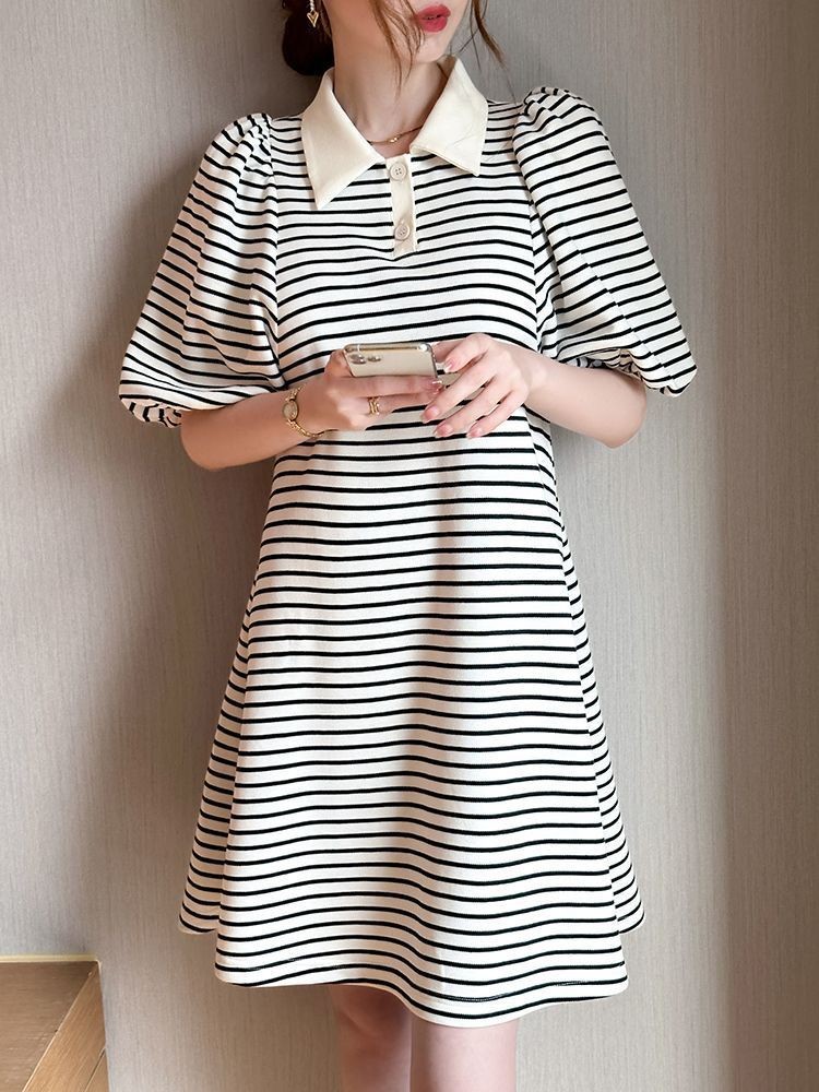 ชุดเดรสคุณแม่ท้องแขนพองลายทาง 2025 คอโปโลผ้าฝ้ายใส่หลวมกระชับสัดส่วน