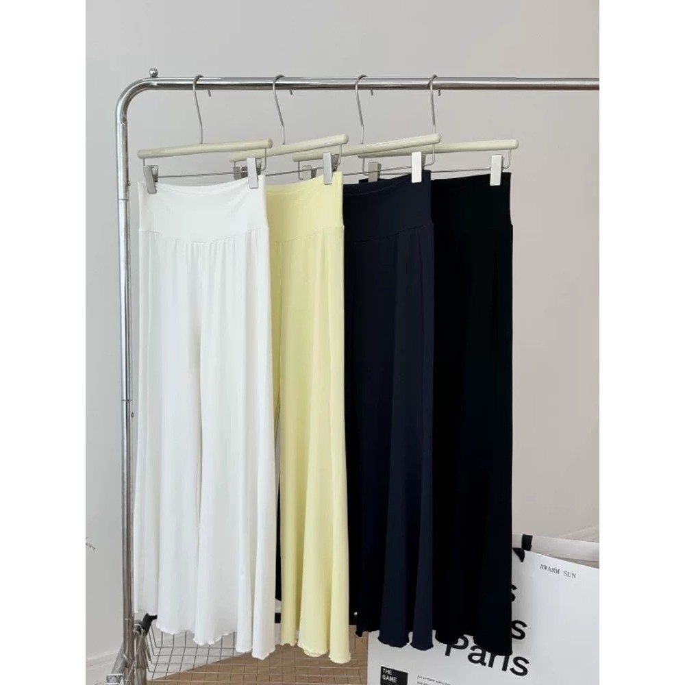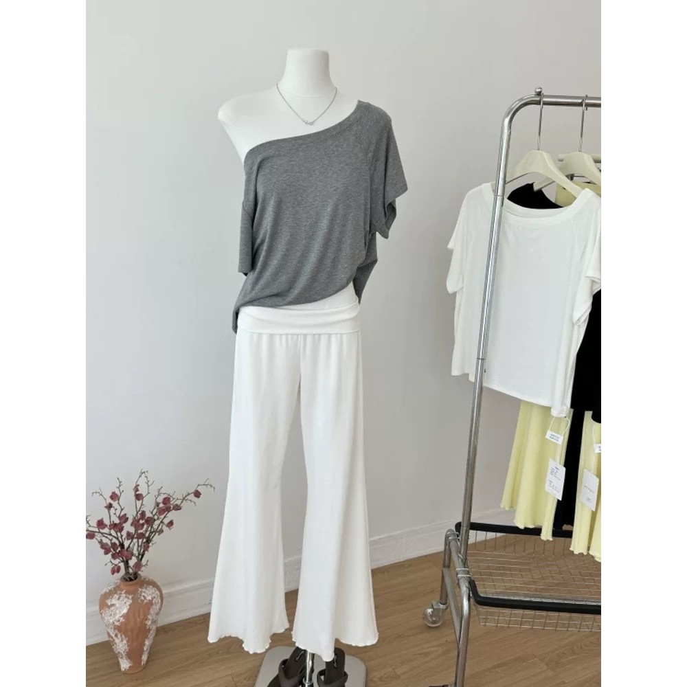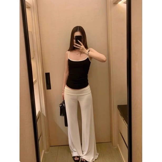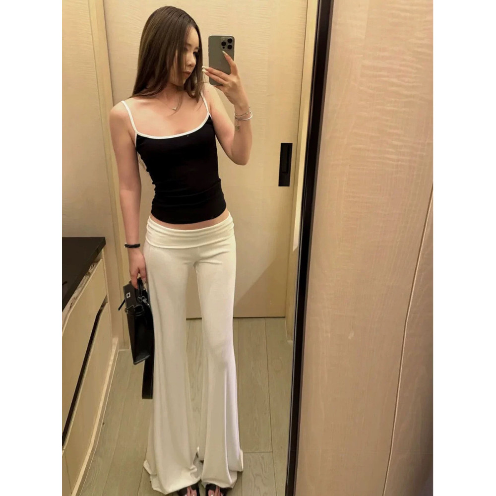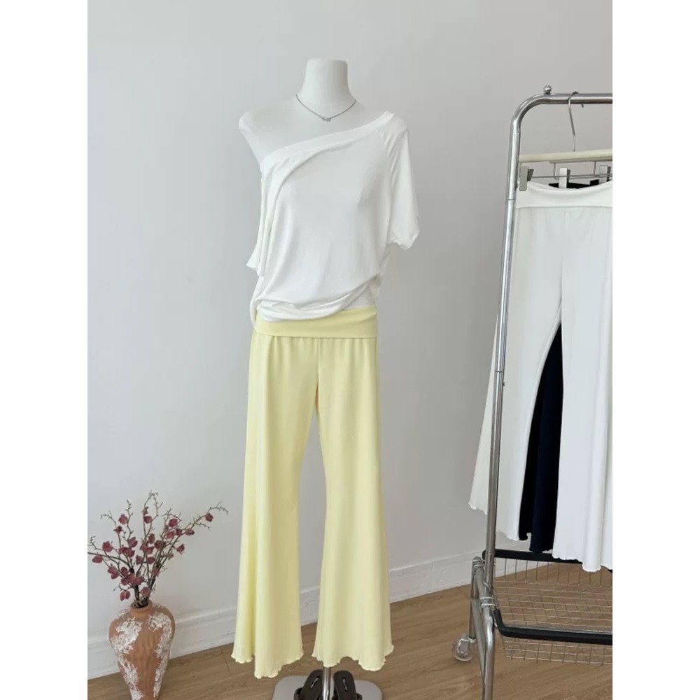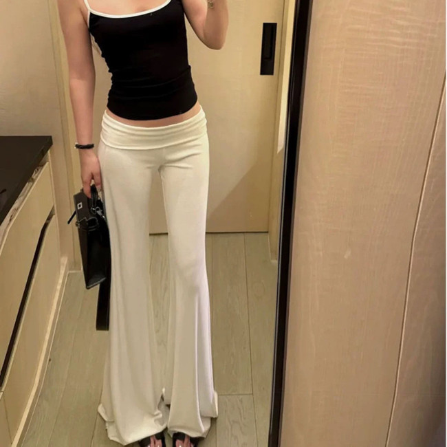 D0723 ฤดูใบไม้ผลิฤดูร้อน Slim-fit Slimmer ดูสบายๆกางเกงพับเอวออกแบบที่ไม่ซ้ํากัน Micro-Flared ชั้น-Mopping กางเกงสีทึบ Moisture-Absorbing สวมใส่ด้านนอกผอมสูงเอว Flared กางเกง