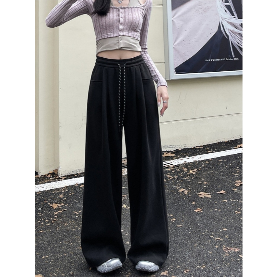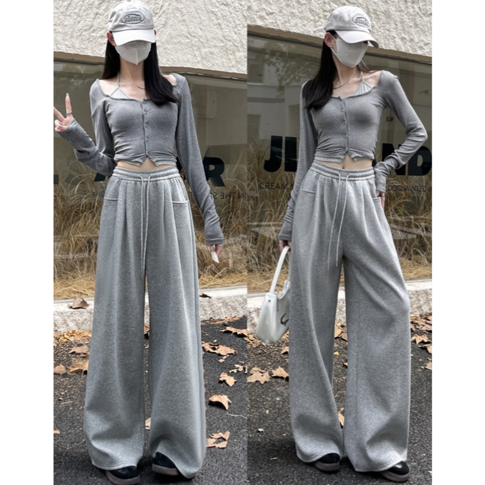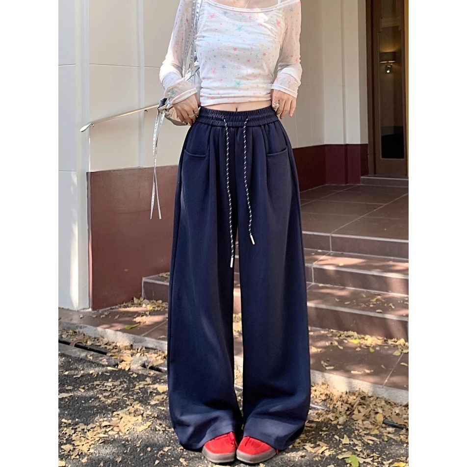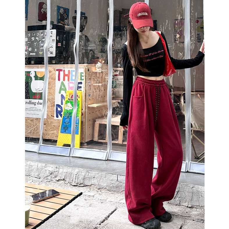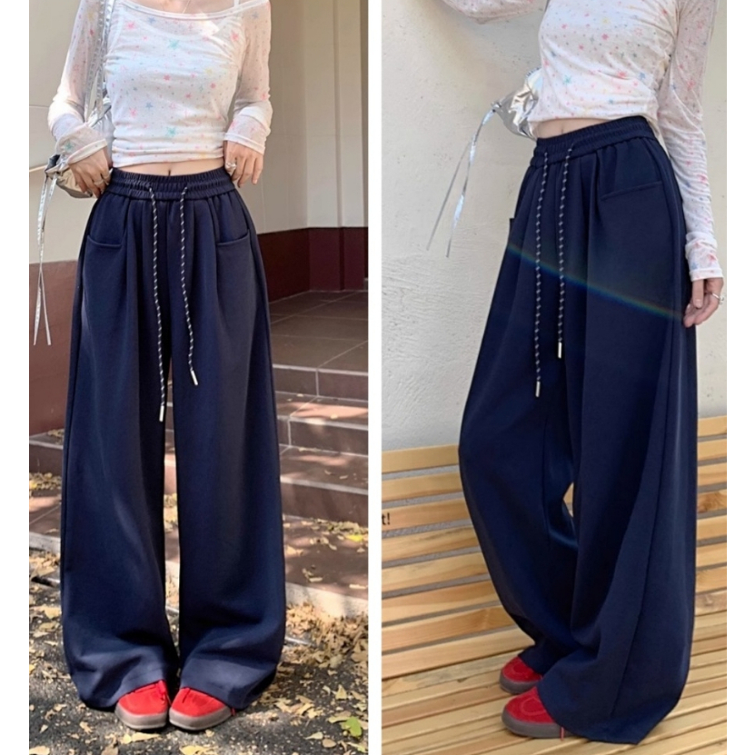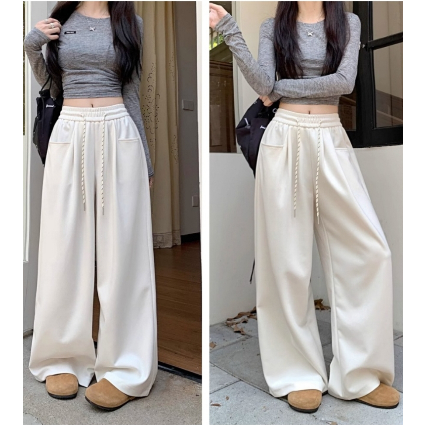 🤗กางเกงเอวสูงสไตล์เกาหลีผู้หญิง กางเกงขากว้าง กางเกงลำลอง ทรงหลวม มีเชือกผูก