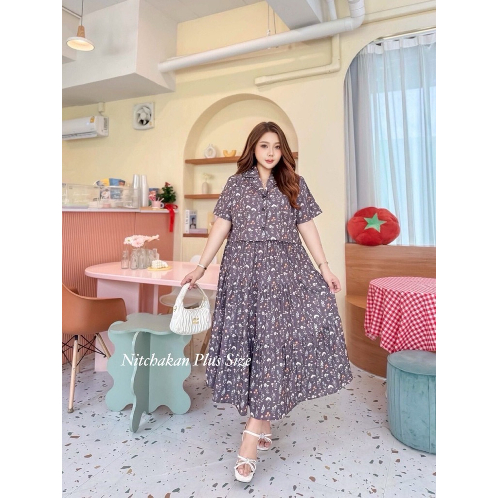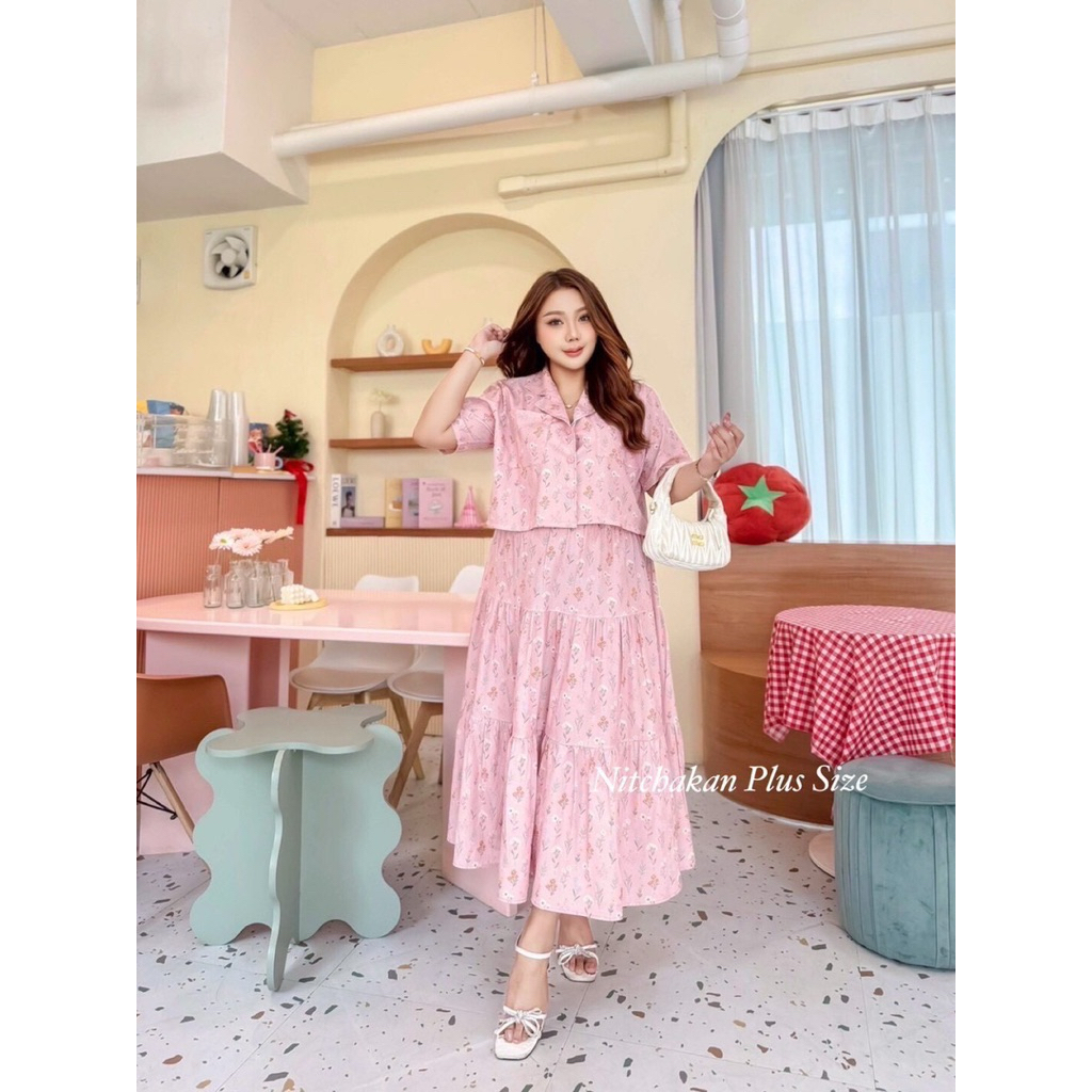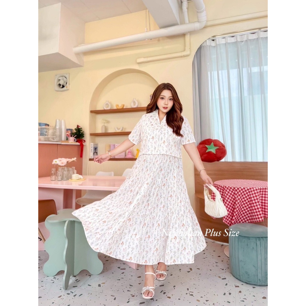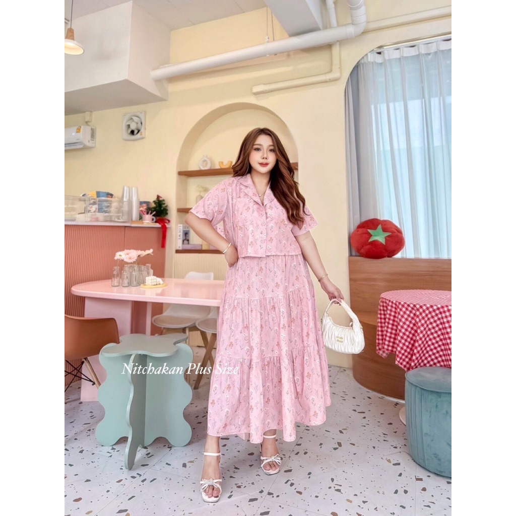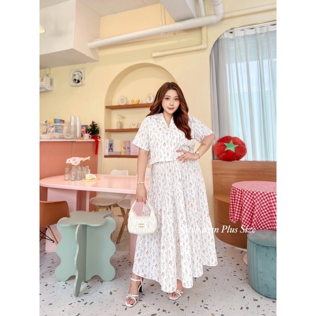 (NK) เซต2ชิ้น เสื้อครอปเชิ้ต+กระโปรงยาว ผ้าลายดอกไม้ น่ารัก ละมุนๆ สวยมาก (อก40-60”) เสื้อผ้าสาวอวบอ้วน ไซส์ใหญ่