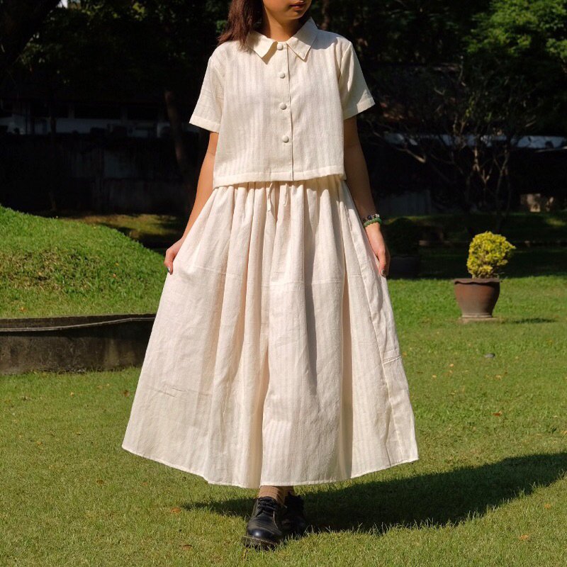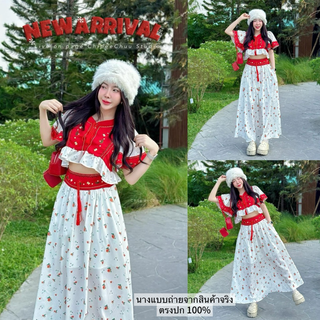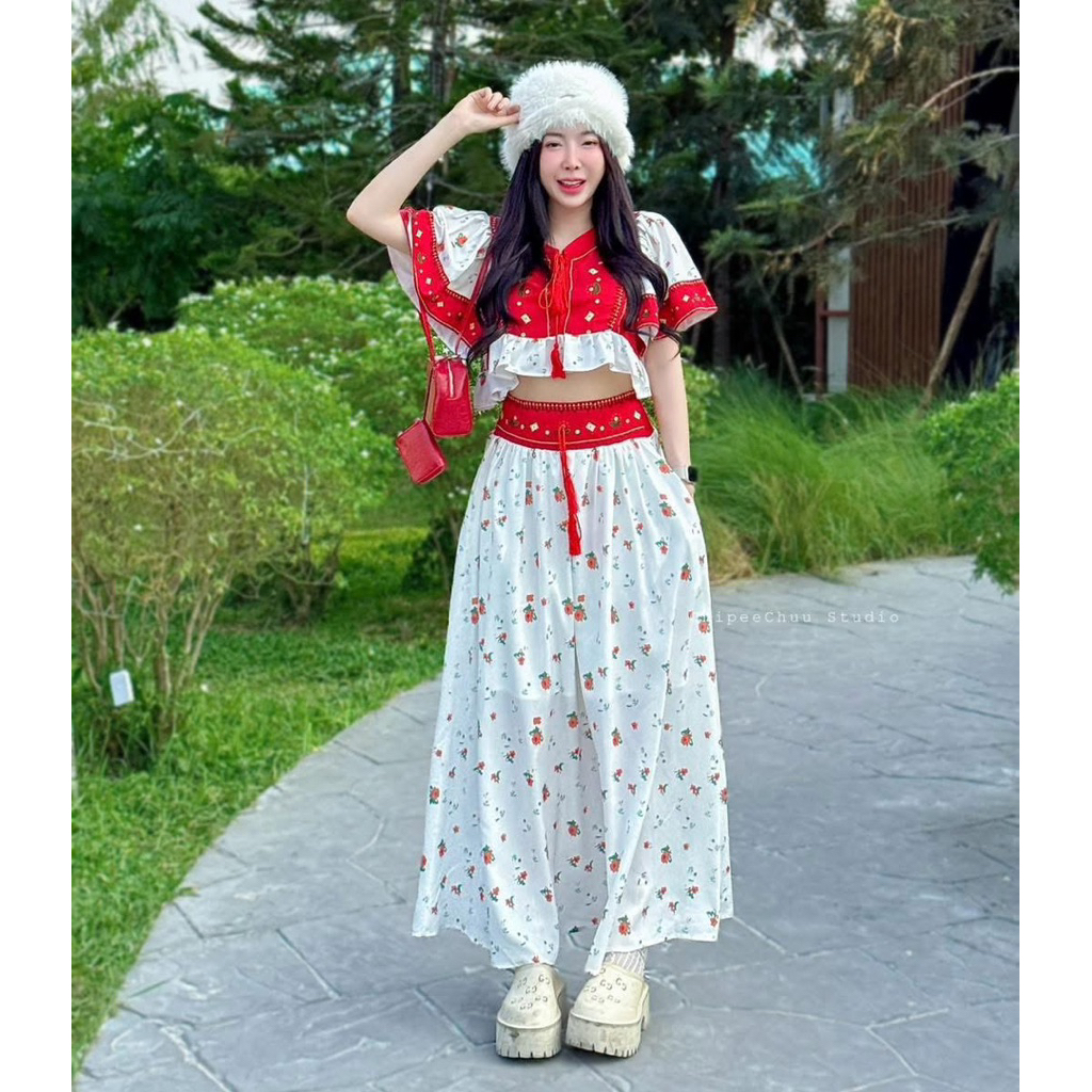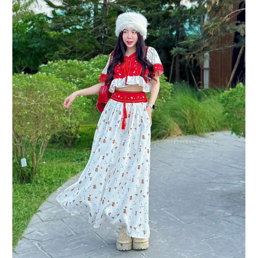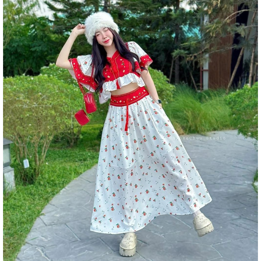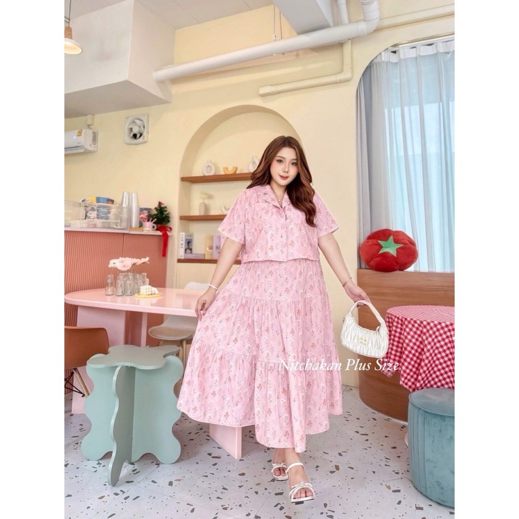 (NK) เซต2ชิ้น เสื้อครอปเชิ้ต+กระโปรงยาว ผ้าลายดอกไม้ น่ารัก ละมุนๆ สวยมาก (อก40-60”) เสื้อผ้าสาวอวบอ้วน ไซส์ใหญ่