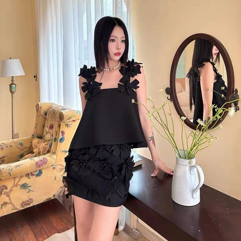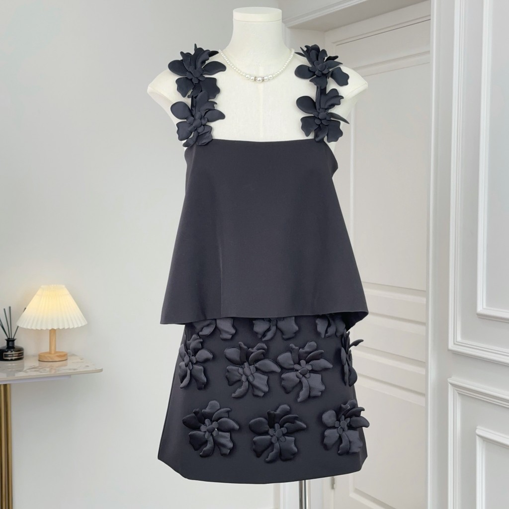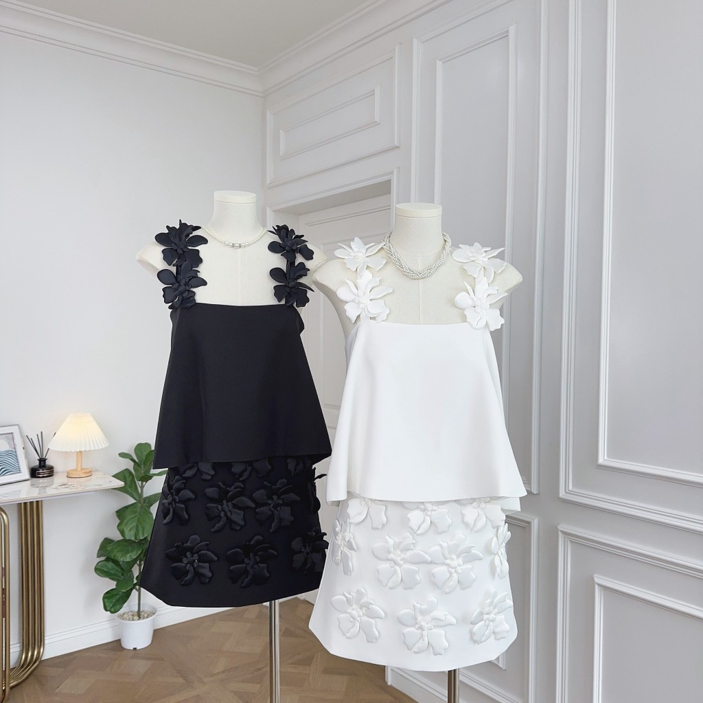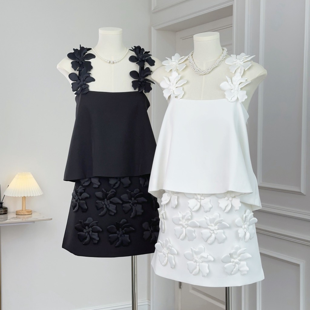 (พร้อมส่ง)รุ่น(GMGTO-เซตสายเดี่ยวดอกไม้สีดำ,สีขาว)ชุดเซ็ท(เสื้อ+กระโปรง)ผ้าซาติน ดีเทลปักดอกไม้สามมิติสายเดี่ยว