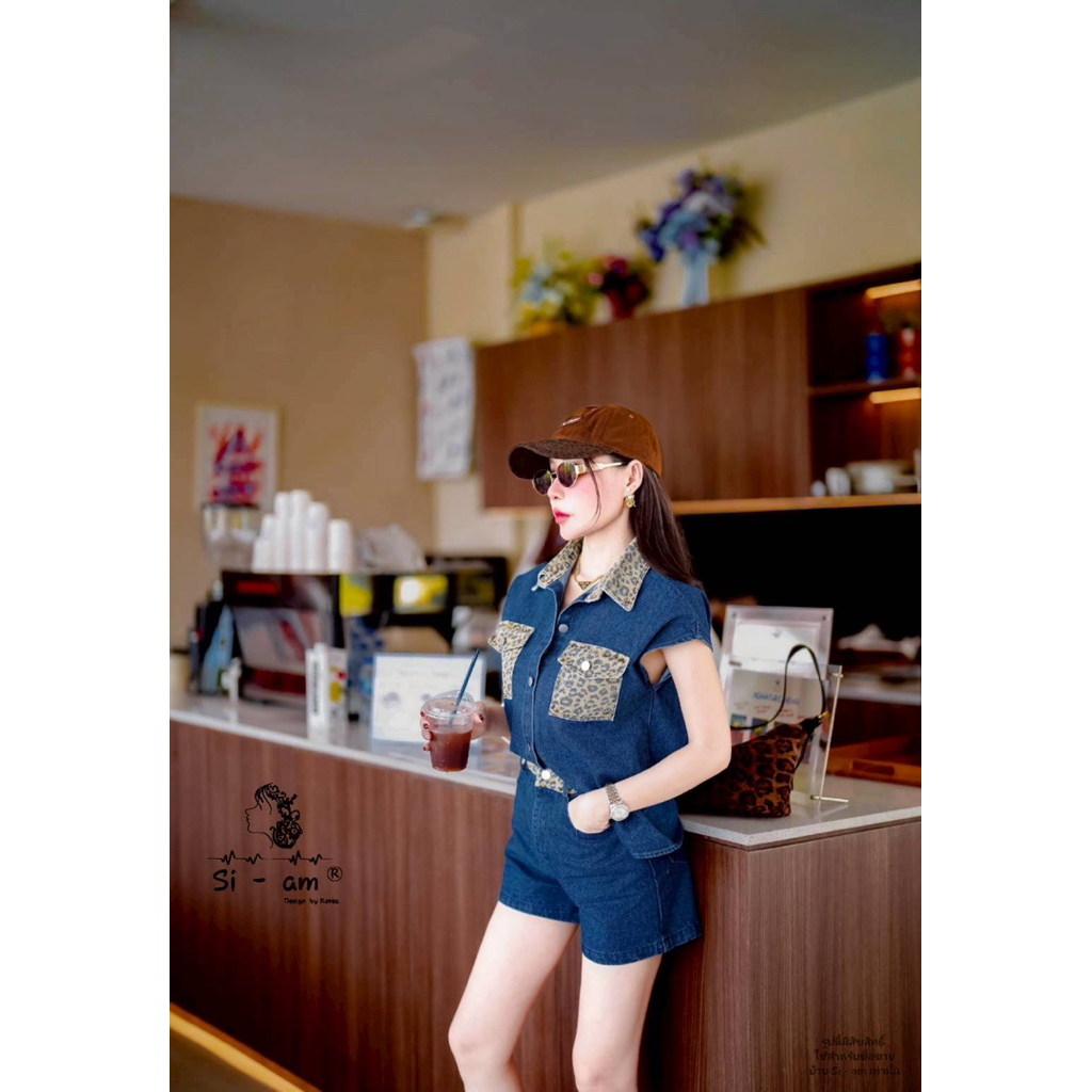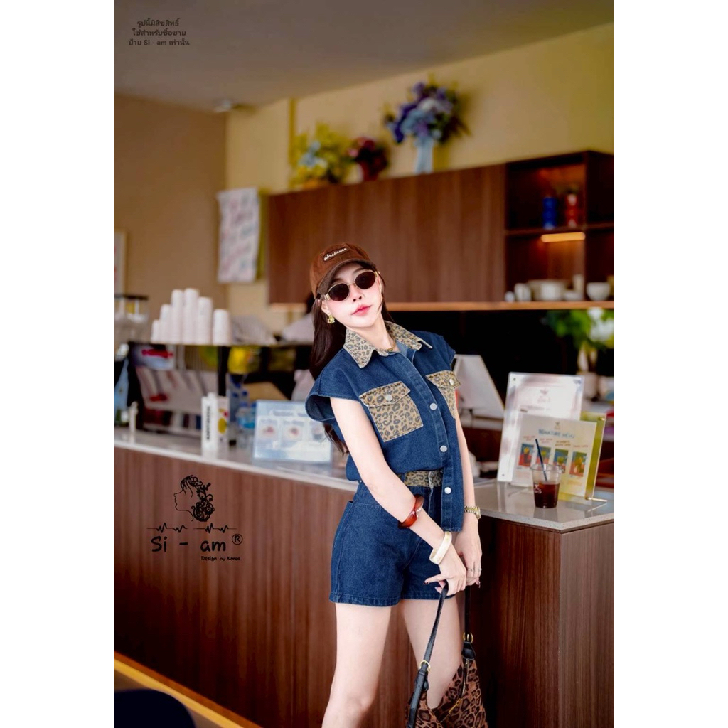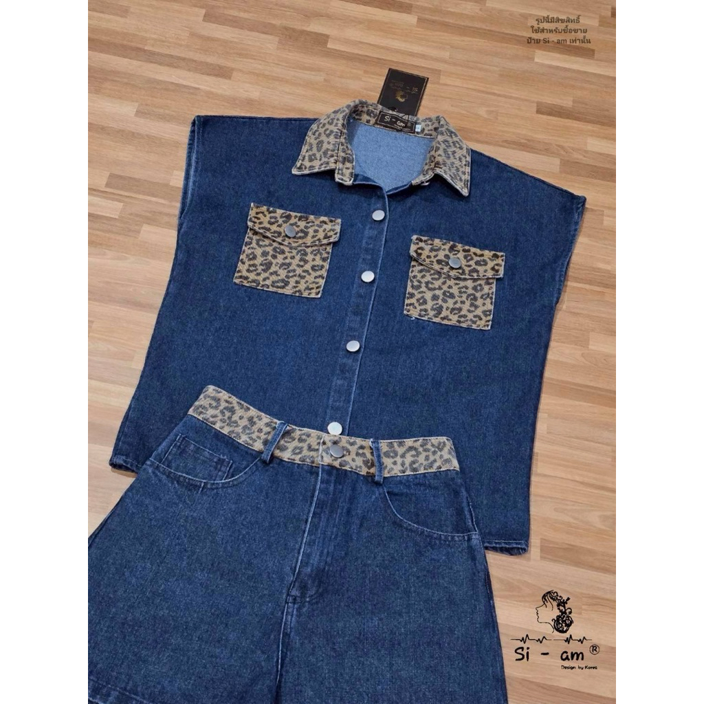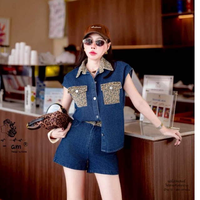 (s,l) ชุดยีนส์ เสื้อแขนกุด โอเวอร์ไซส์+กางเกงขาสั้น แต่ง ลายเสือ งานป้าย si-am