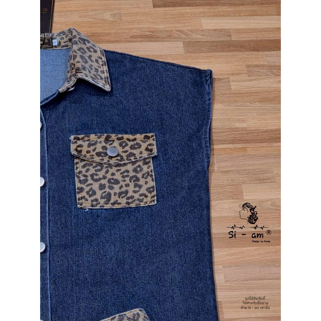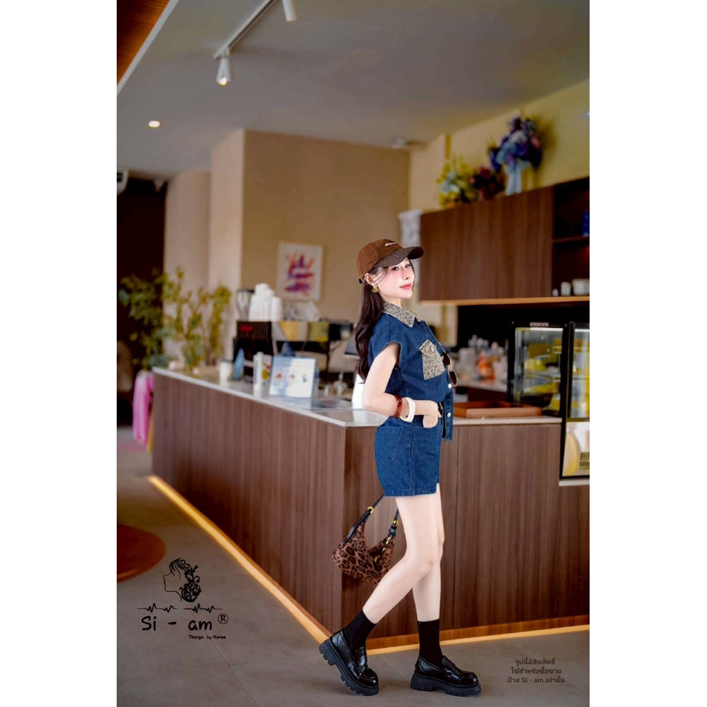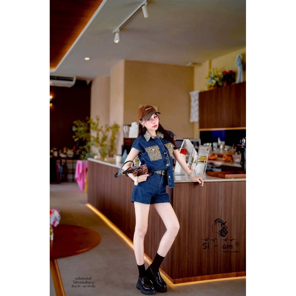 (s,l) ชุดยีนส์ เสื้อแขนกุด โอเวอร์ไซส์+กางเกงขาสั้น แต่ง ลายเสือ งานป้าย si-am