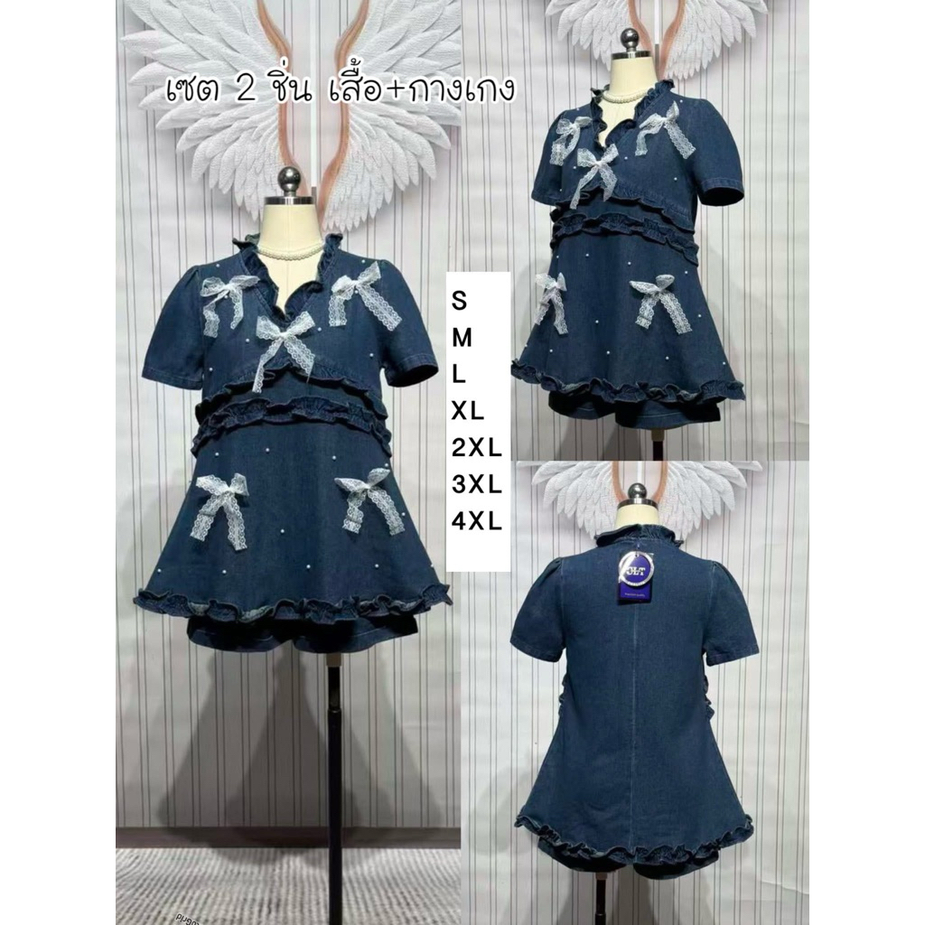 (❤️เอวเล็ก เพิ่มไซส์❤️) ชุดยีนส์ ปักมุก เสื้อตัวยาวปักมุก+กางเกงขาสั้น งานป้าย chalita