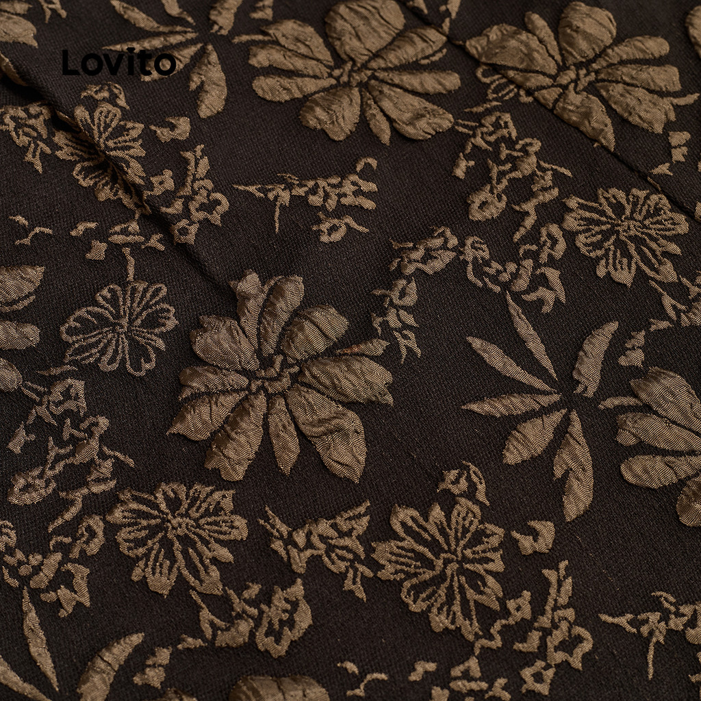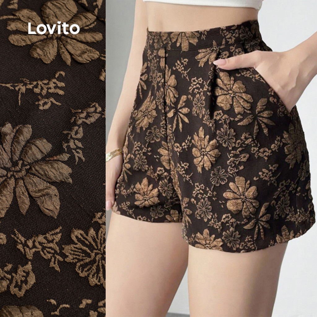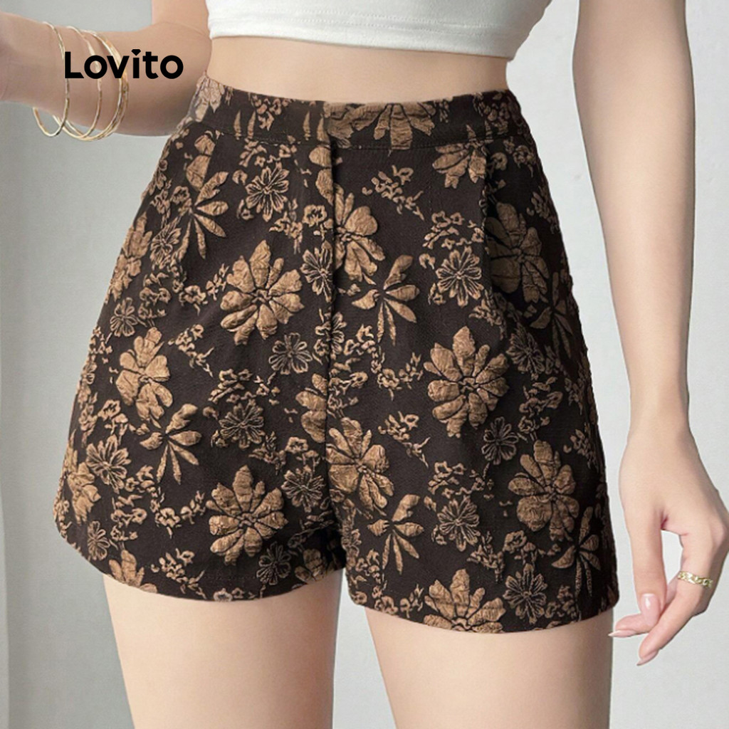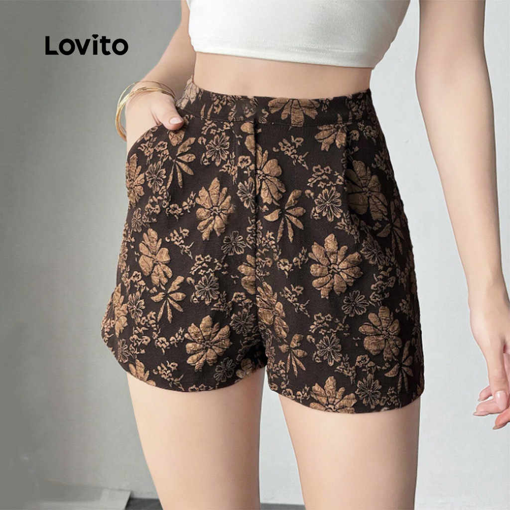 (New) Lovito กางเกงขาสั้นแบบโบฮีซิปกระเป๋า ลายฤดูใบไม้ผลิ/ฤดูร้อน สีน้ำตาล สำหรับผู้หญิง L142ED142