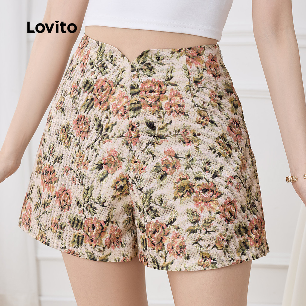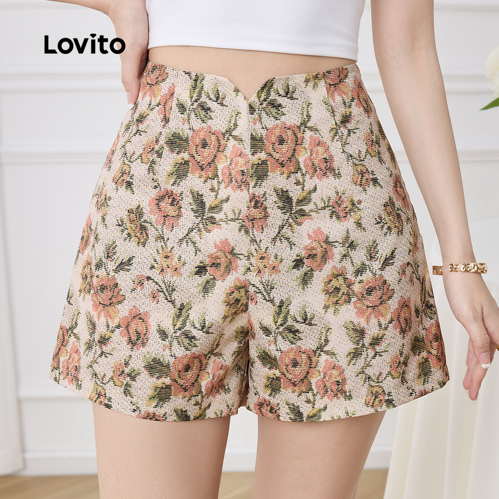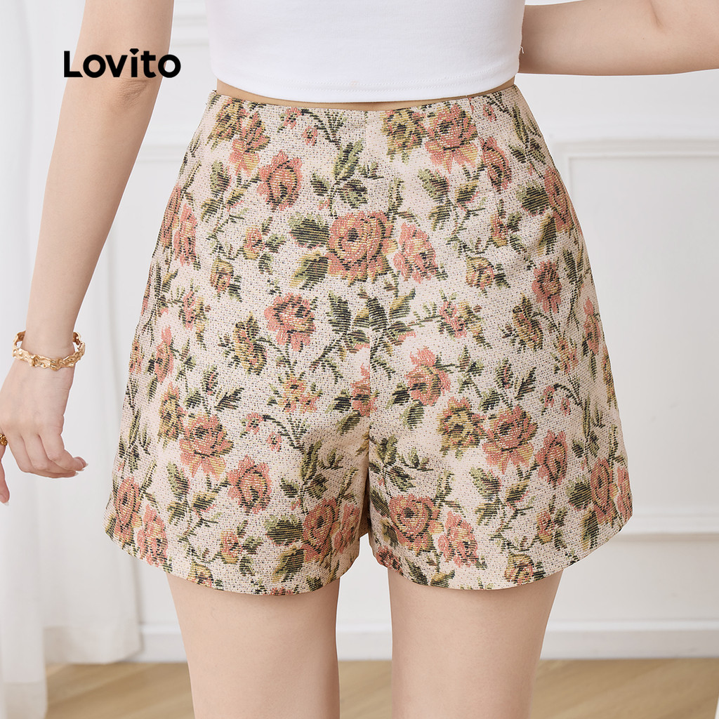 (New) Lovito กางเกงขาสั้นโบฮ์ลายดอกไม้ย้อนยุคสำหรับผู้หญิงบ็อกซ์ถุงเท้าขายาวหญิง L143ED569