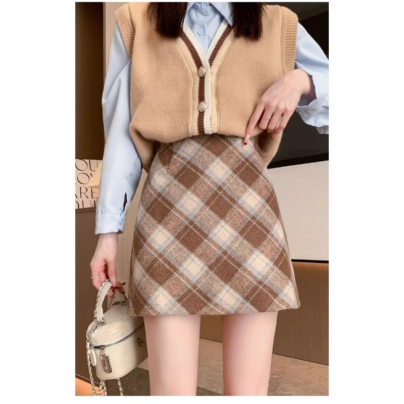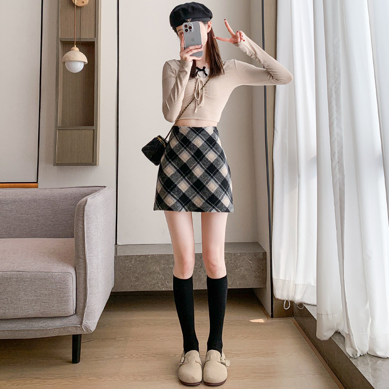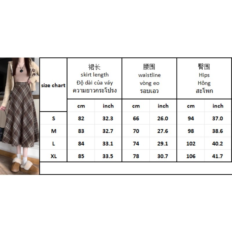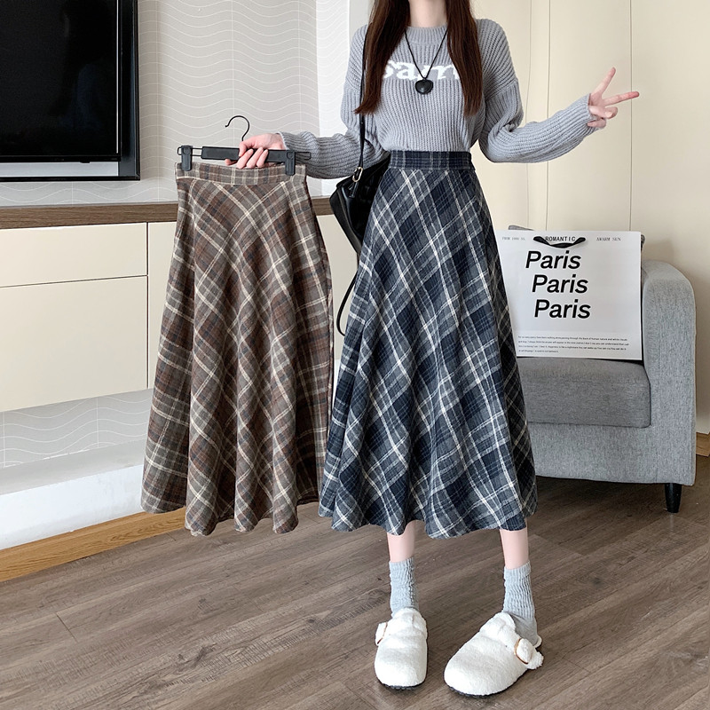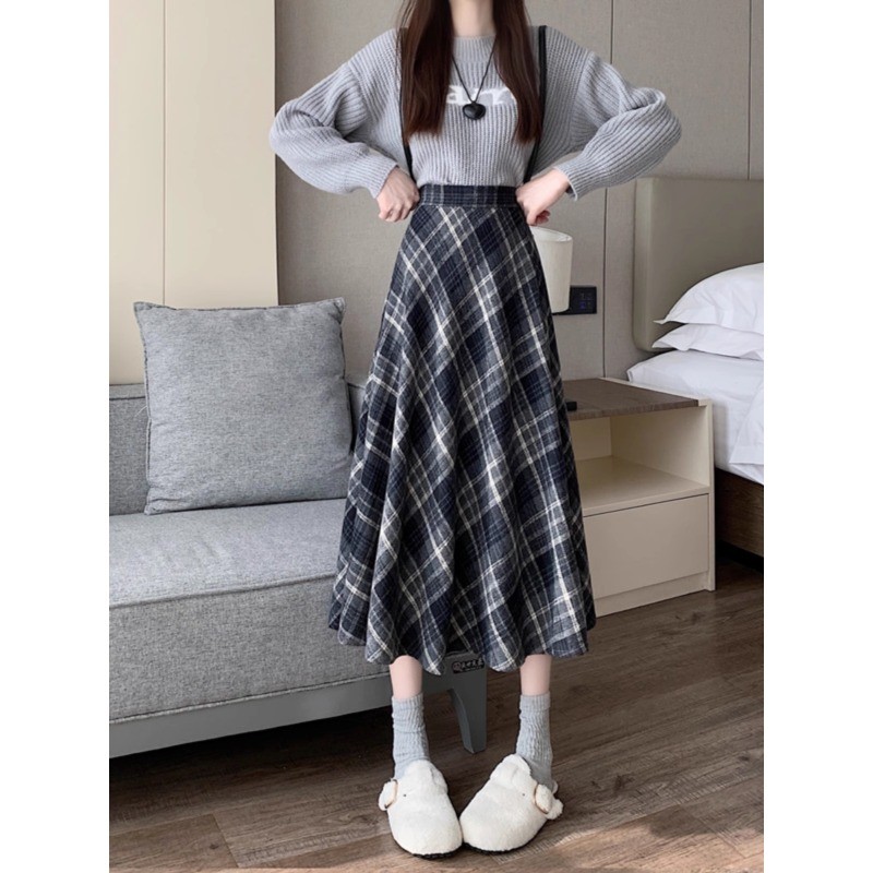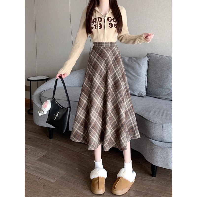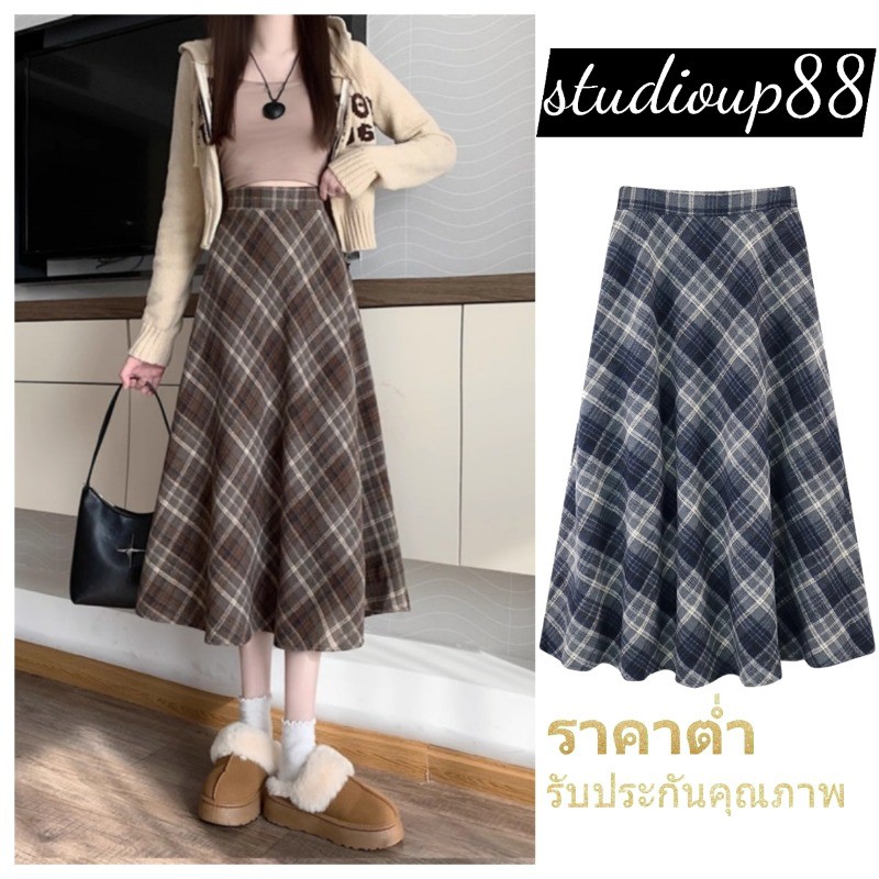 (ส่งจากไทย)กระโปรงยาว ผ้าสักหลาด ลายสก็อต ผ้านุ่ม สไตล์เกาหลี สำหรับสตรี ดีเทลซิปรูดด้านหลัง