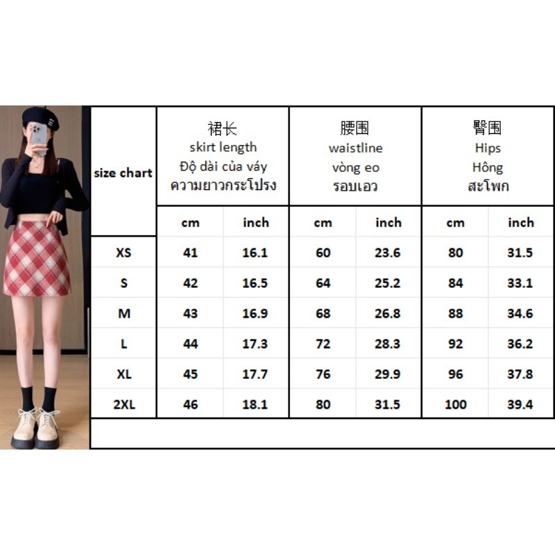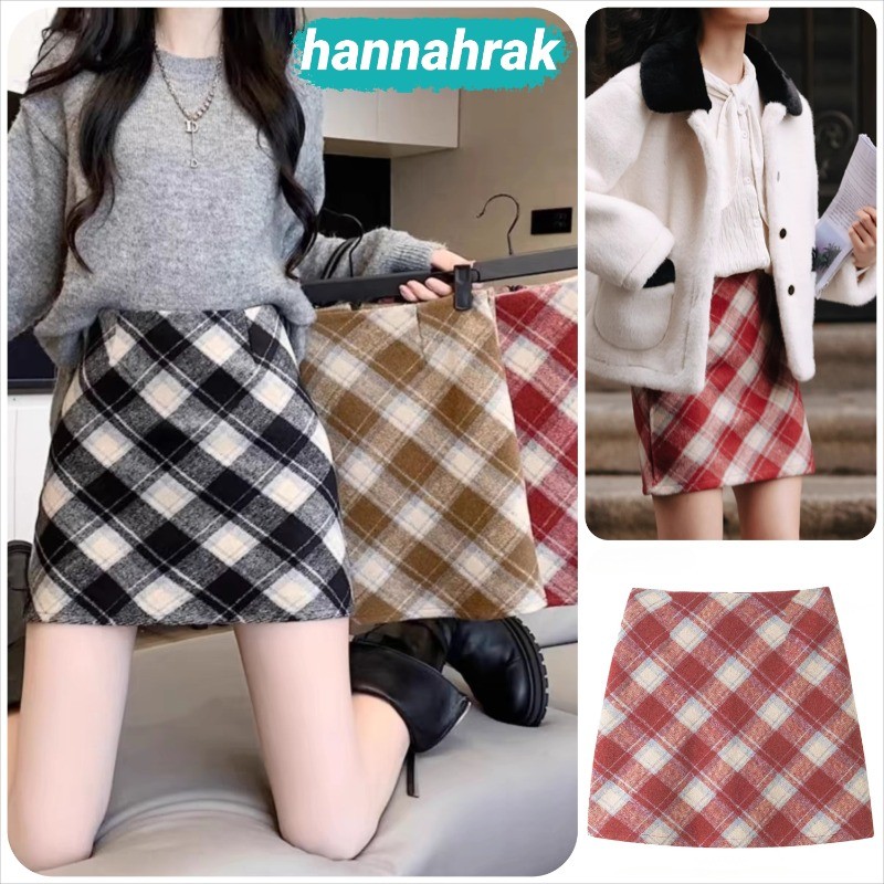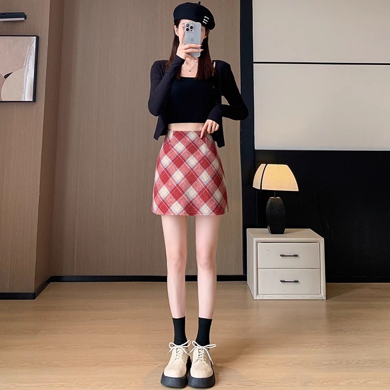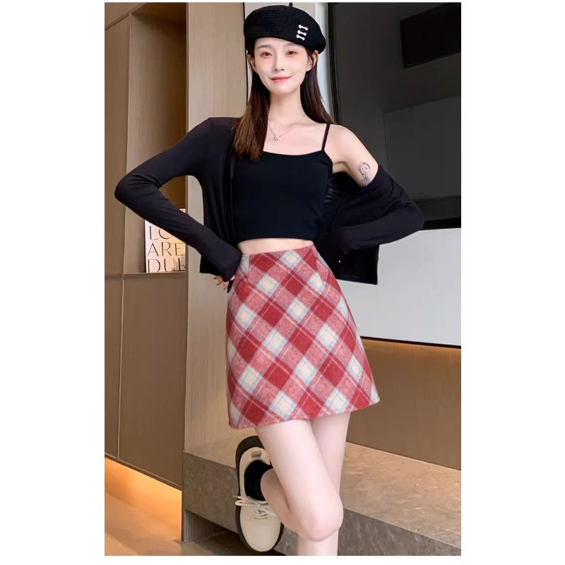 (ส่งจากกรุงเทพฯ)กระโปรง เอวสูง ลายสก๊อต สีแดง ผ้าไหมพรมหนา มีซับด้านใน ดีเทลซิปรูดด้านหลัง สไตล์เกาหลี สําหรับผู้หญิง