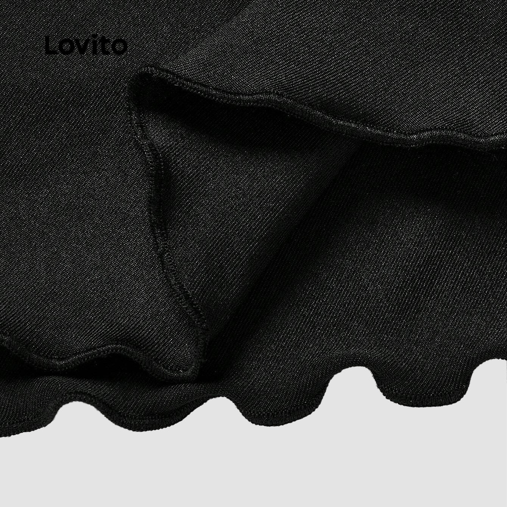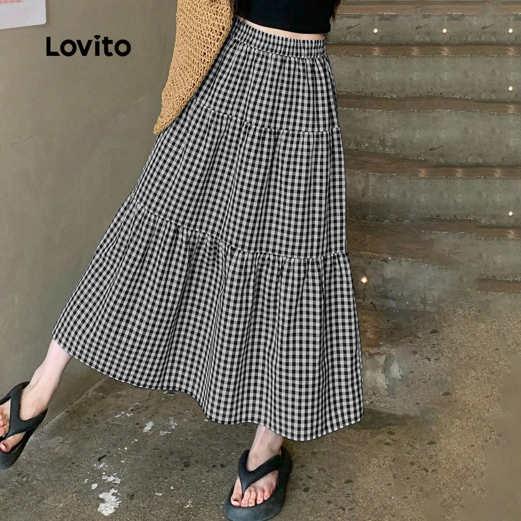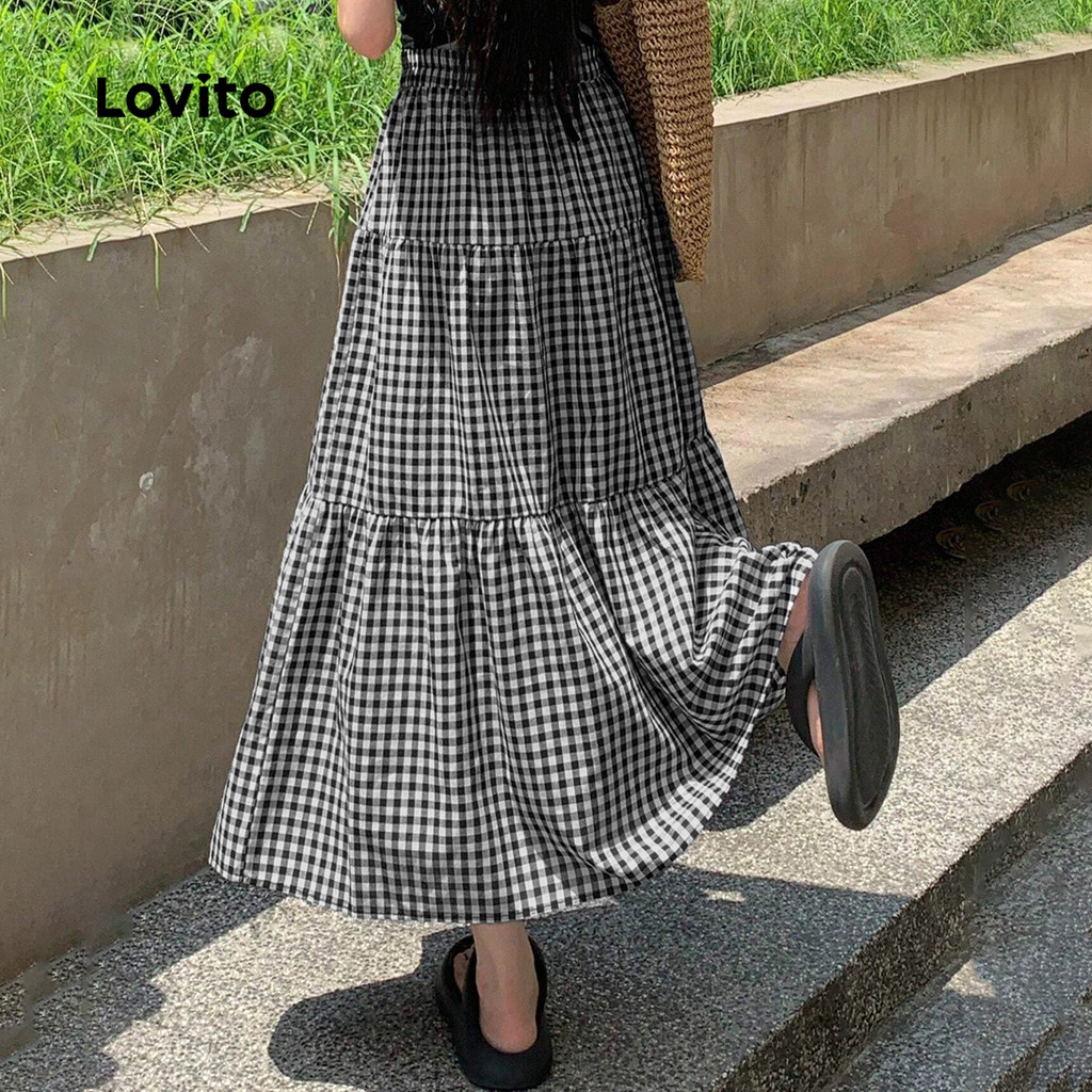 (New) Lovito กระโปรงแคชชวล ชั้น ๆ สำหรับฤดูใบไม้ผลิ/ฤดูร้อน สีดำและขาว สำหรับผู้หญิง L149LD012