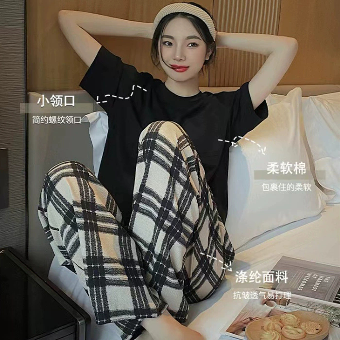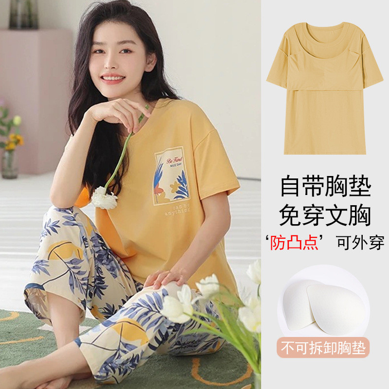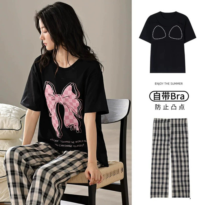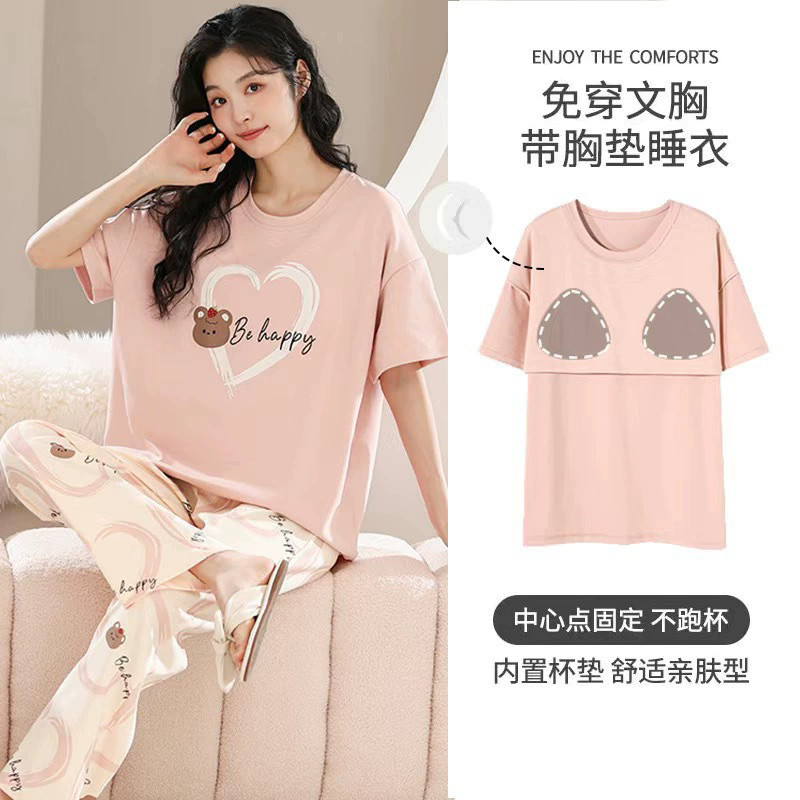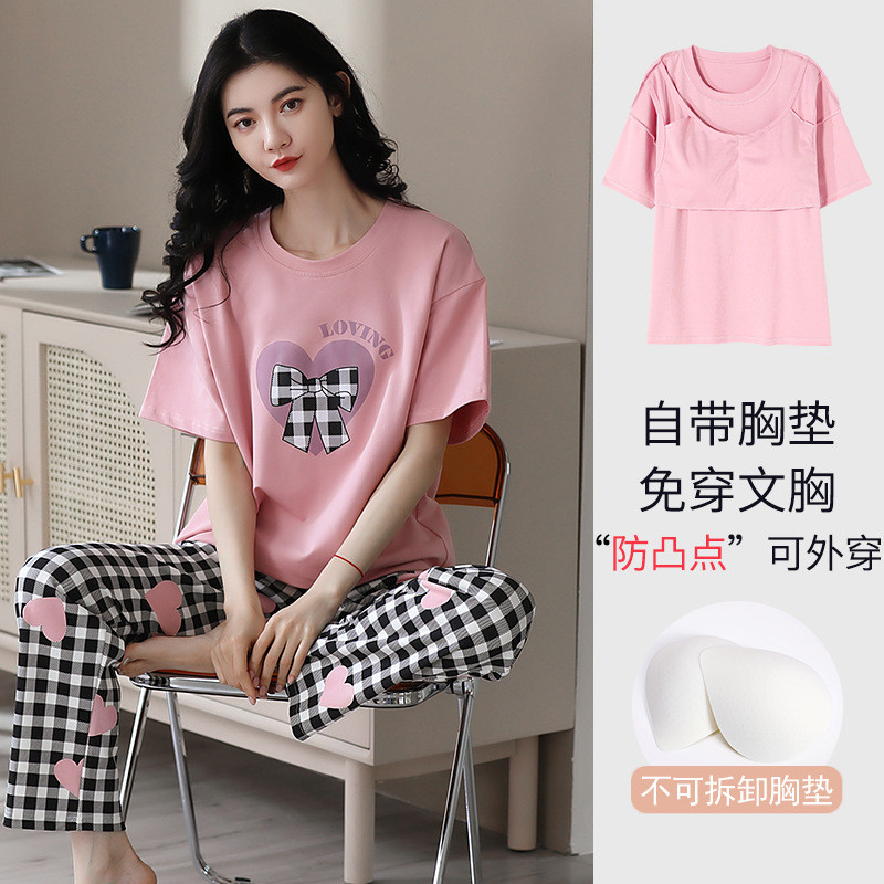 ผู้หญิงสองชิ้นชุด Bra Pad ชุดนอนแขนสั้นสบายๆกางเกงชุดนอน Plus ขนาดเสื้อสวมหัว Homewear