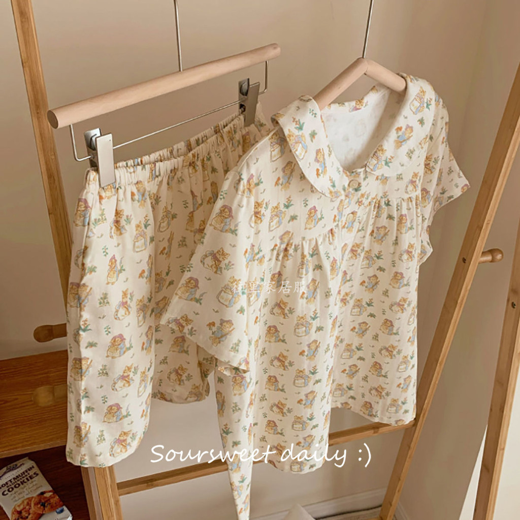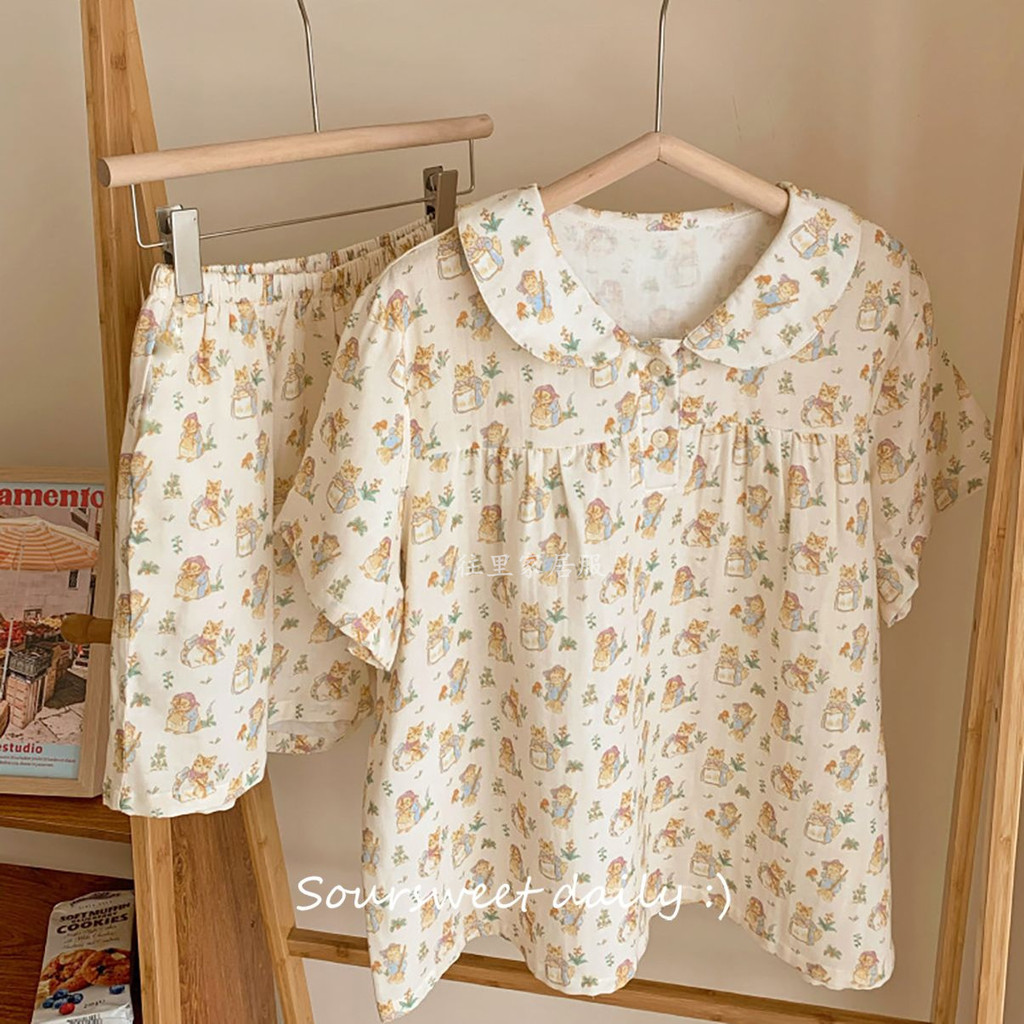 สีเขียวสุนัขชุดนอนผ้าฝ้ายผู้หญิงฤดูร้อนคาร์ดิแกนลําลองกางเกงขาสั้นแขนสั้นนักเรียน ชุดบ้าน สูทการ์ตูนน่ารัก