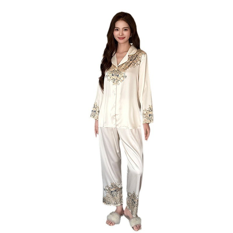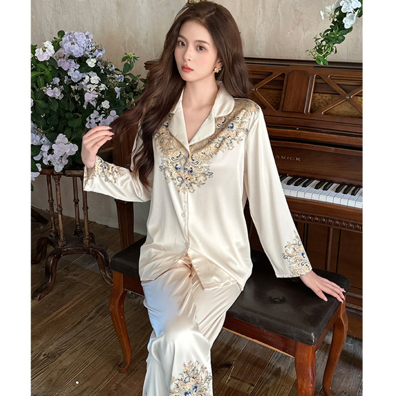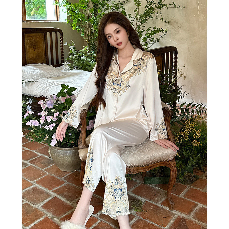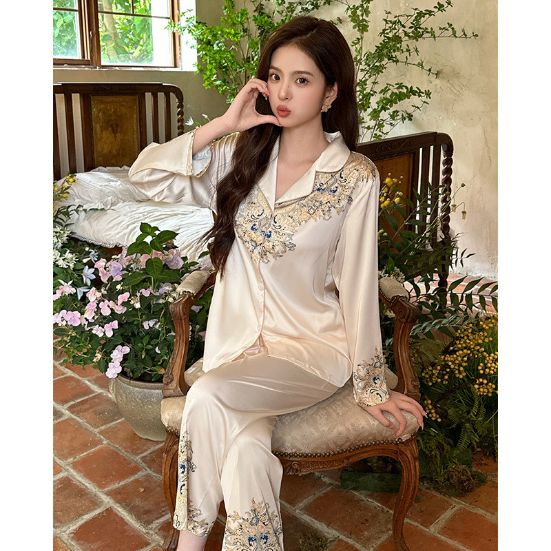 ดอกไม้พิมพ์แสงหรูหราชุดนอนสตรีแขนยาวชุดนอนผ้าไหมน้ําแข็ง