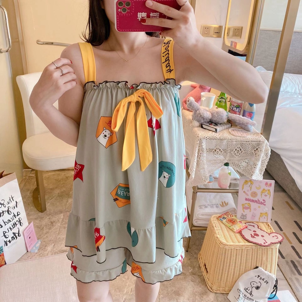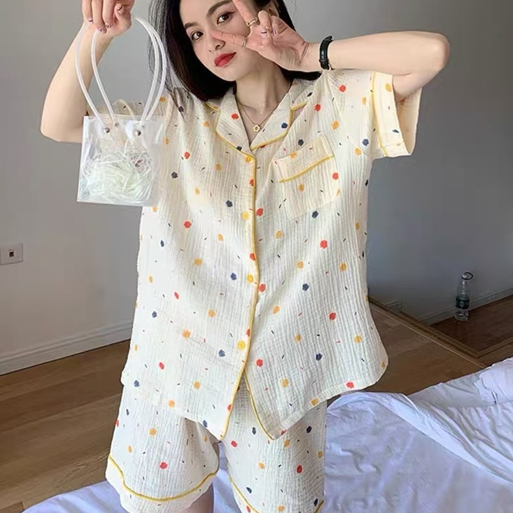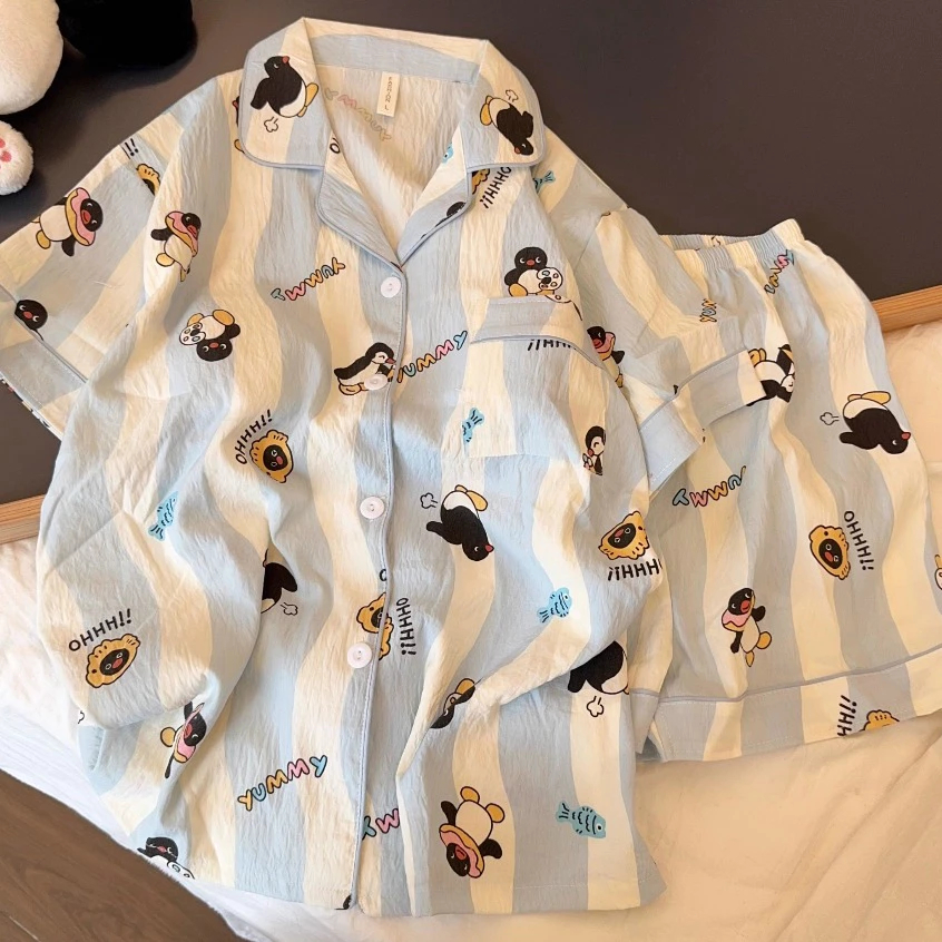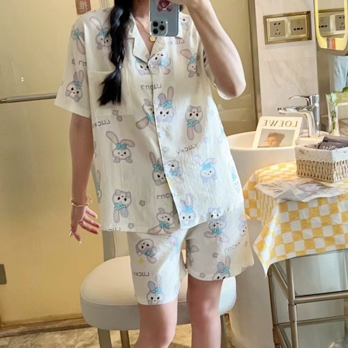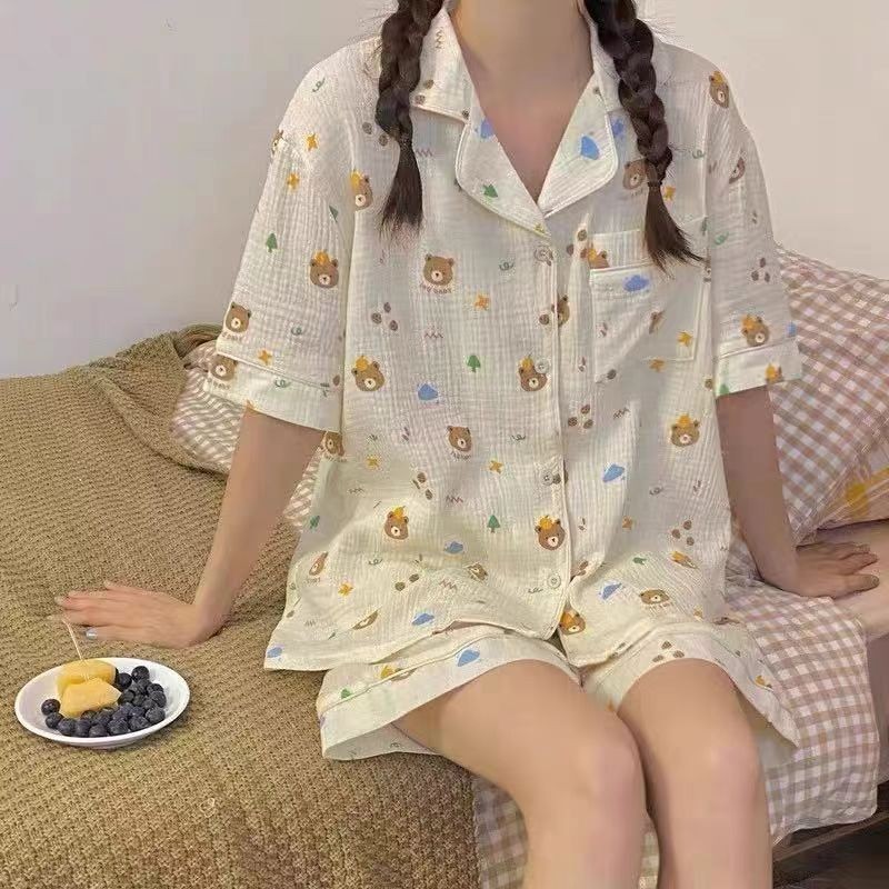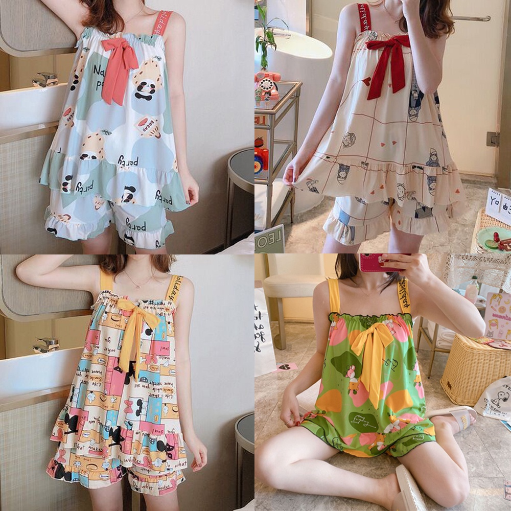 แขนสั้นผ้าฝ้ายชุดนอนผ้าไหมผู้หญิงฤดูร้อนบางชุดสองชิ้นนักเรียนพิมพ์หวานญี่ปุ่นผ้าไหมเทียม ชุดลําลอง