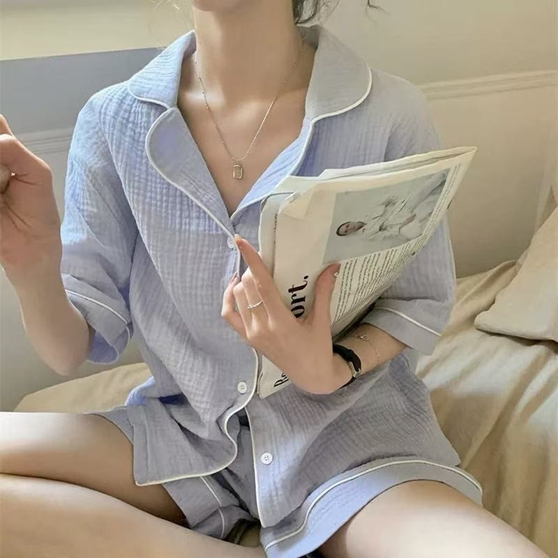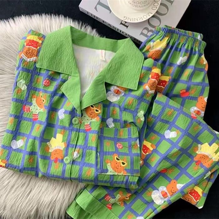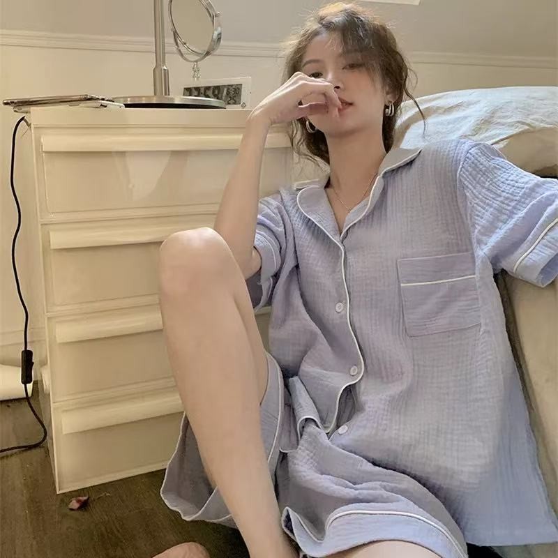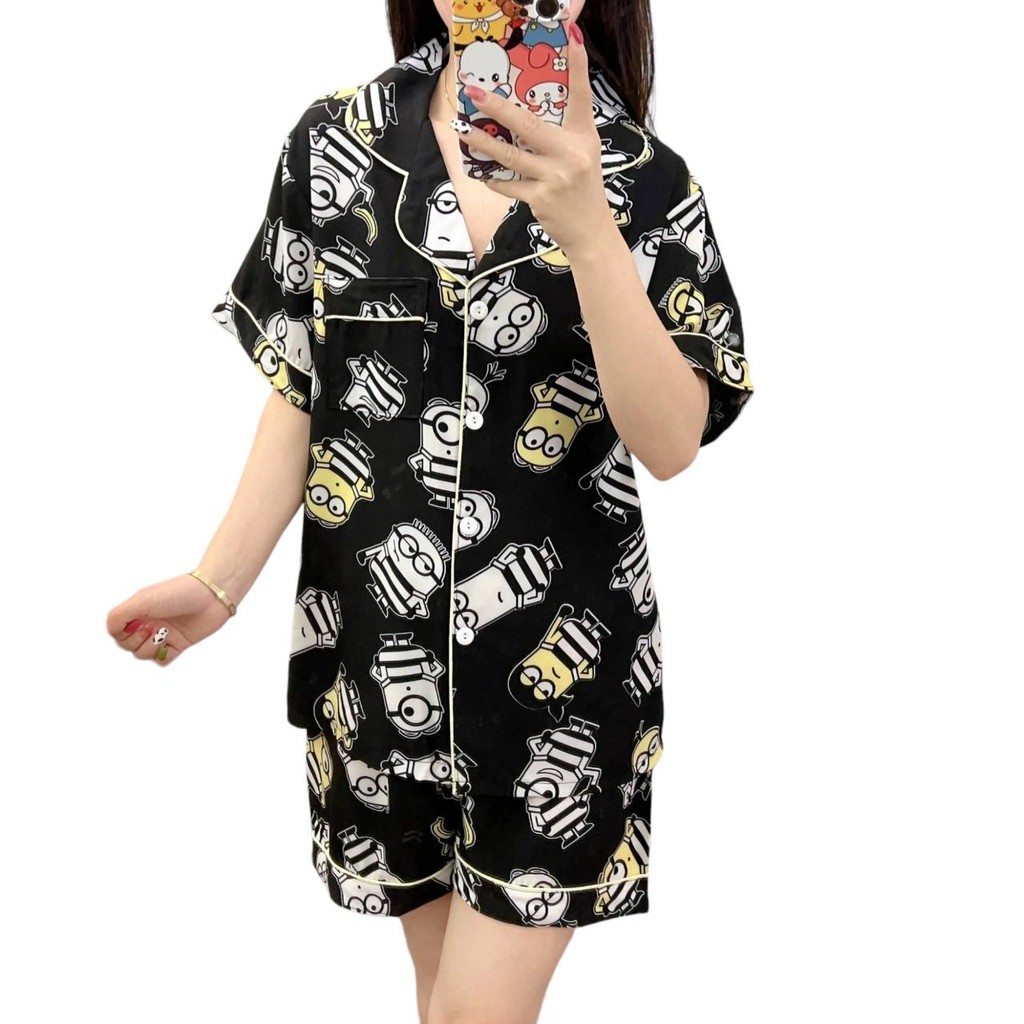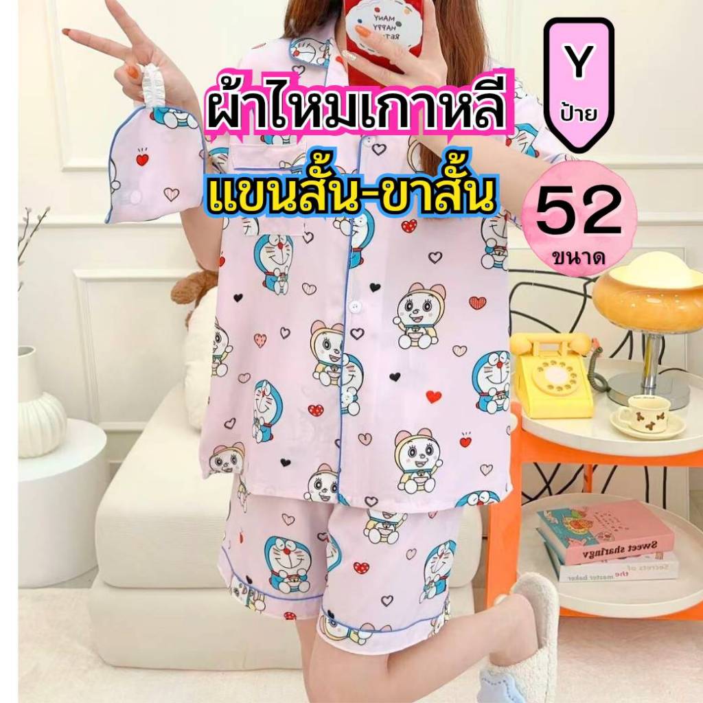 แขนสั้นผ้าฝ้ายชุดนอนผ้าไหมผู้หญิงฤดูร้อนบางชุดสองชิ้นนักเรียนพิมพ์หวานญี่ปุ่นผ้าไหมเทียม ชุดลําลอง