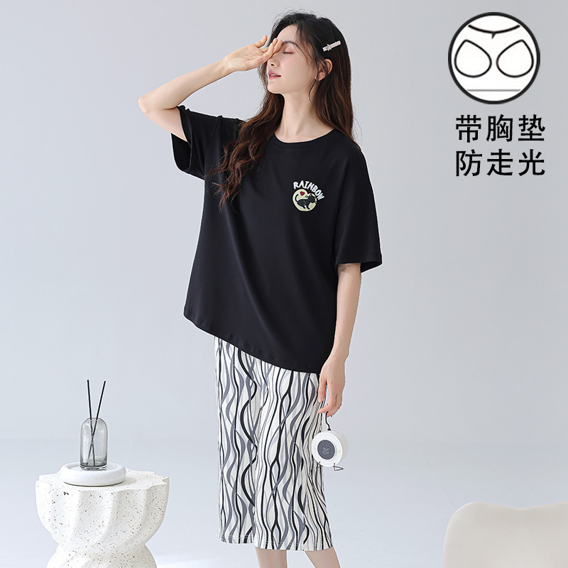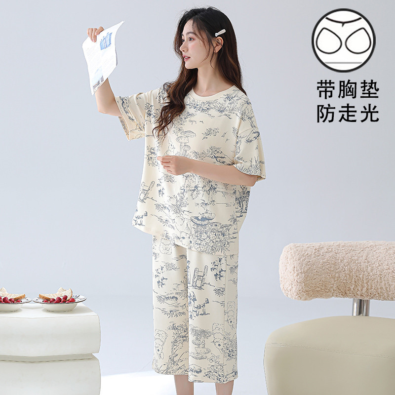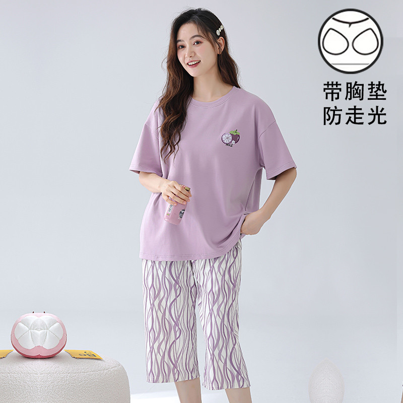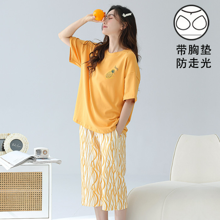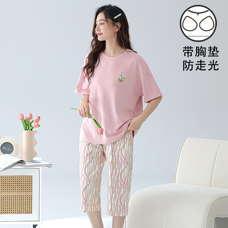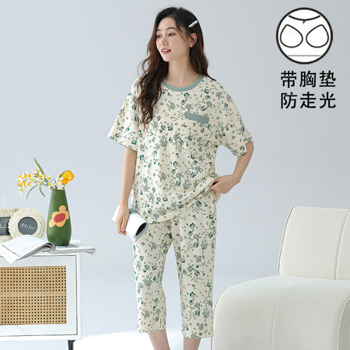 เบาะชุดนอนผู้หญิงชุดนอนผ้าฝ้ายชุดนอนชุดนอนผู้หญิงฤดูร้อน3/4ความยาวแขนสั้นกับแผ่นหน้าอก ชุดลําลอง