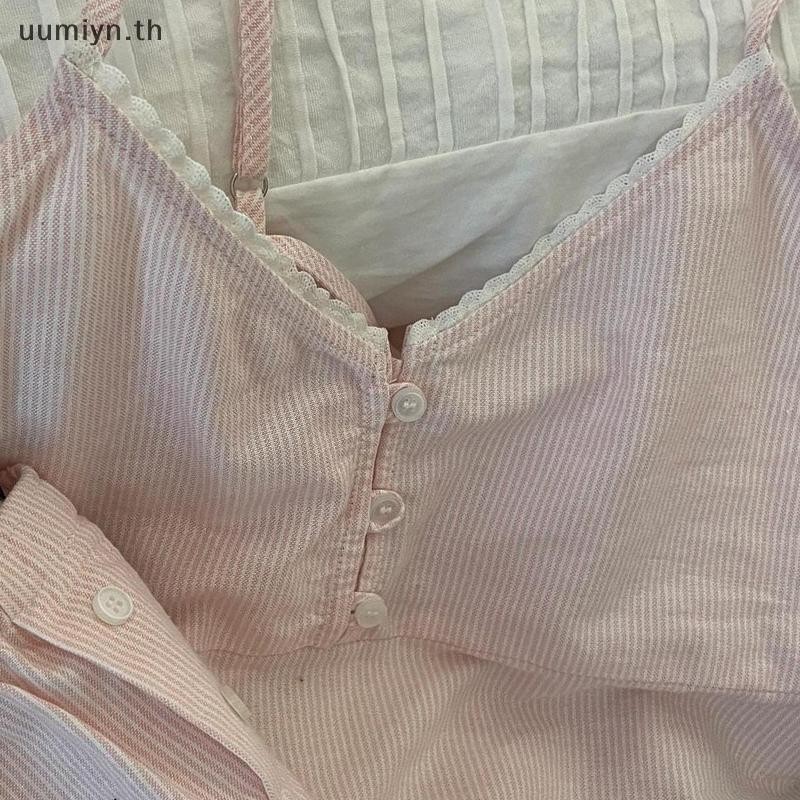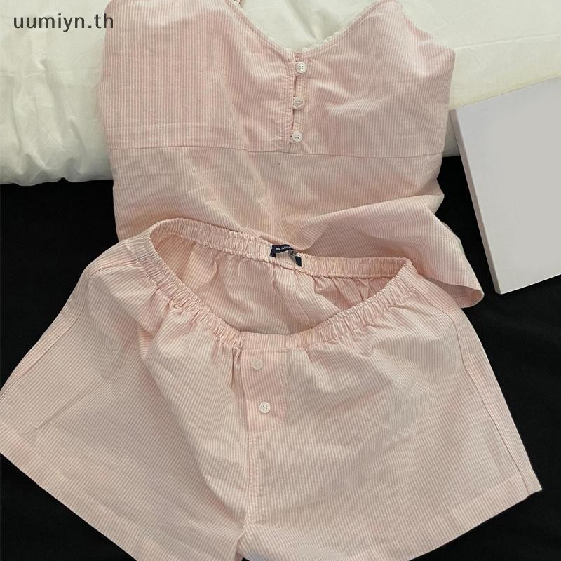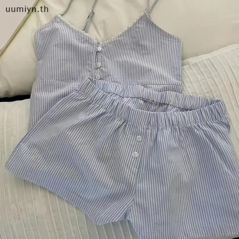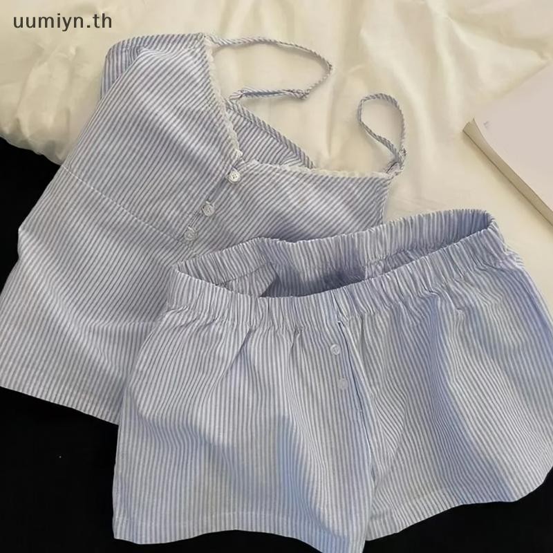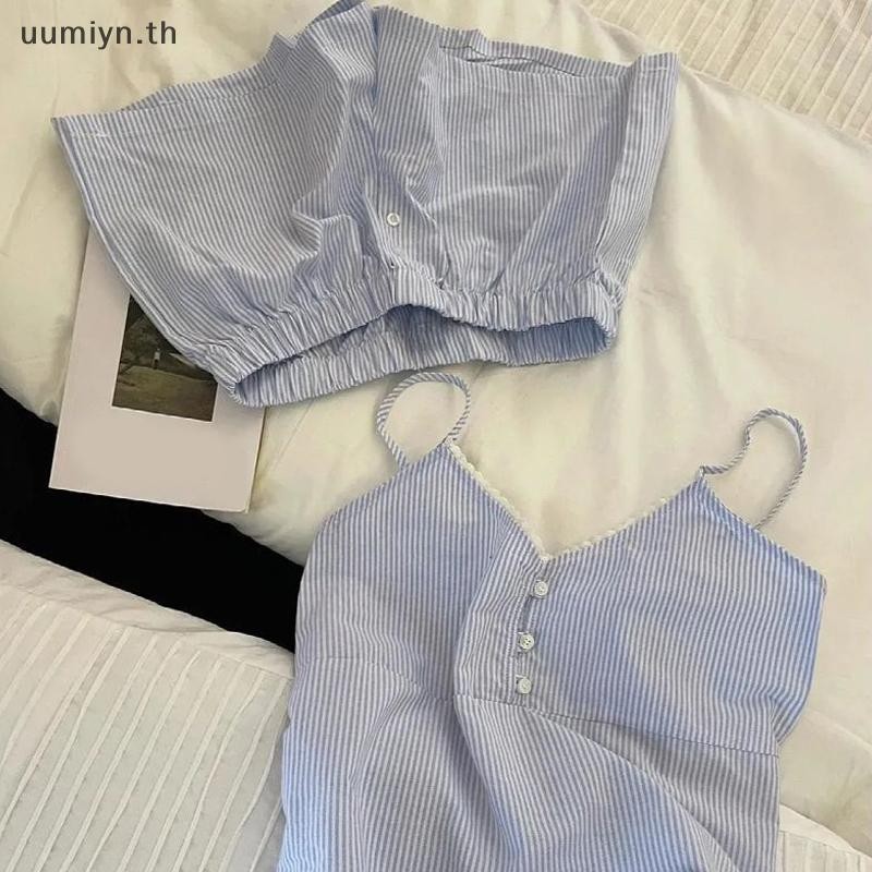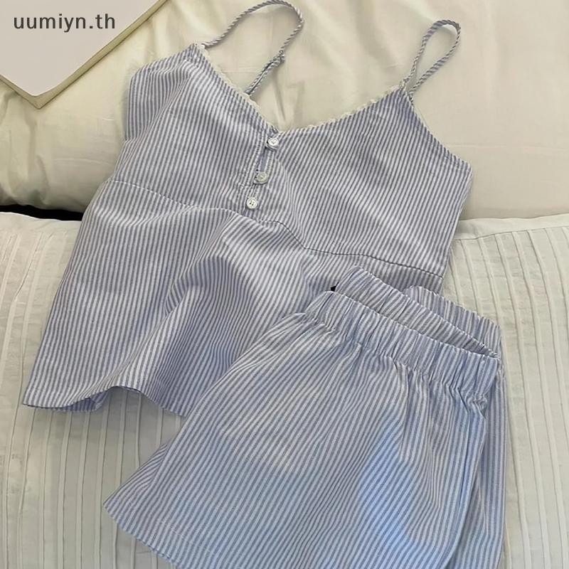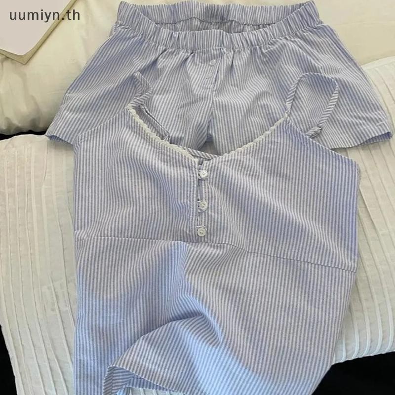 อูมิอิน แฟชั่นสบายๆหลวมสีฟ้าหวานลายบ้านเสื้อผ้าเสื้อกั๊กกางเกงขาสั้นชุดนอนชุด