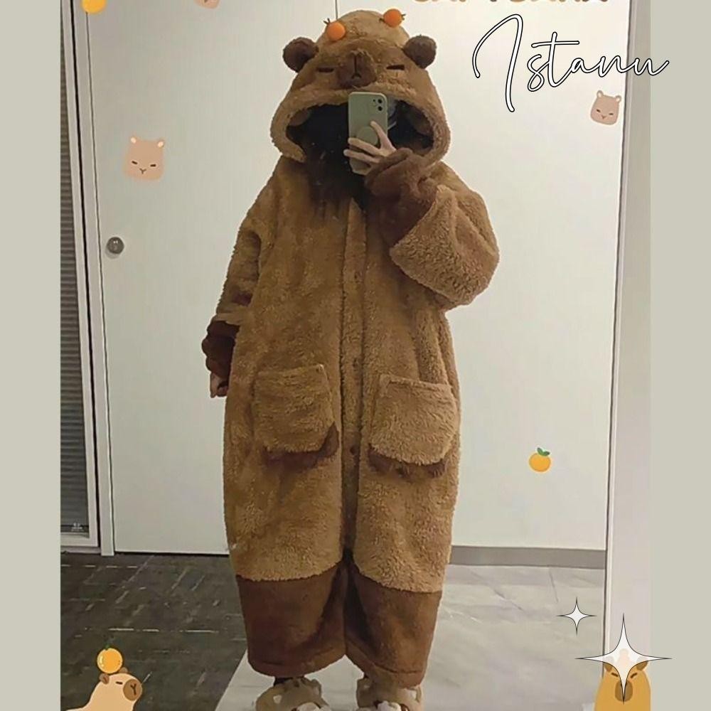 ชุดนอน ชุดนอน+กางเกง Capibara ที่อบอุ่น น่ารัก พร้อมคลิปสีส้ม ขนแกะปะการังฤดูหนาว เสื้อผ้าที่บ้านIstanu