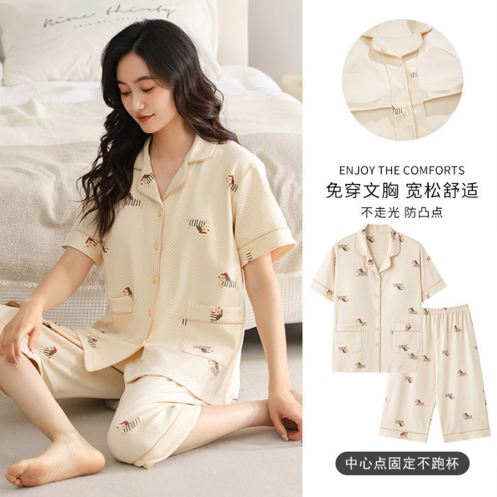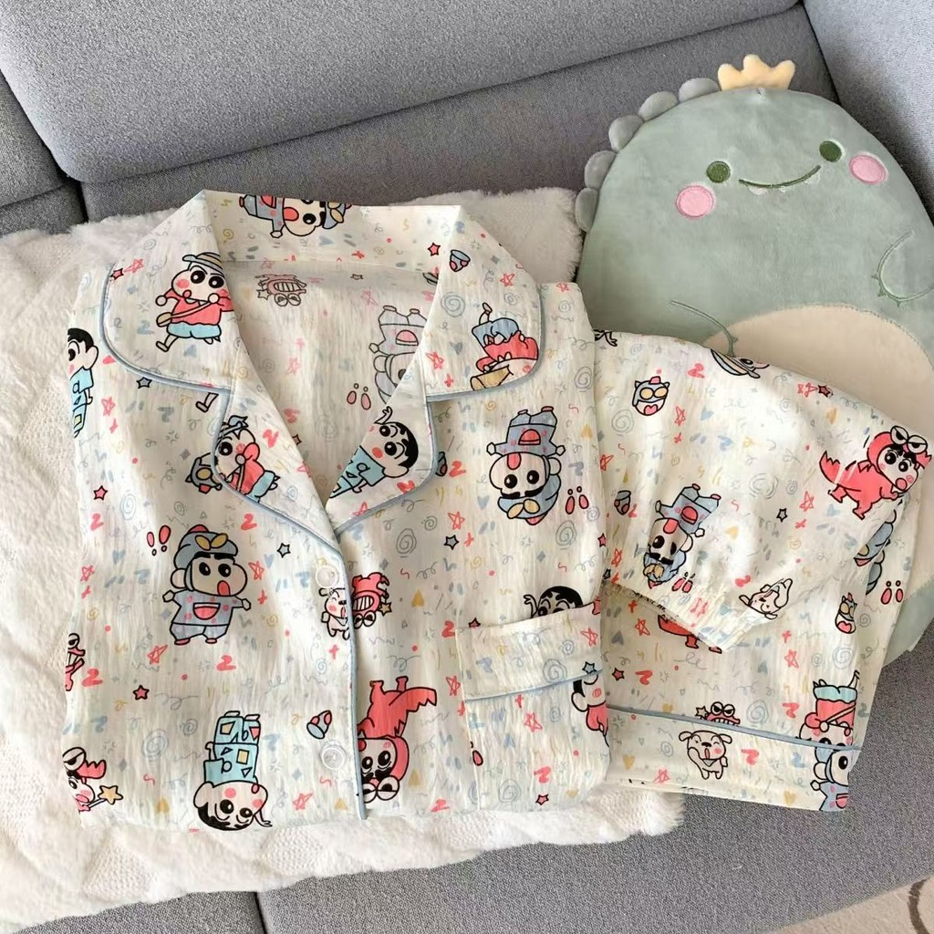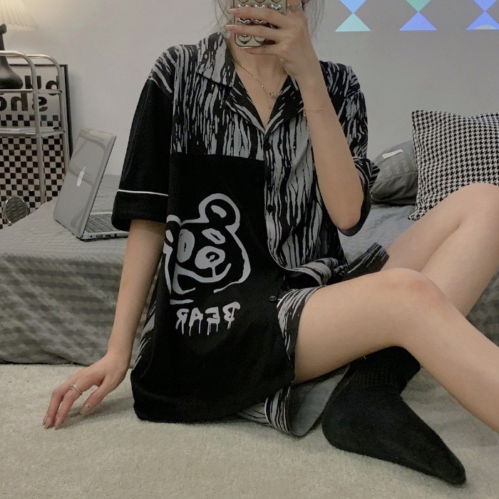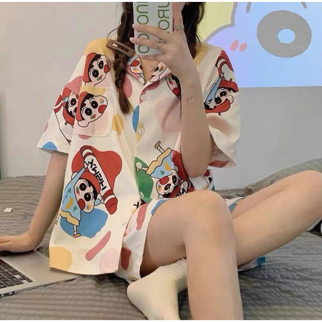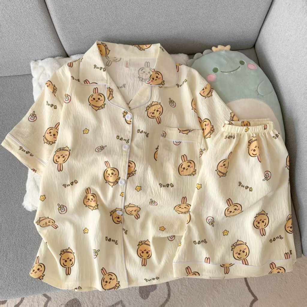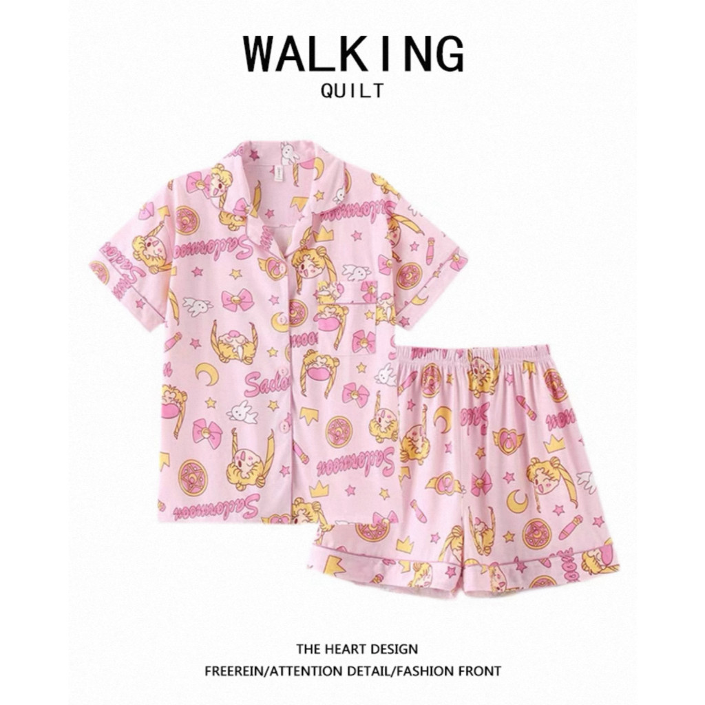 ชุดนอนลายการ์ตูนน่ารักสำหรับผู้หญิง ประกอบด้วยคาร์ดิแกนแขนสั้นและกางเกงขาสั้นจากผ้าฝ้าย เมื่อมองเห็นแล้วทำให้นึกถึงบรรยากาศอบอุ่นของบ้าน ในสไตล์ฤดูร้อน