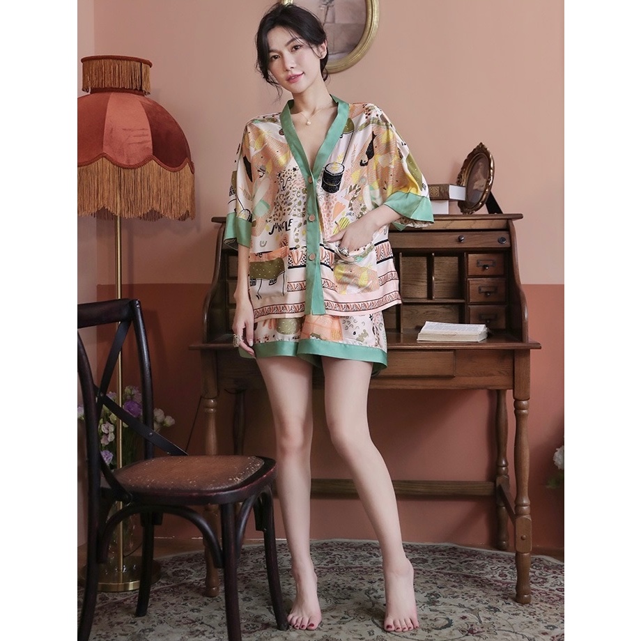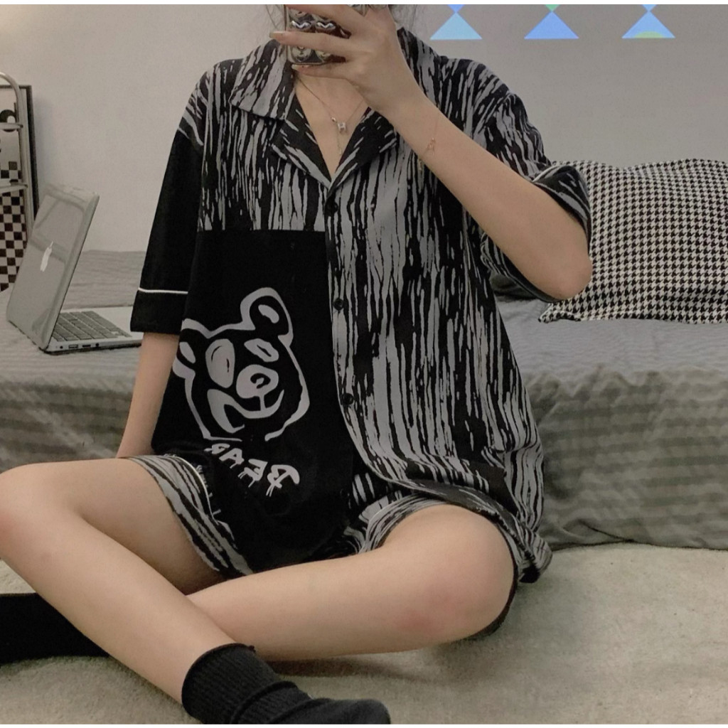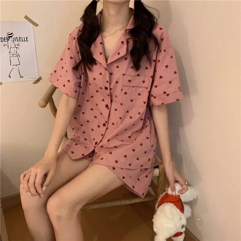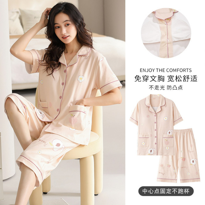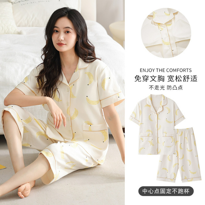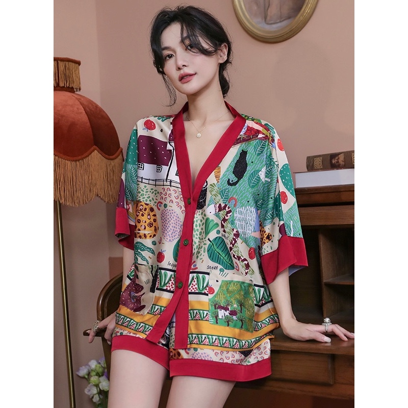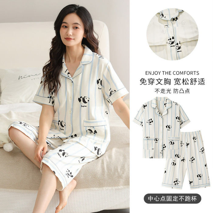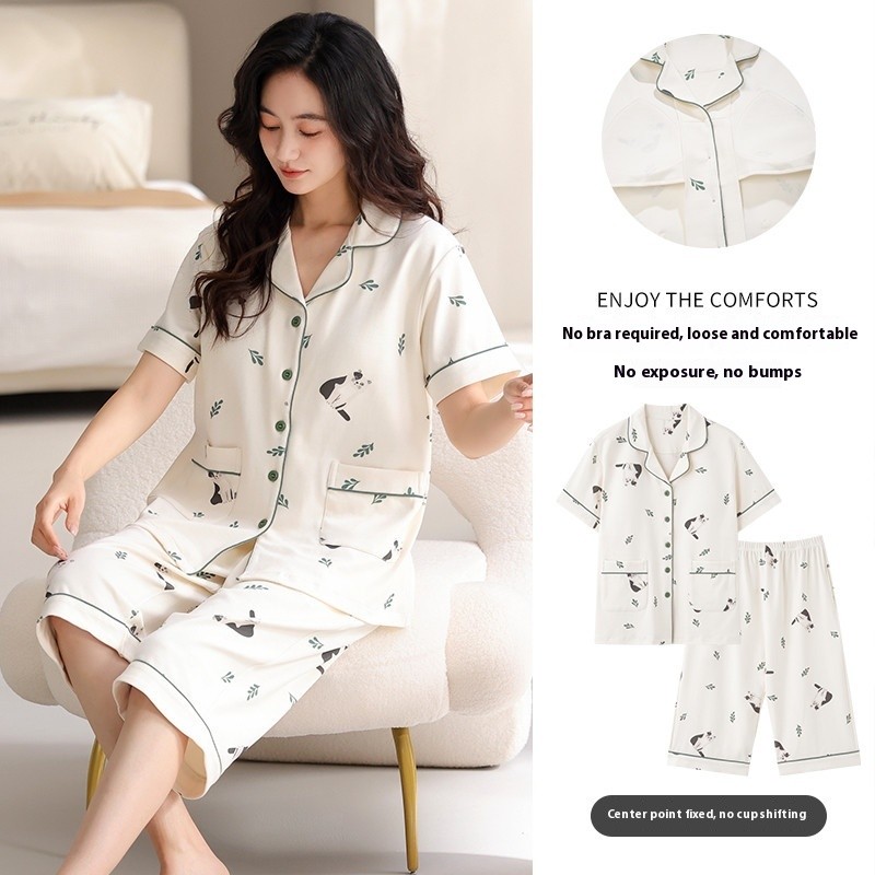 ชุดนอนลายการ์ตูนน่ารักสำหรับผู้หญิง ประกอบด้วยคาร์ดิแกนแขนสั้นและกางเกงขาสั้นจากผ้าฝ้าย เมื่อมองเห็นแล้วทำให้นึกถึงบรรยากาศอบอุ่นของบ้าน ในสไตล์ฤดูร้อน