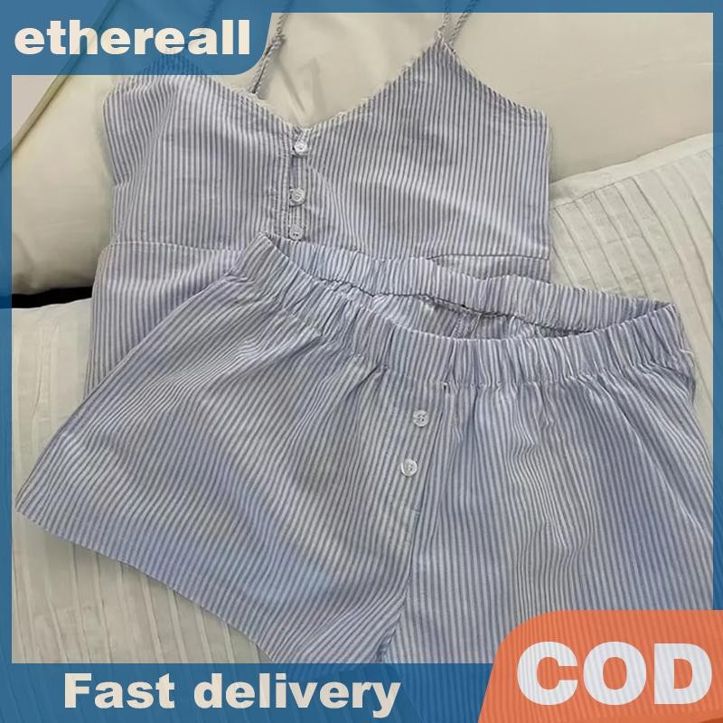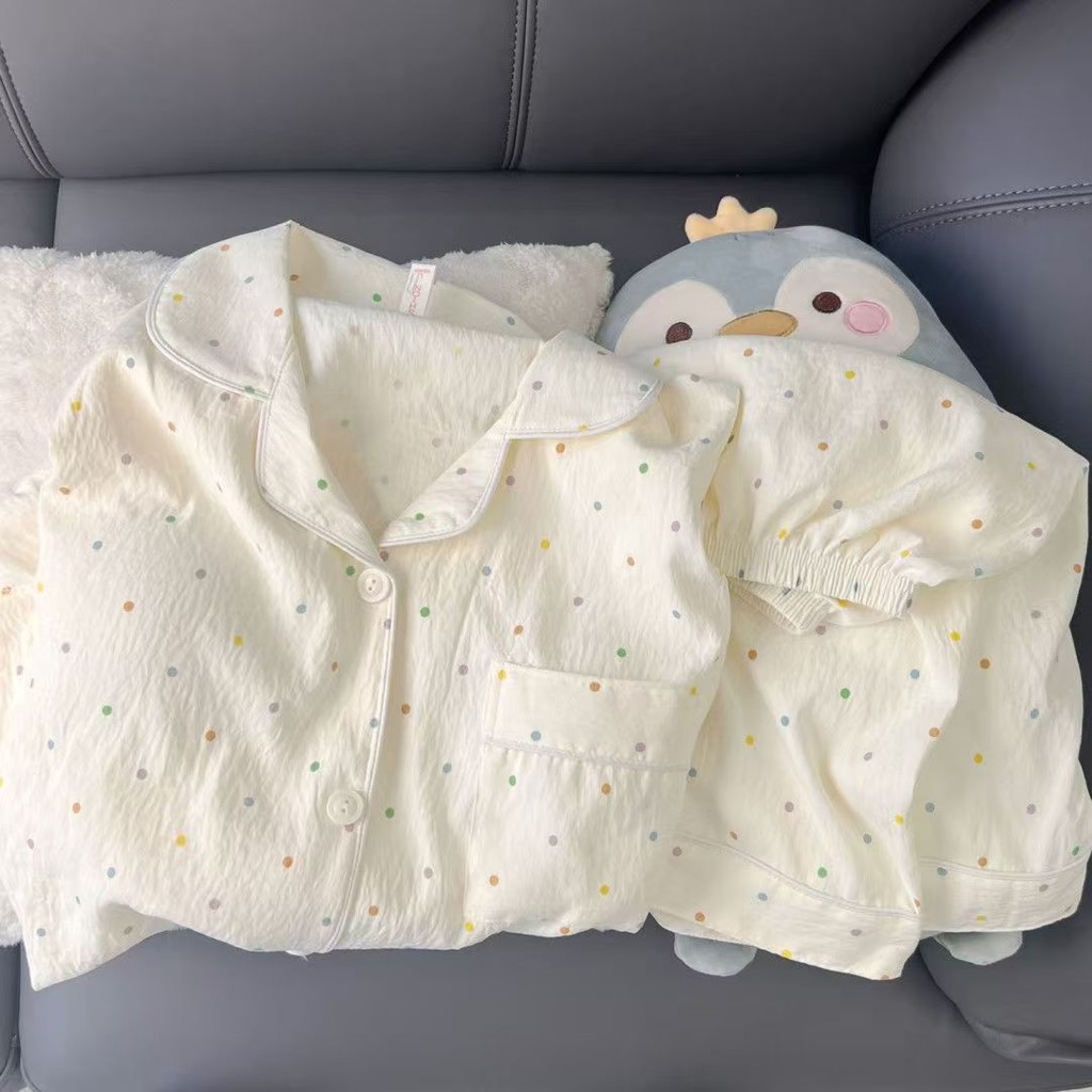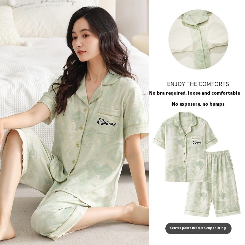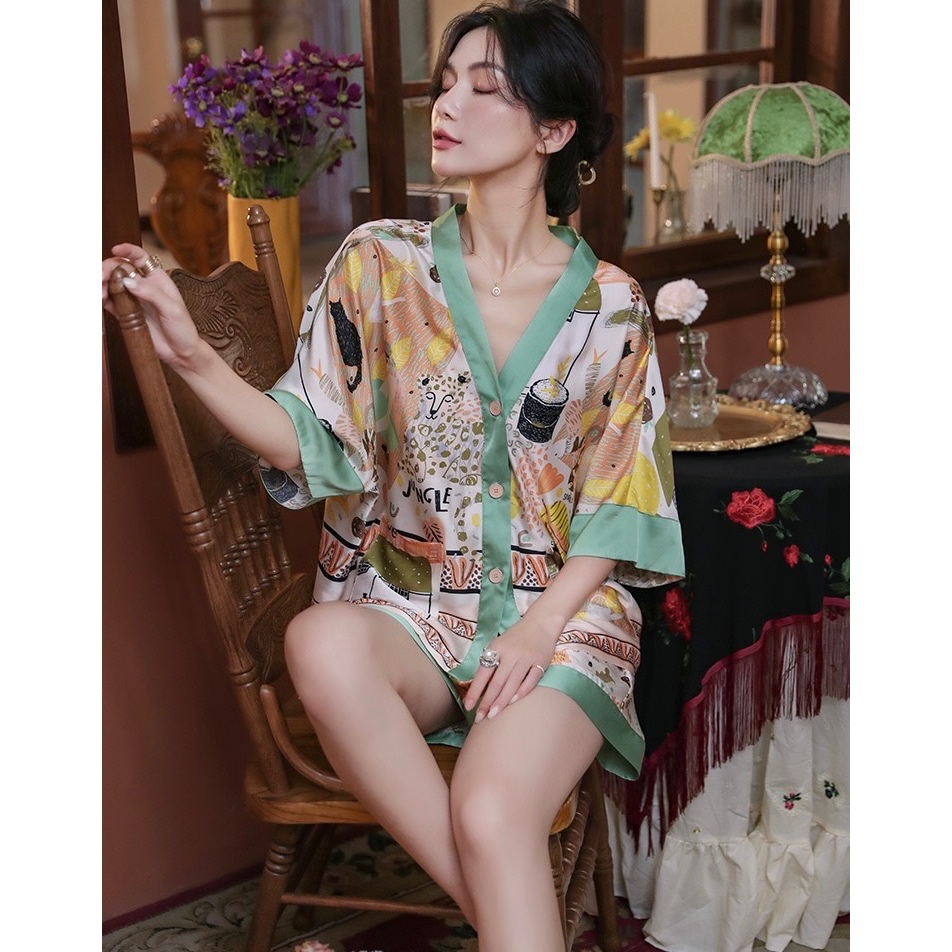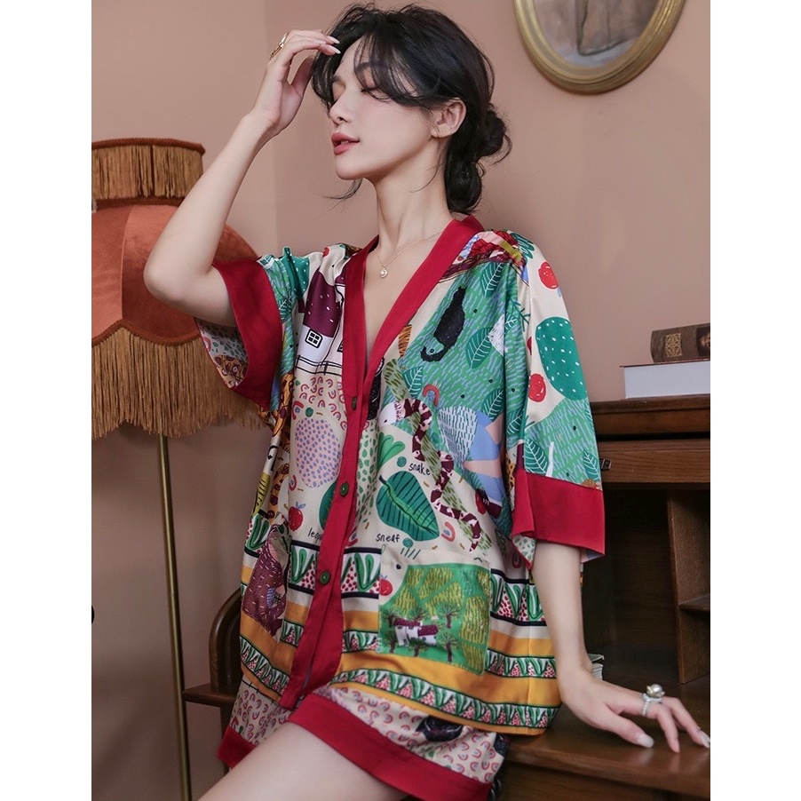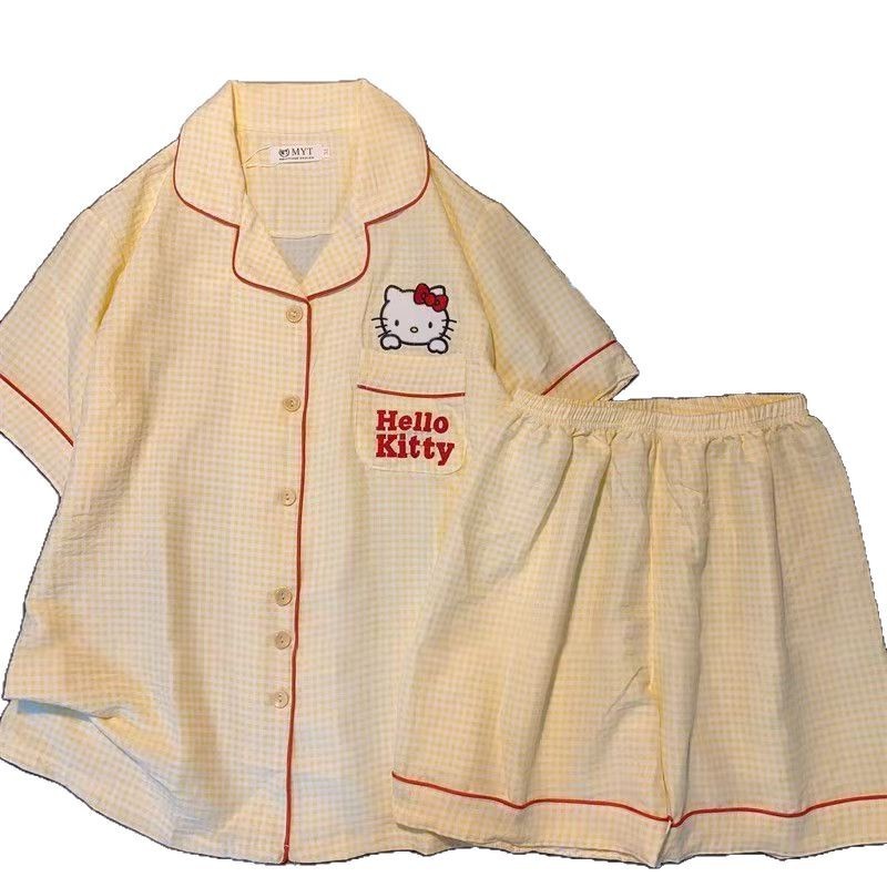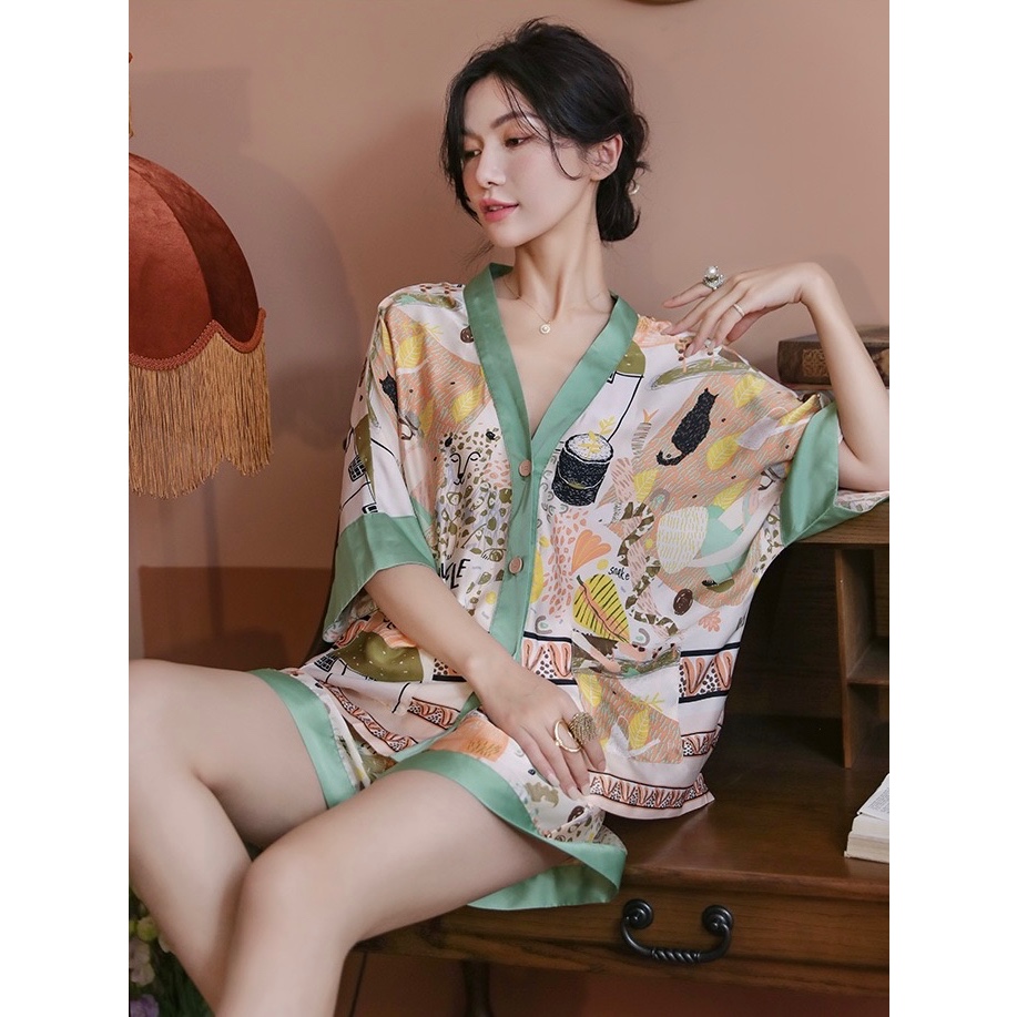 ชุดนอนลายการ์ตูนน่ารักสำหรับผู้หญิง ประกอบด้วยคาร์ดิแกนแขนสั้นและกางเกงขาสั้นจากผ้าฝ้าย เมื่อมองเห็นแล้วทำให้นึกถึงบรรยากาศอบอุ่นของบ้าน ในสไตล์ฤดูร้อน