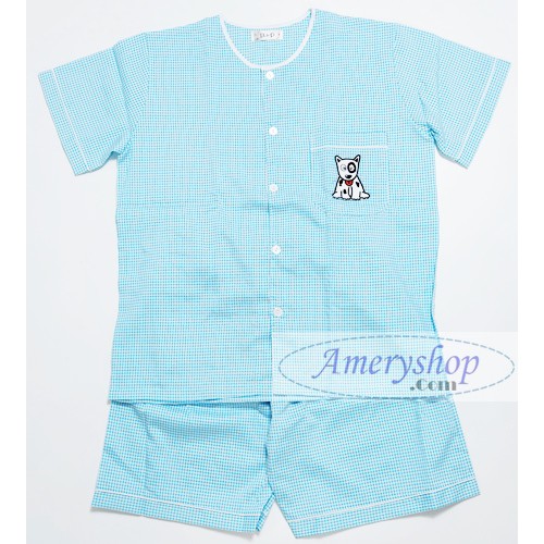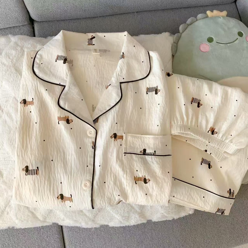 ชุดนอนสุนัขดัชชุนลายตารางสีฟ้าผ้าฝ้ายฤดูร้อนใหม่ FDS สำหรับผู้หญิง แขนสั้น ชุดนอนสบายๆ ลายการ์ตูน ชุดนอนนักเรียน