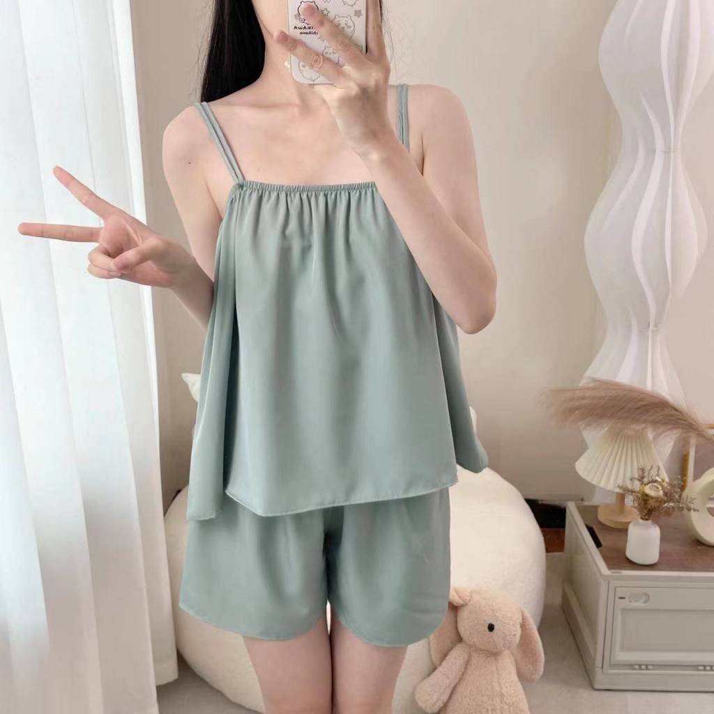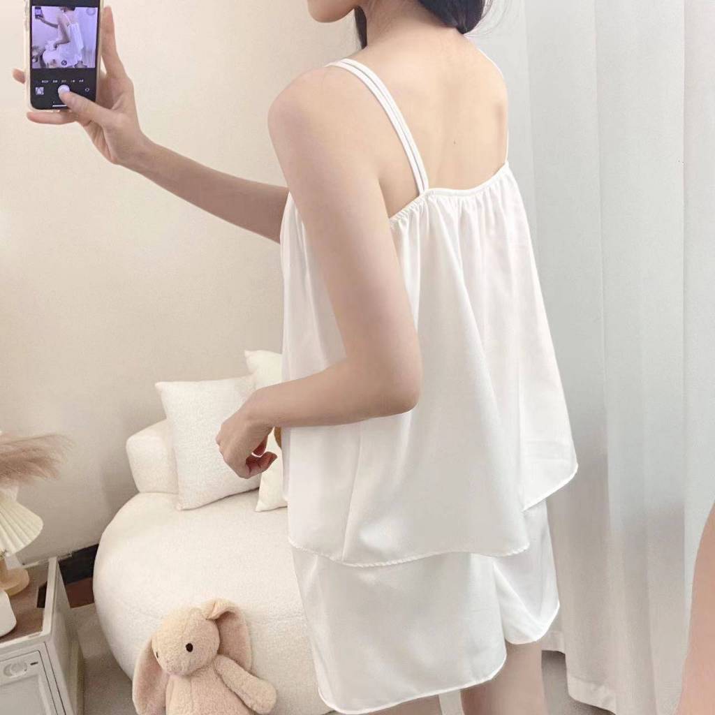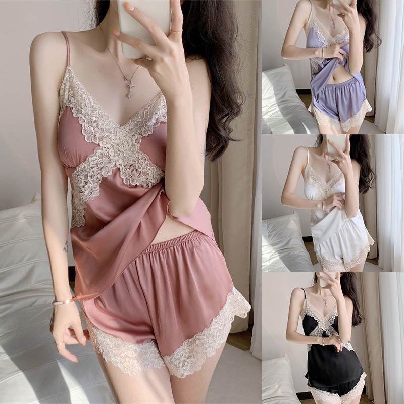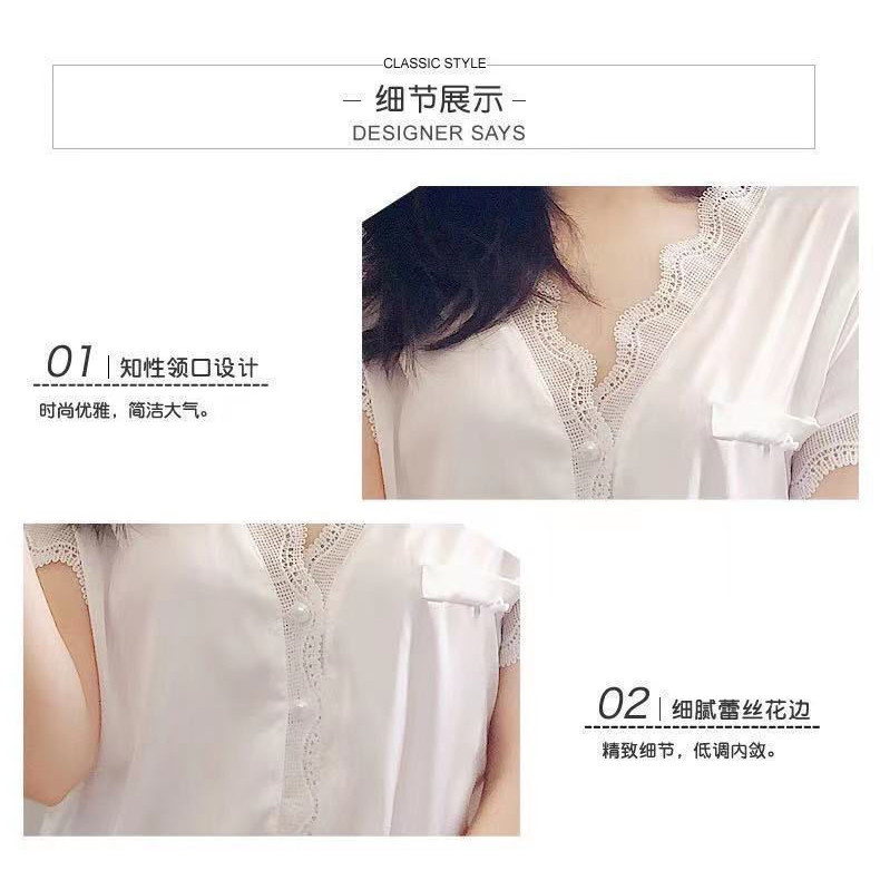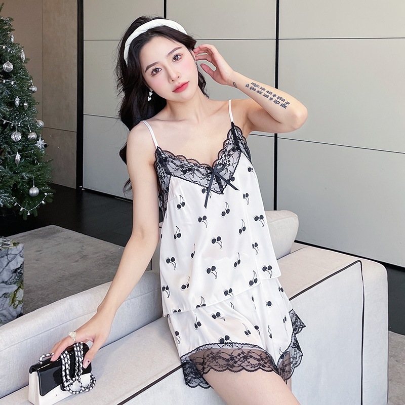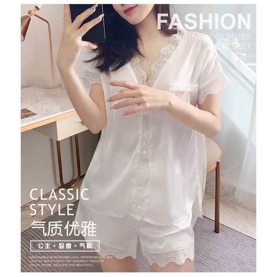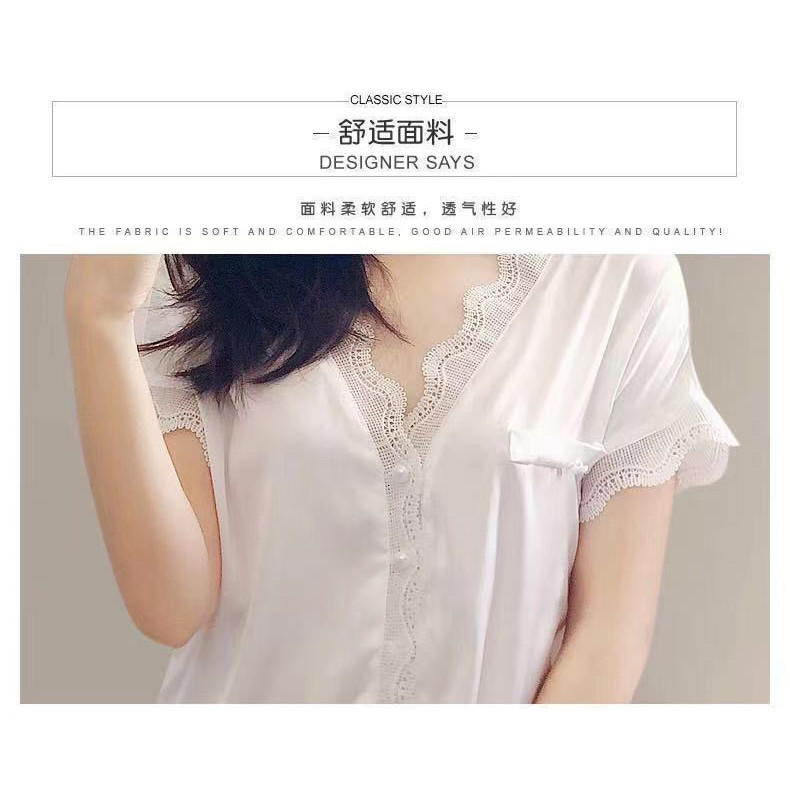 ชุดนอนผู้หญิงฤดูร้อนผ้าไหมน้ําแข็งอารมณ์ระดับไฮเอนด์กางเกงขาสั้นแขนสั้นลูกไม้บางเรียบง่ายสามารถสวมใส่นอกบ้านเสื้อผ้าแสงความสะดวกสบาย