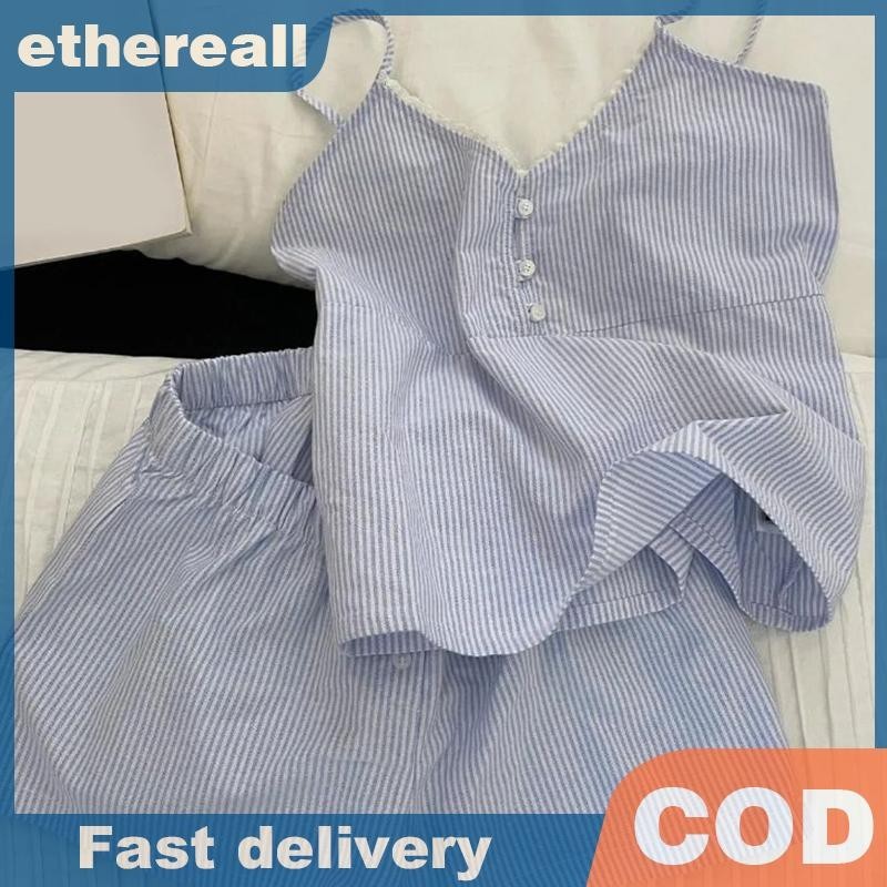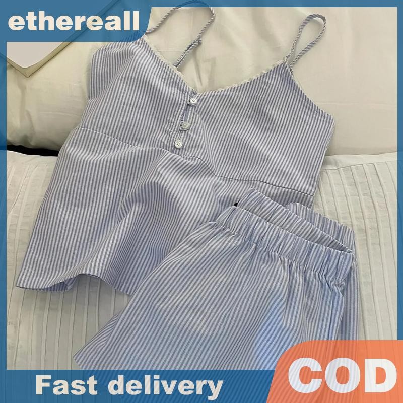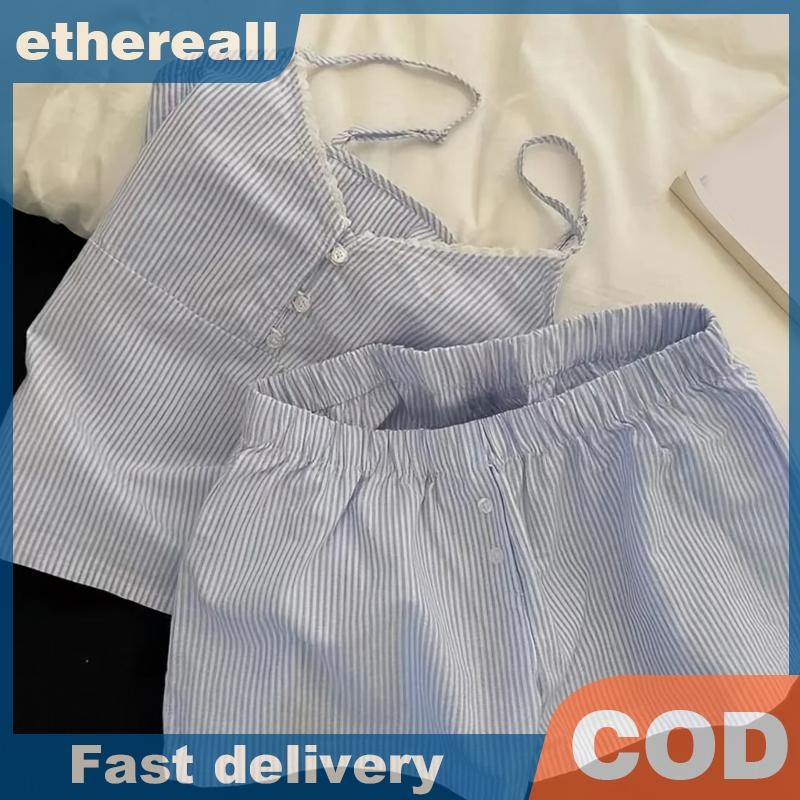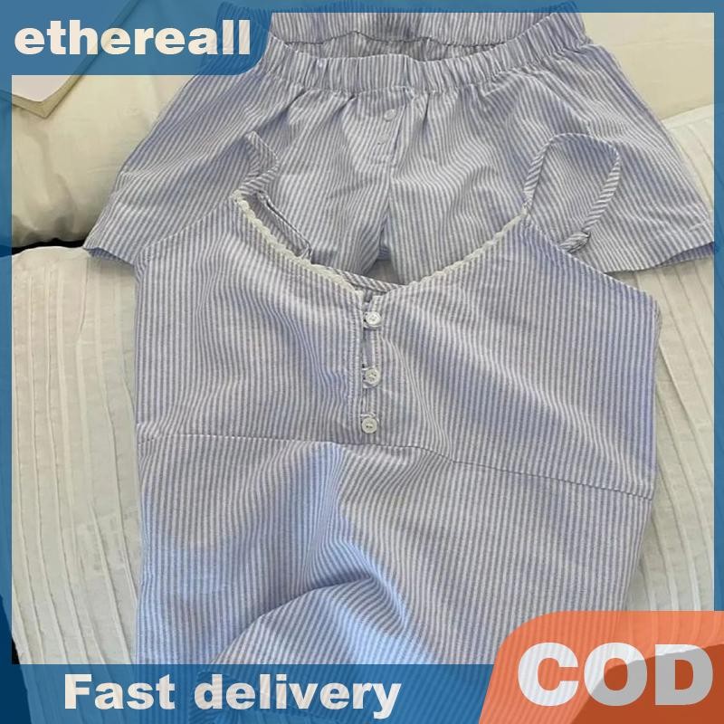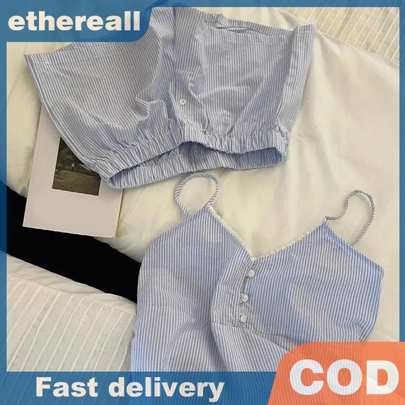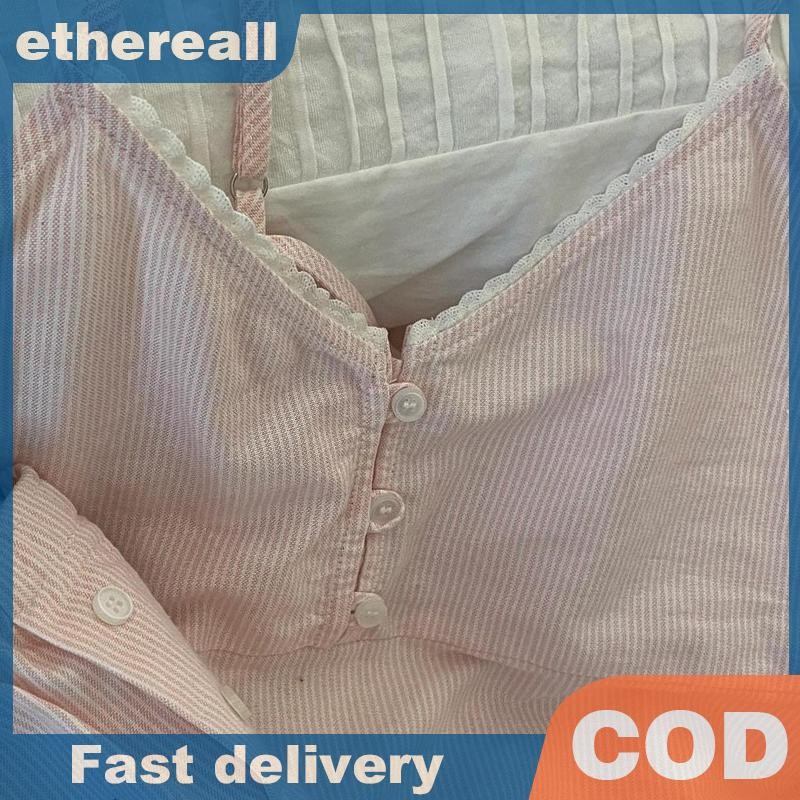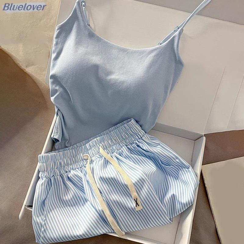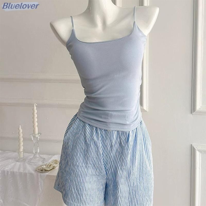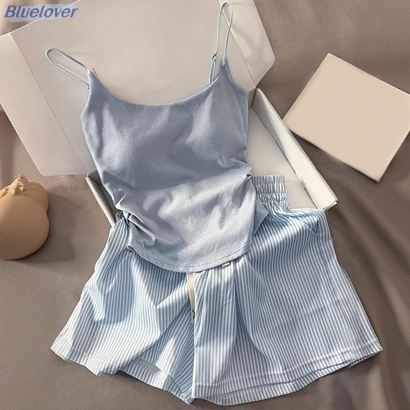 ชุดนอนลายเส้นสีฟ้าพร้อมแผ่นเสริมหน้าอก เหมาะสำหรับใส่นอนและการพักผ่อน