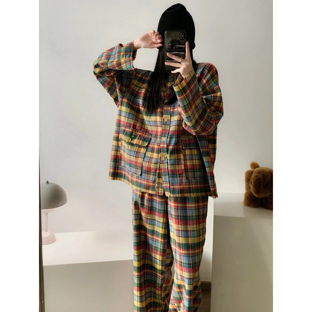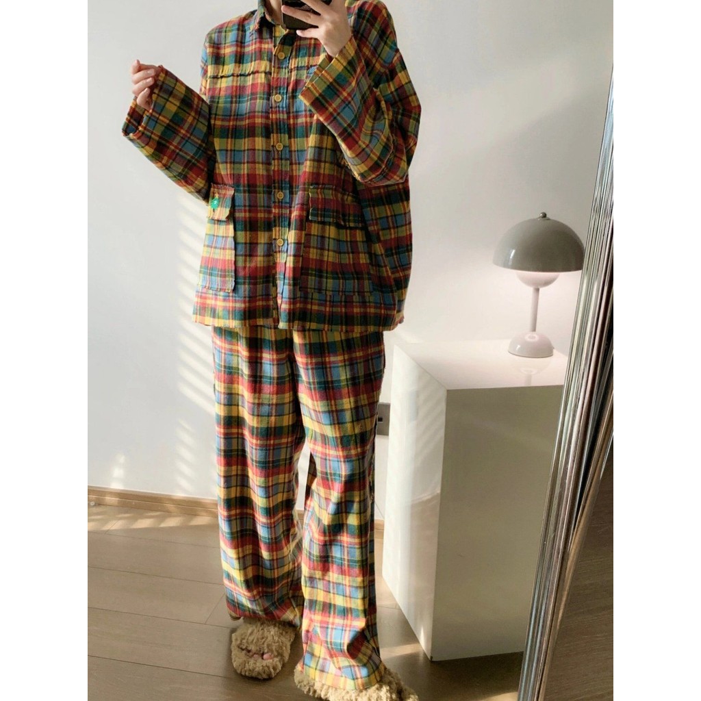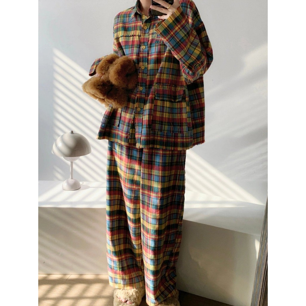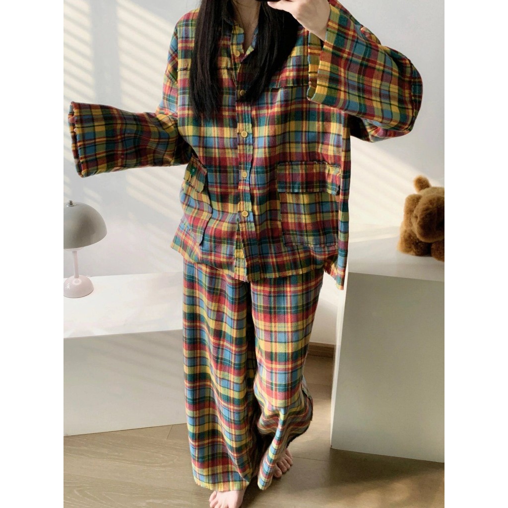 ชุดนอนผู้หญิงญี่ปุ่นฤดูใบไม้ผลิและฤดูใบไม้ร่วงเย็บลายสก๊อตสีหวานย้อนยุคกางเกงขายาวแขนยาวออกเสื้อผ้าที่บ้าน