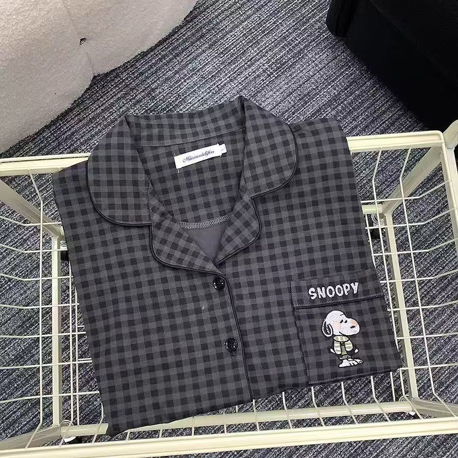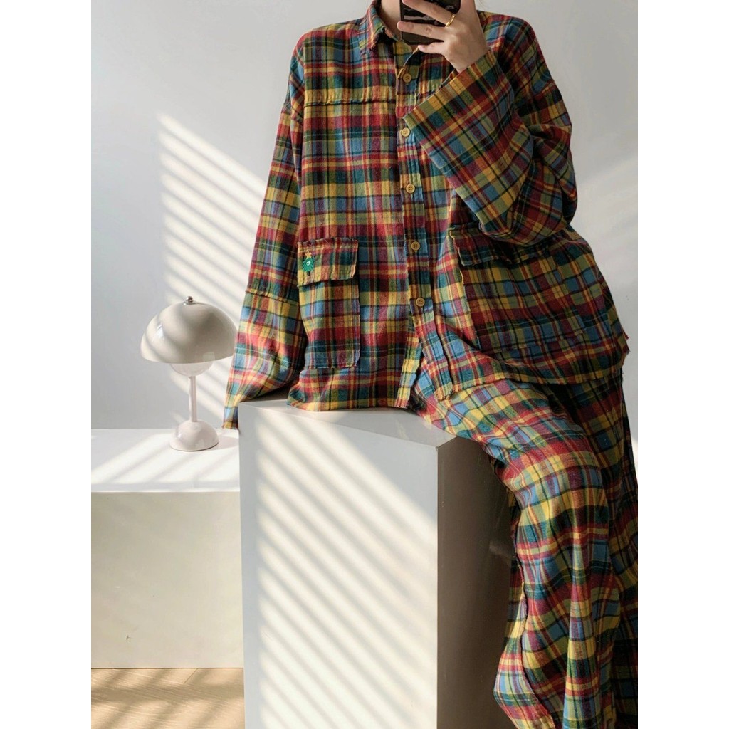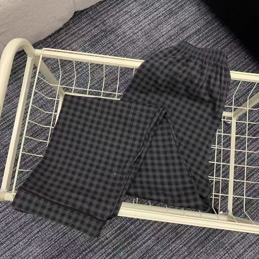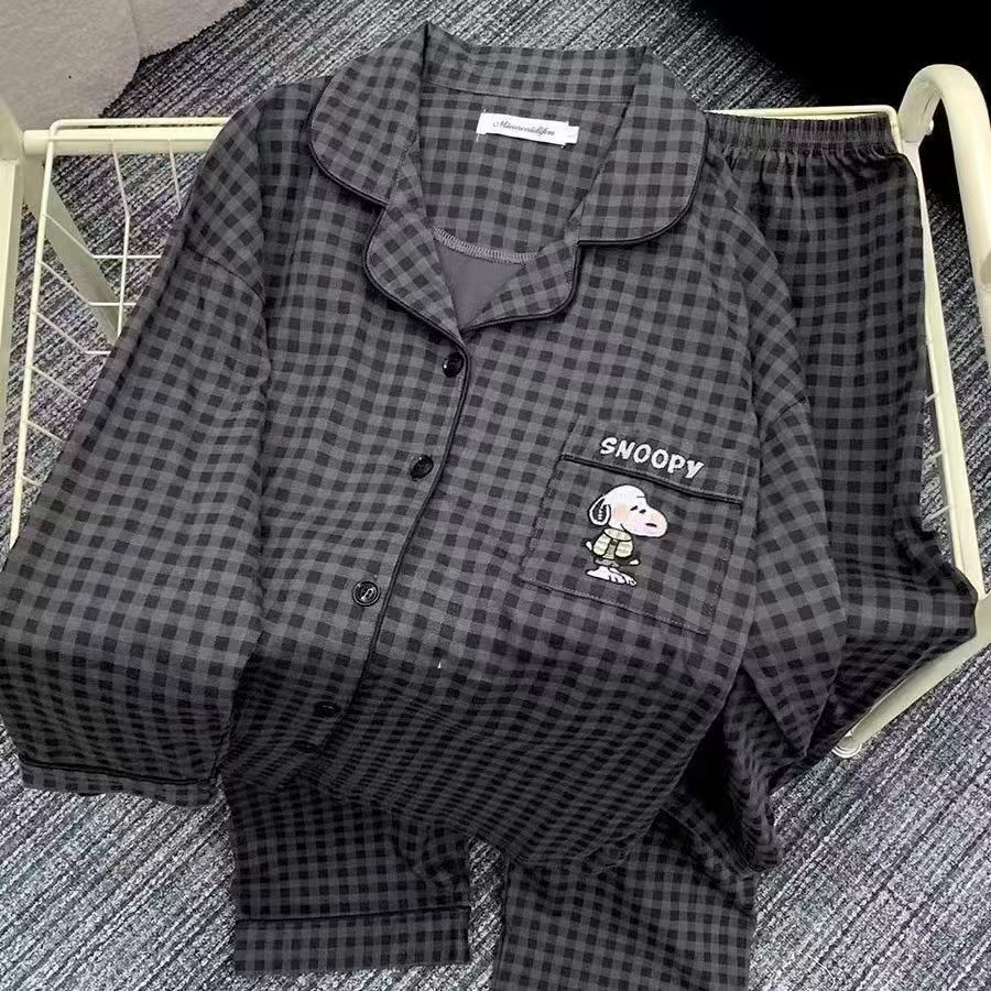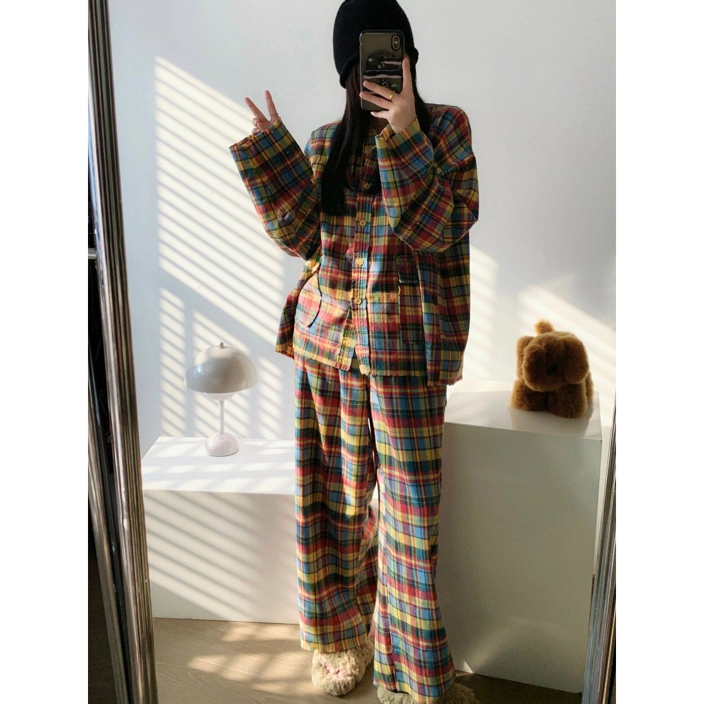 ชุดนอนผู้หญิงญี่ปุ่นฤดูใบไม้ผลิและฤดูใบไม้ร่วงเย็บลายสก๊อตสีหวานย้อนยุคกางเกงขายาวแขนยาวออกเสื้อผ้าที่บ้าน