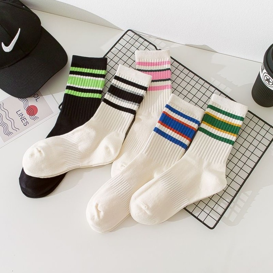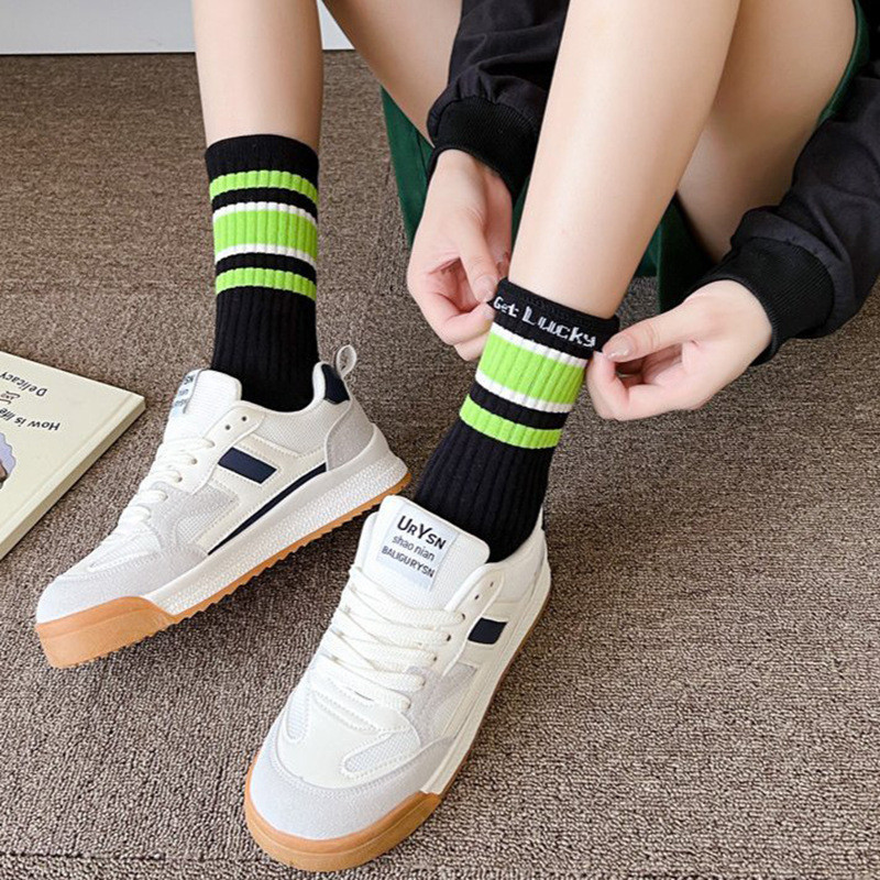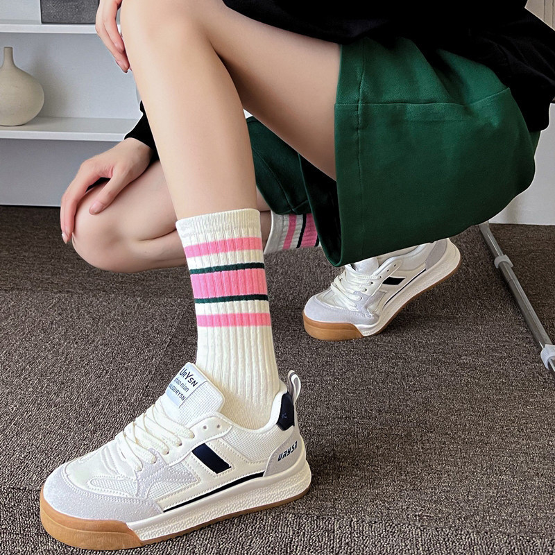 ถุงเท้าข้อเท้ากลางแฟชั่นสตรี ถุงเท้ากีฬา นักเรียนสไตล์เกาหลี ลายทาง นุ่ม สบาย ระบายอากาศได้ดี