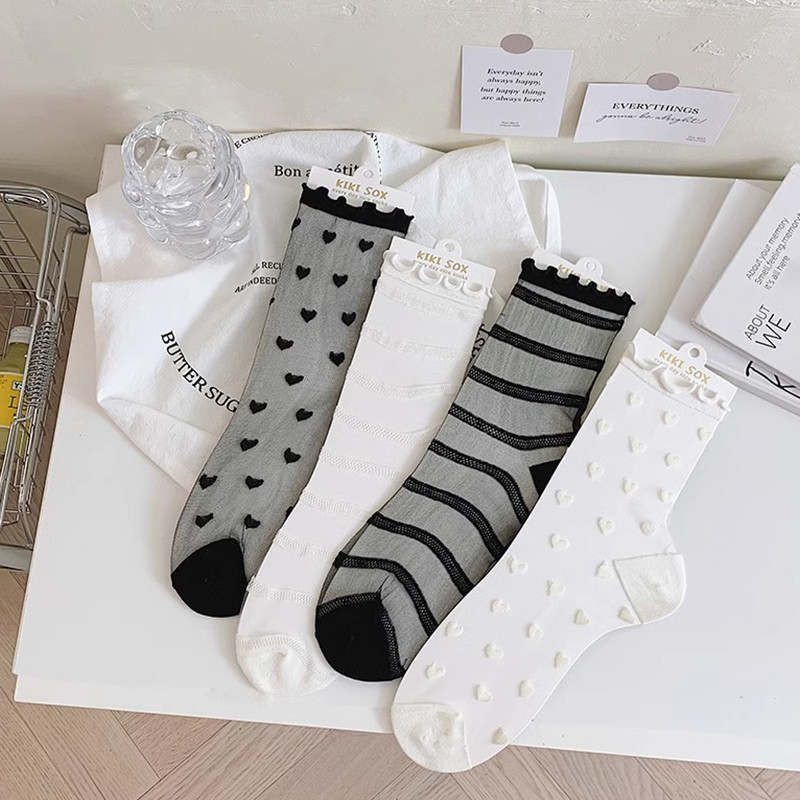 ในไทย💖ถุงเท้าลูกไม้ แต่งขอบลูกไม้ ลายหัวใจ สไตล์วิทยาลัยเวอร์ชั่นเกาหลี ระบายอากาศ บางเฉียบ JK สไตล์นักเรียนญี่ปุ่น