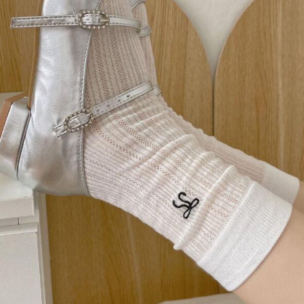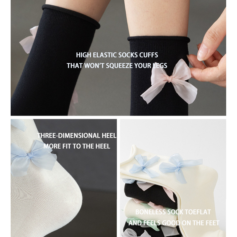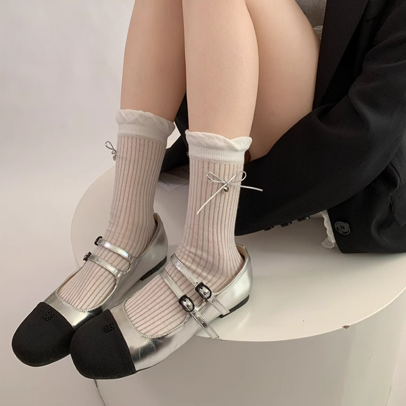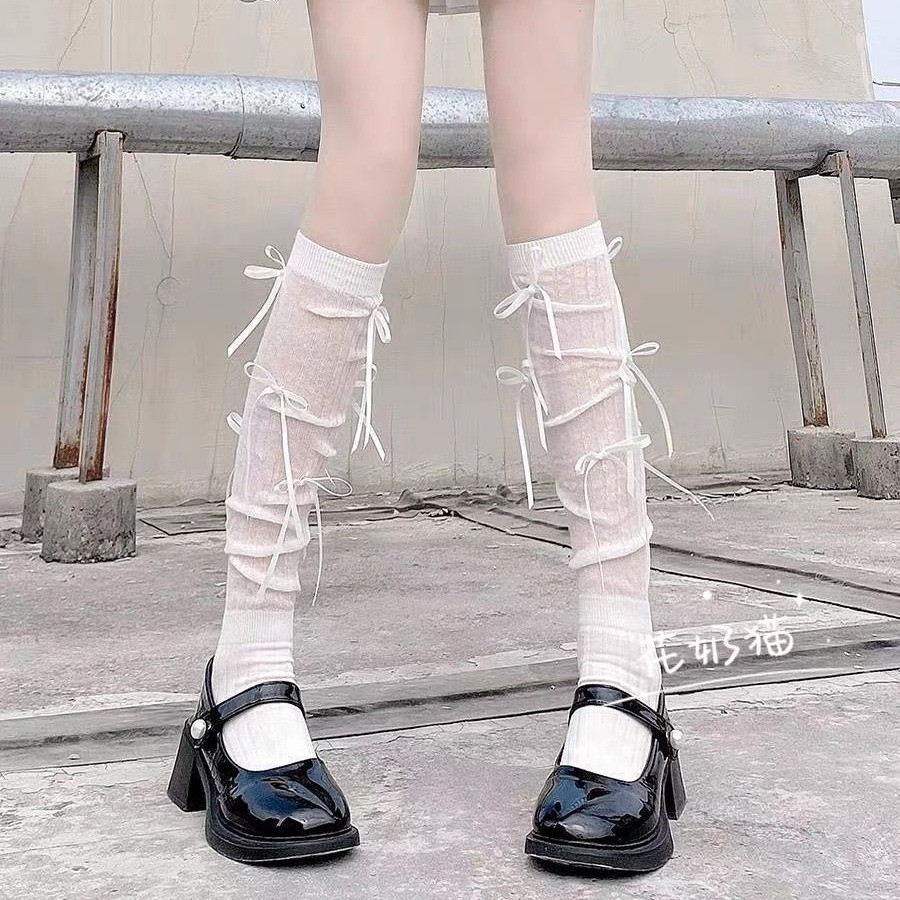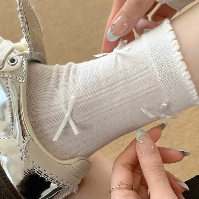 Melodygoods1 ถุงเท้ายาว, Y2K Spring Summer Bowknot Socks, ถุงเท้าผ้าฝ้ายสีทึบระบายอากาศบาง