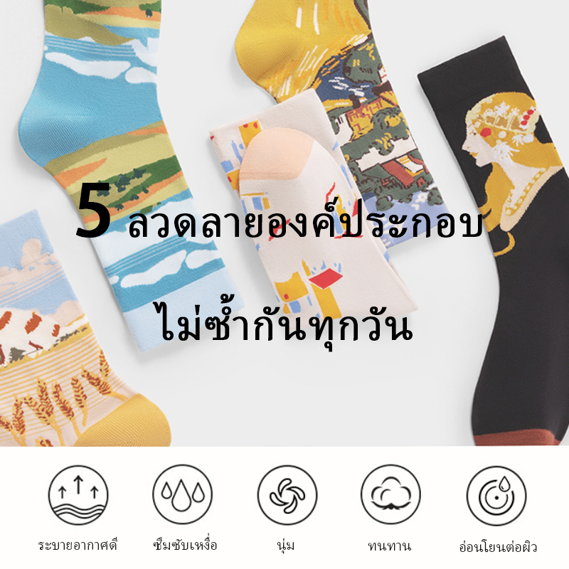 LAZYAM ถุงเท้าคู่รัก ลายภาพวาดสีน้ำมัน วินเทจ กลางน่อง แฟชั่นใหม่ 2025 สไตล์เกาหลี อินเทรนด์