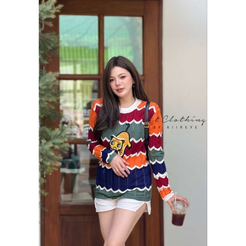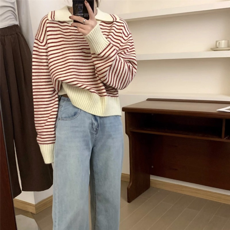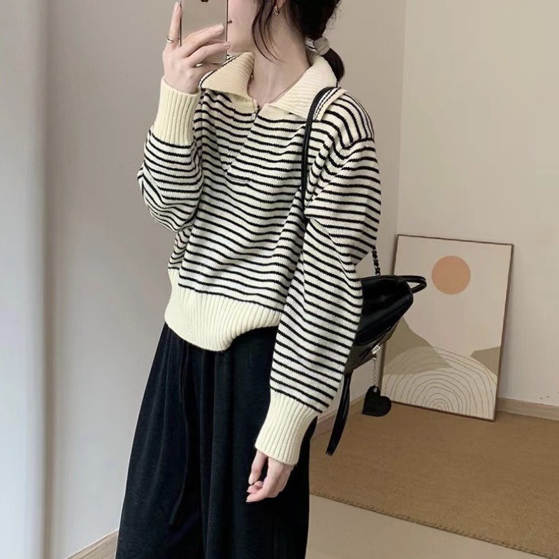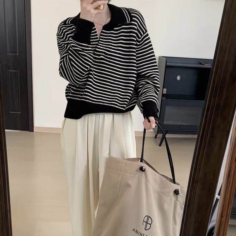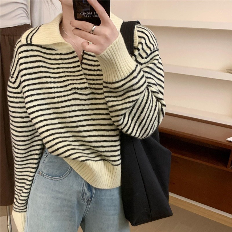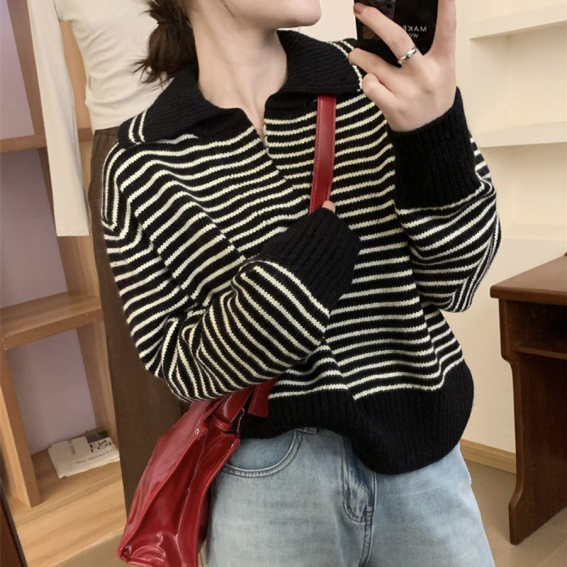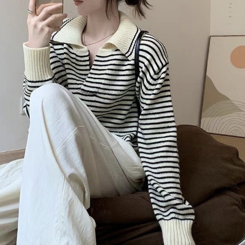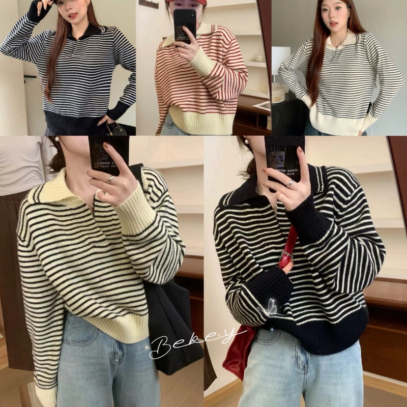 (จัดส่งจากกรุงเทพ🇹🇭) ถักแบบสบาย ๆ เสื้อกันหนาวสไตล์เกาหลี สตรีปกแฟชั่นลายทาง L036