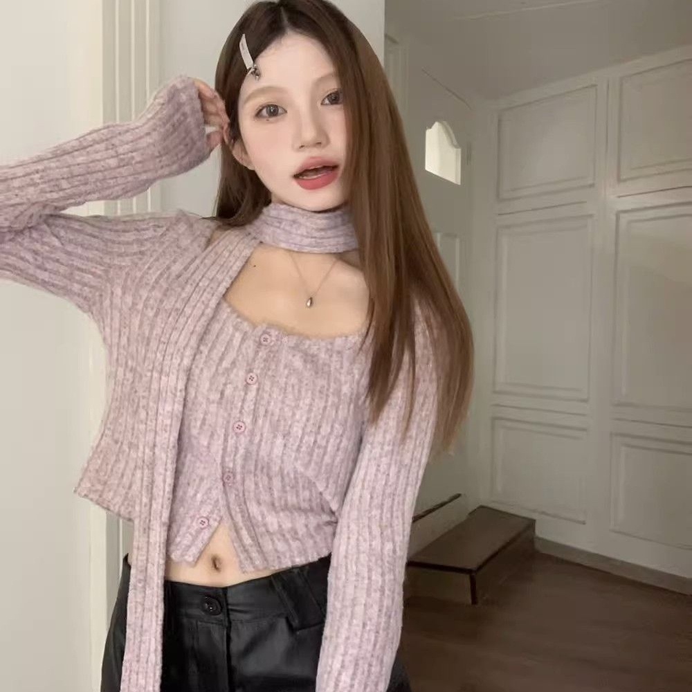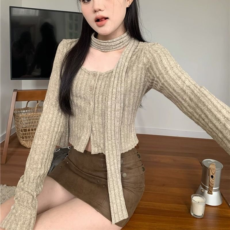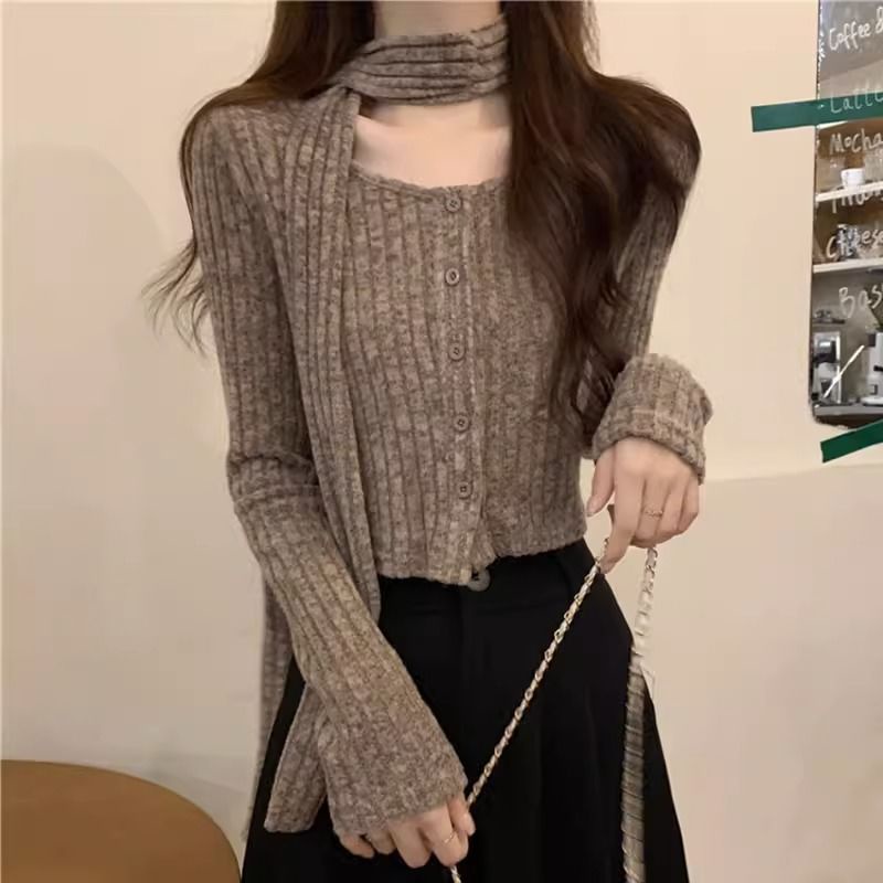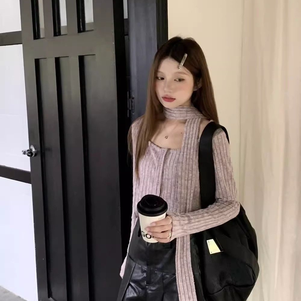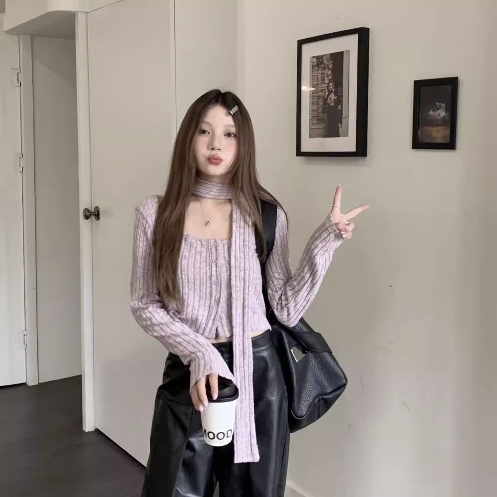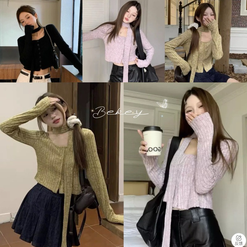 (กทม🇹🇭เดลิเวอรี่ L038) เสื้อคาร์ดิแกนถัก+ผ้าพันคอแบบใหม่ ผู้หญิงคอเหลี่ยม เสื้อครอปแขนยาว