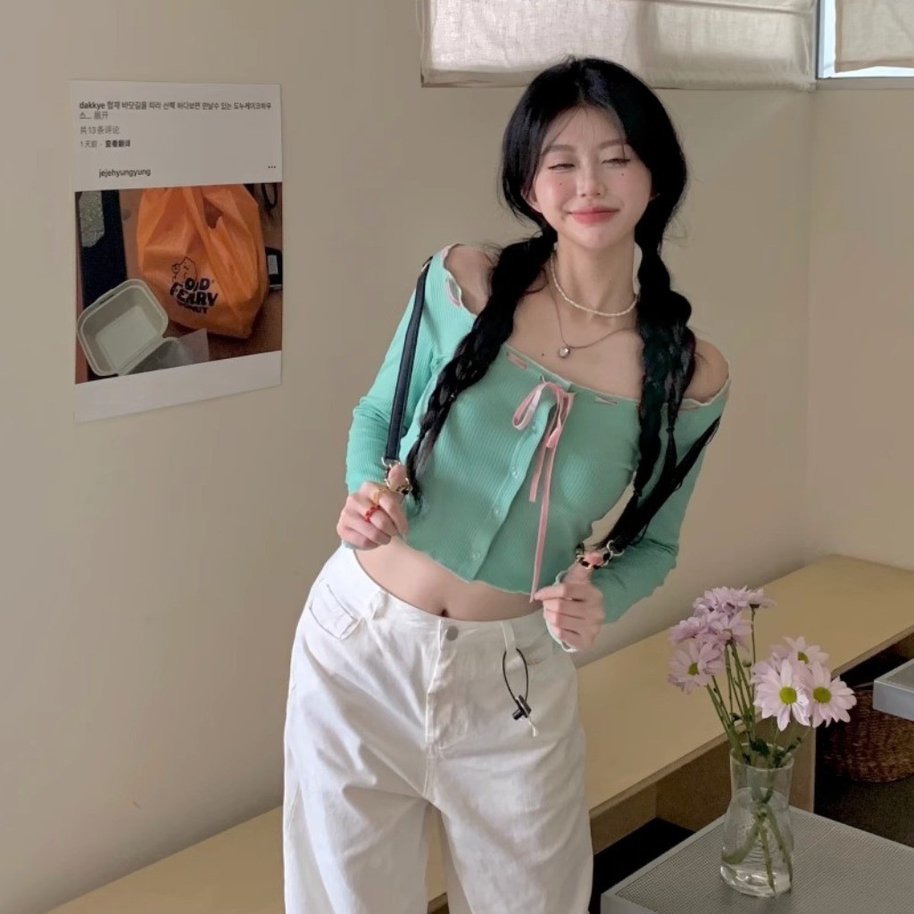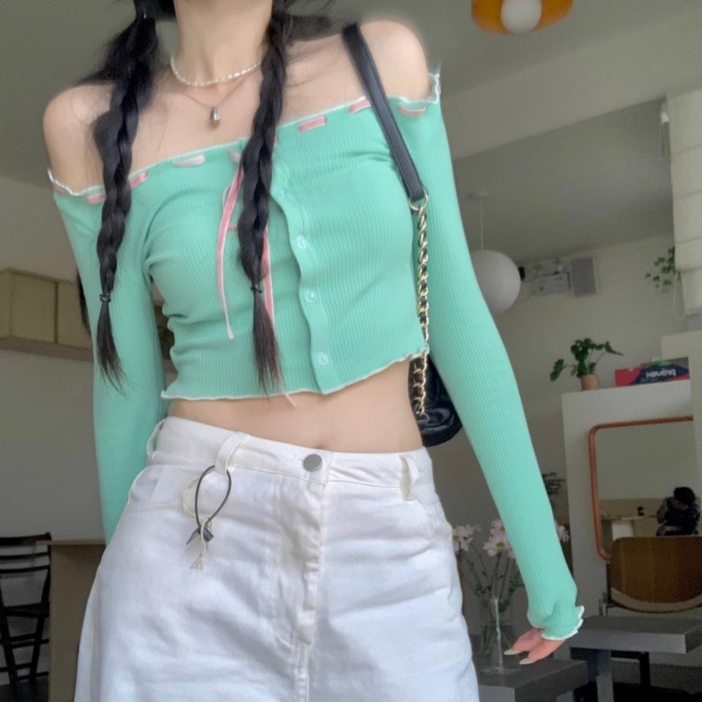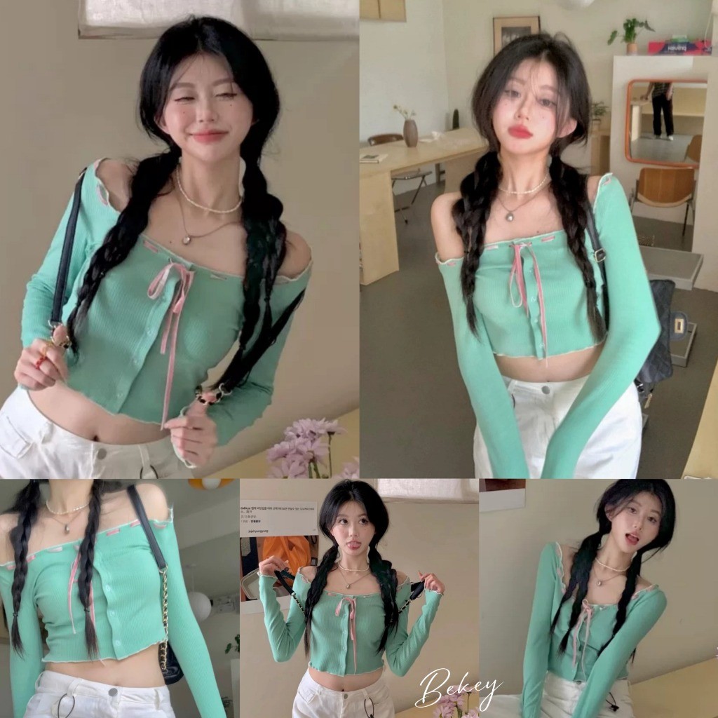 (พร้อมส่งด่วนจากกรุงเทพ🇹🇭)เสื้อยืดแขนยาวสั้นเซ็กซี่ของผู้หญิงเสื้อคาร์ดิแกนแฟชั่นเปิดไหล่ L065