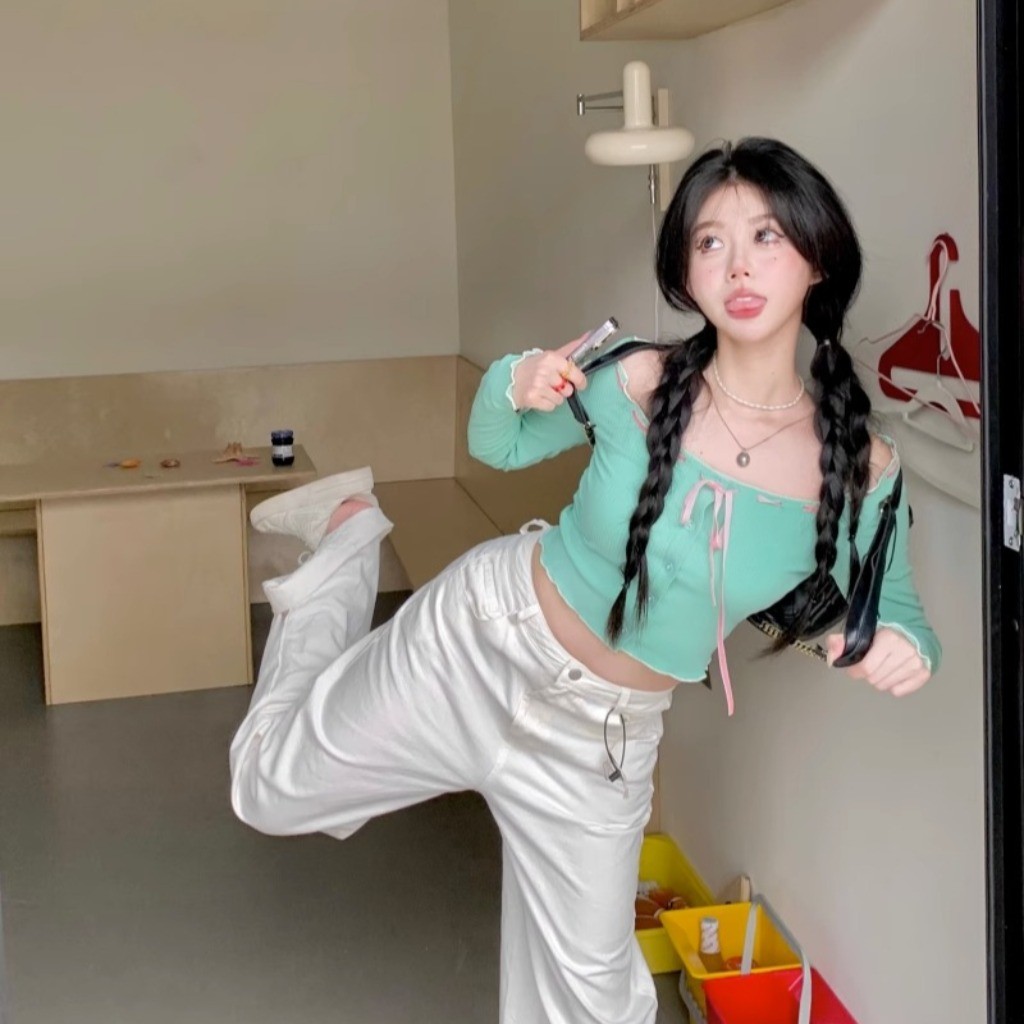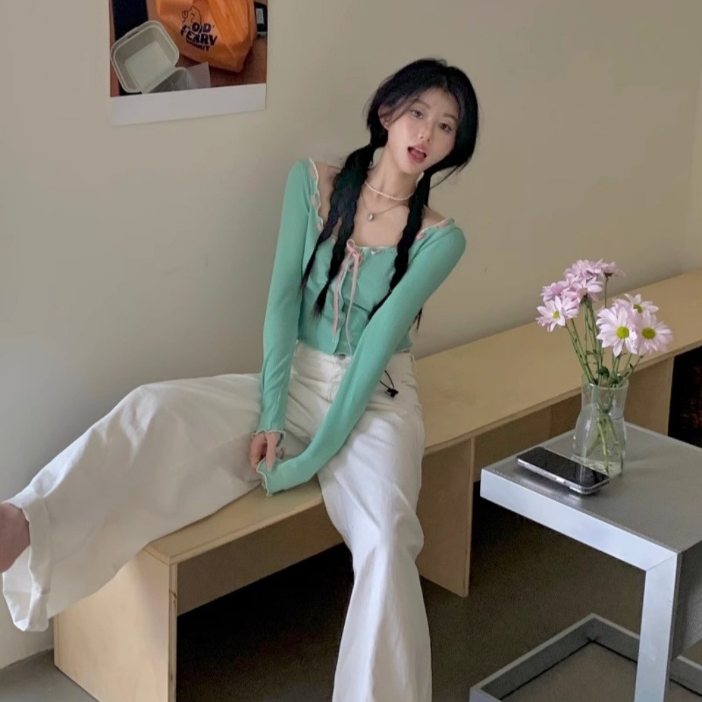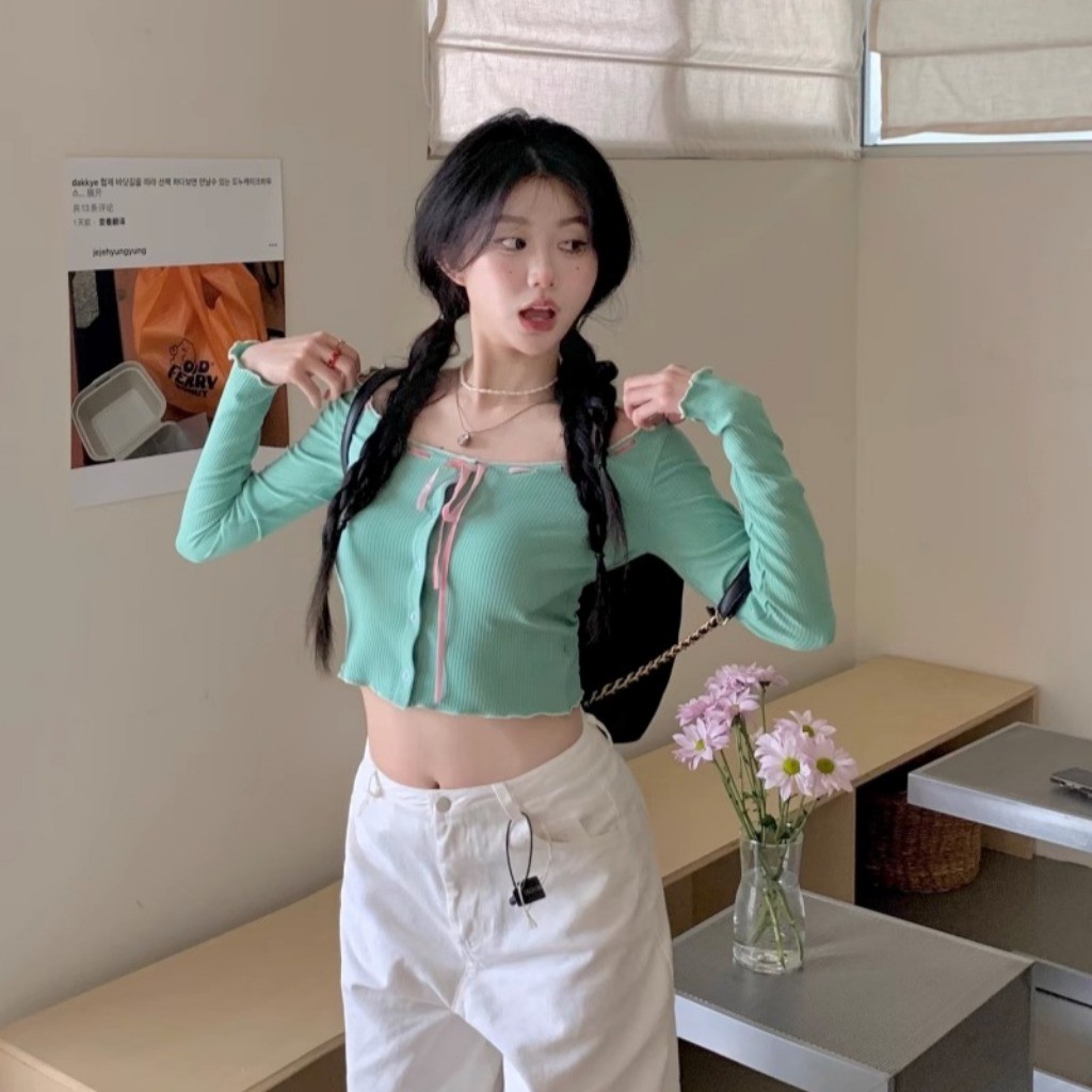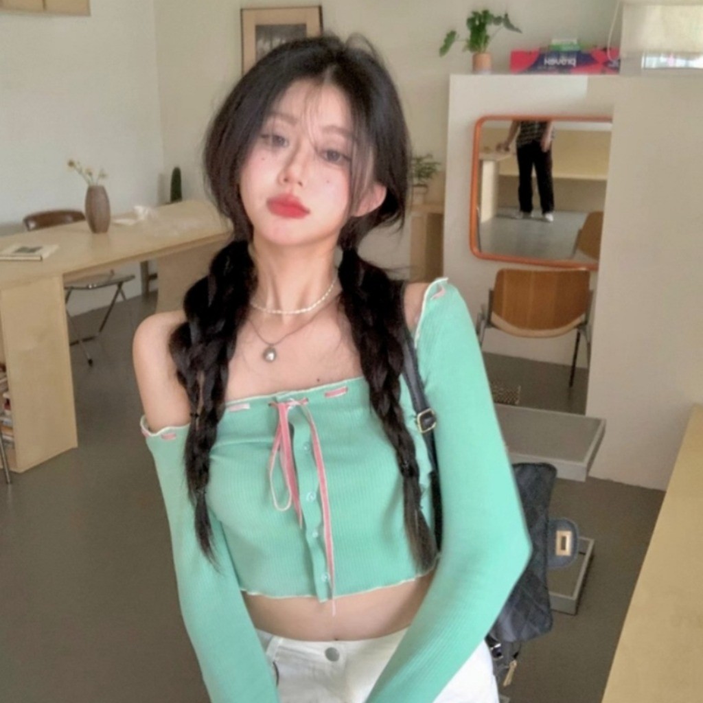 (พร้อมส่งด่วนจากกรุงเทพ🇹🇭)เสื้อยืดแขนยาวสั้นเซ็กซี่ของผู้หญิงเสื้อคาร์ดิแกนแฟชั่นเปิดไหล่ L065