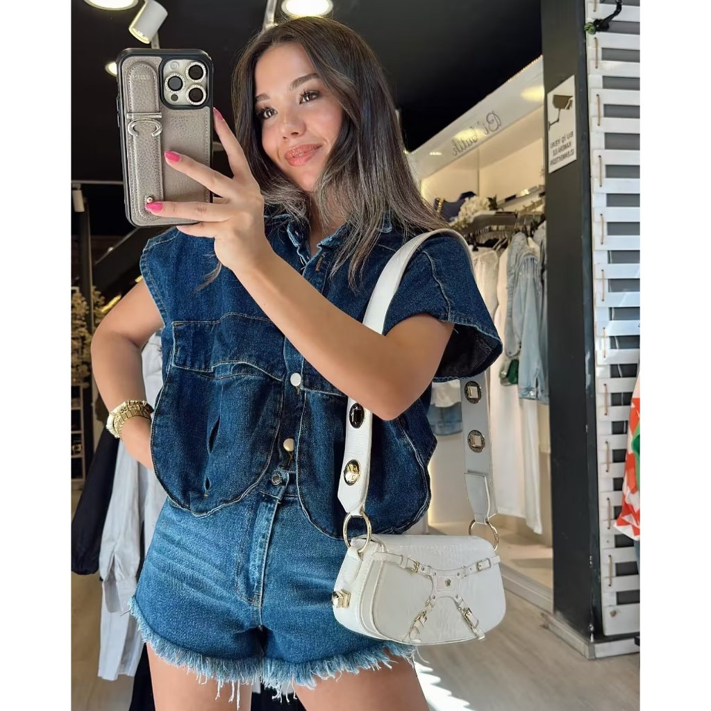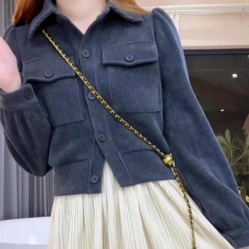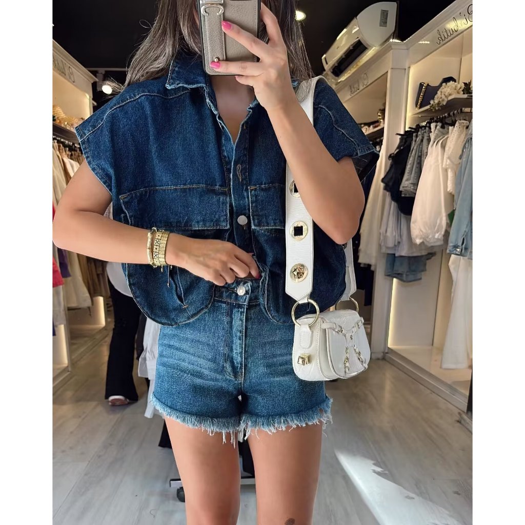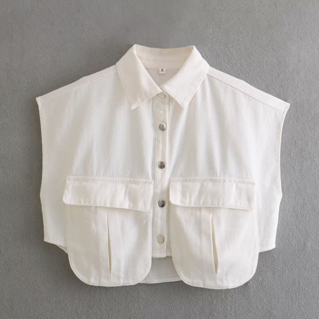 เสื้อโปโลย้อนยุคผู้หญิง เสื้อครอปแขนกุด เสื้อเชิ้ตยีนส์ทรงหลวม เก๋ไก๋ กระเป๋าใหญ่