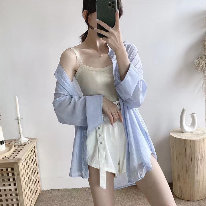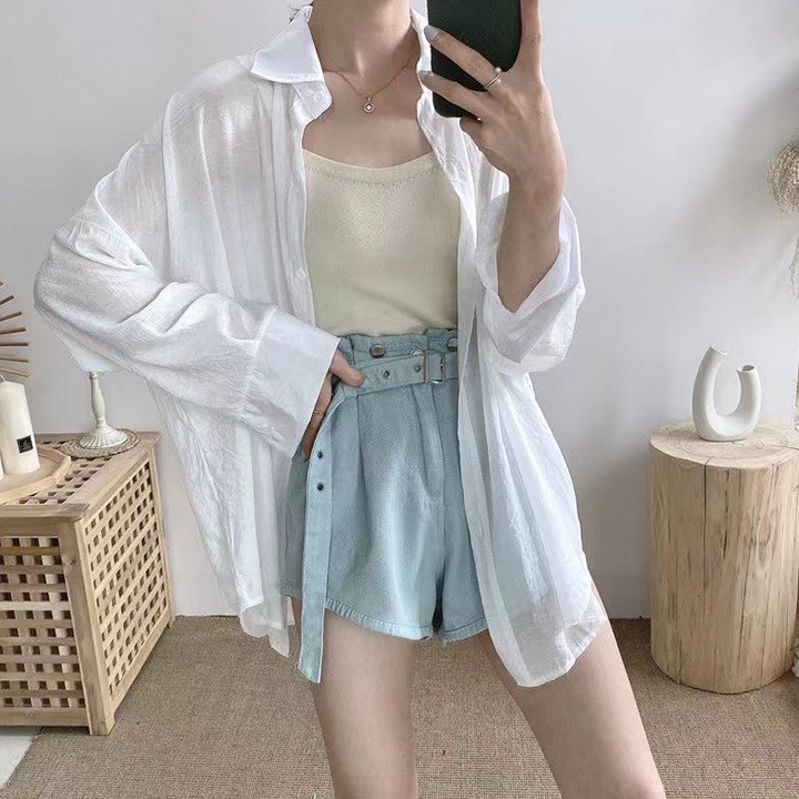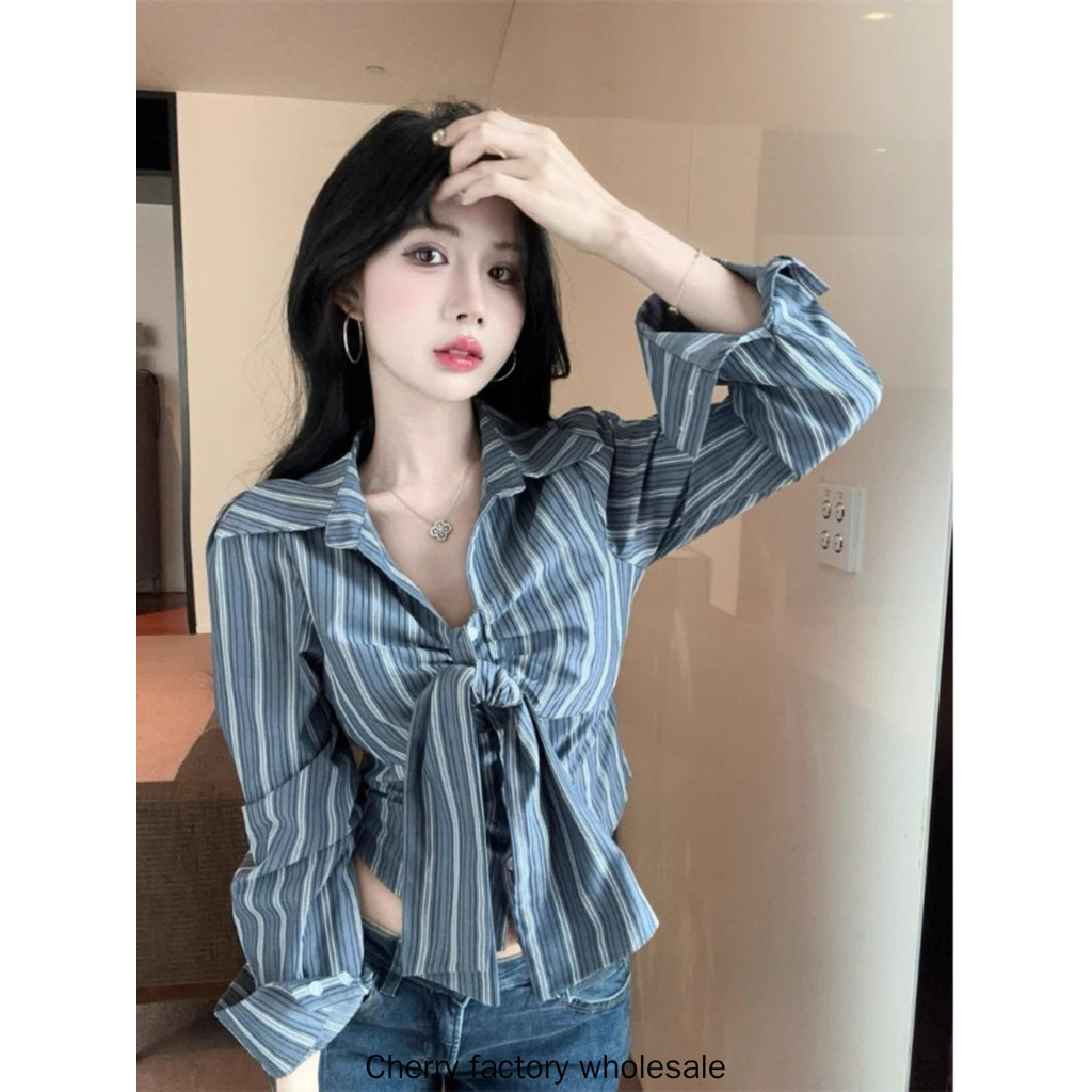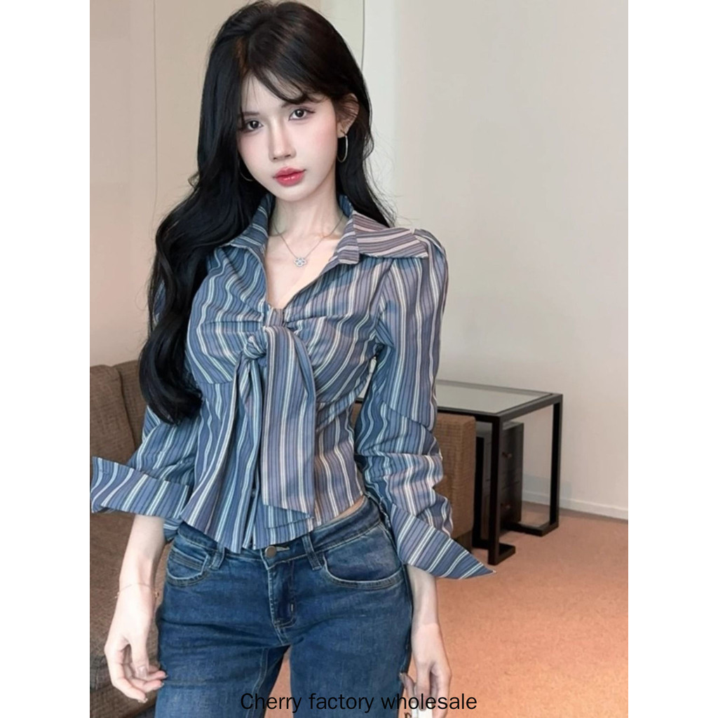 เสื้อโปโลย้อนยุคผู้หญิง เสื้อครอปแขนกุด เสื้อเชิ้ตยีนส์ทรงหลวม เก๋ไก๋ กระเป๋าใหญ่