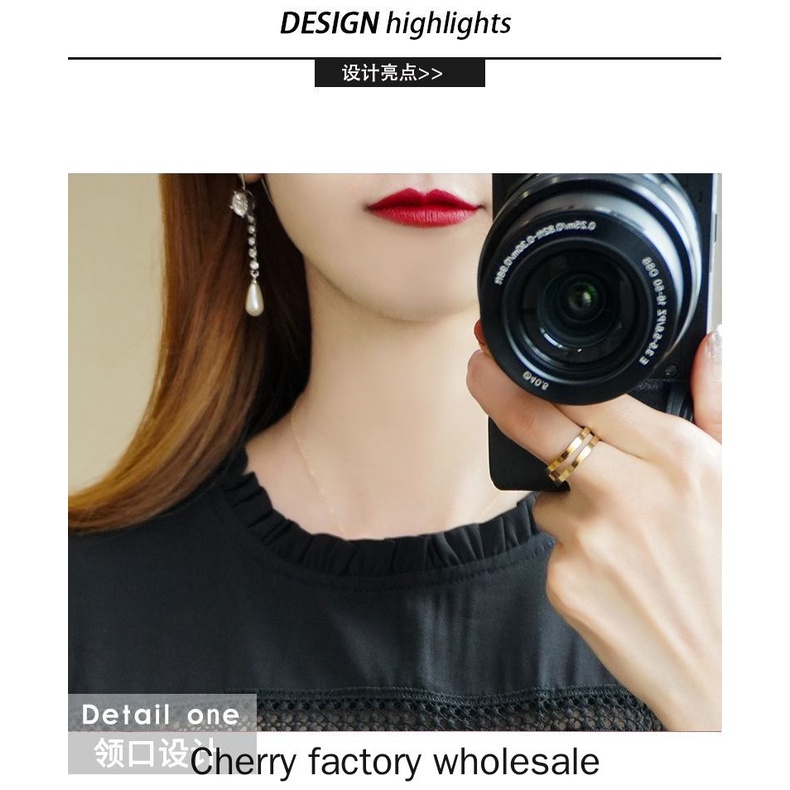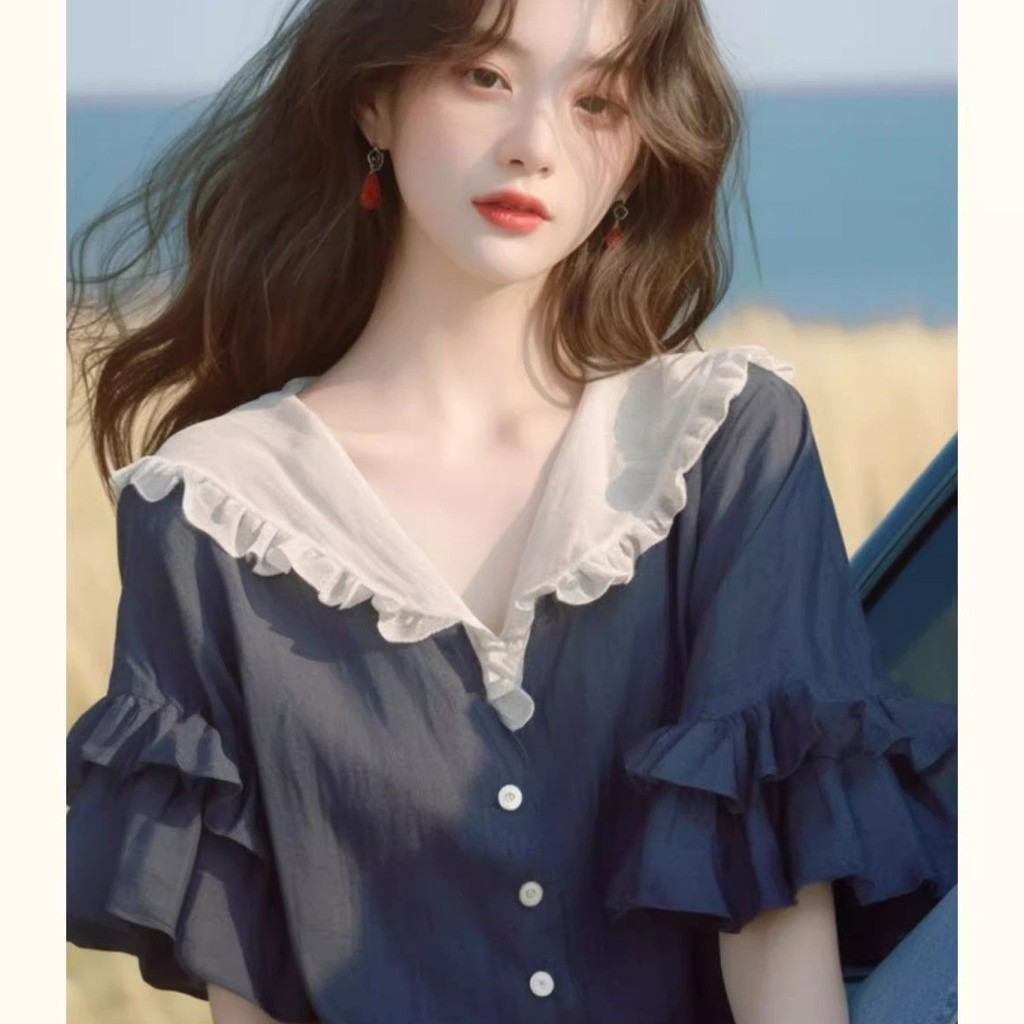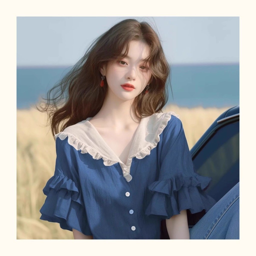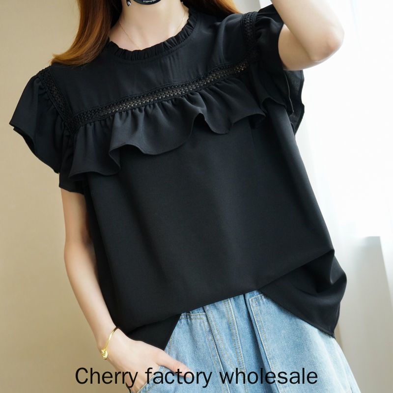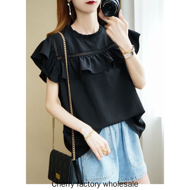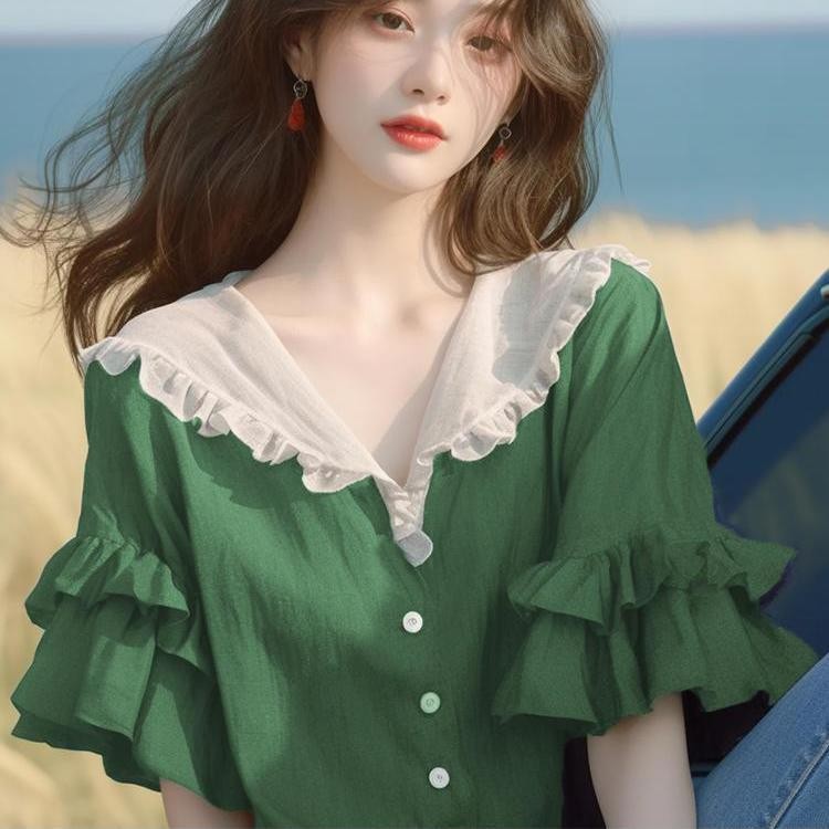 แฟชั่นผู้หญิงสไตล์ใหม่ High-End สวยสีเขียวสีฟ้าสีดํา Lotus Leaf Collar เสื้อแขนสั้น