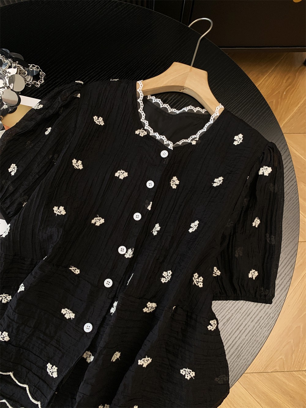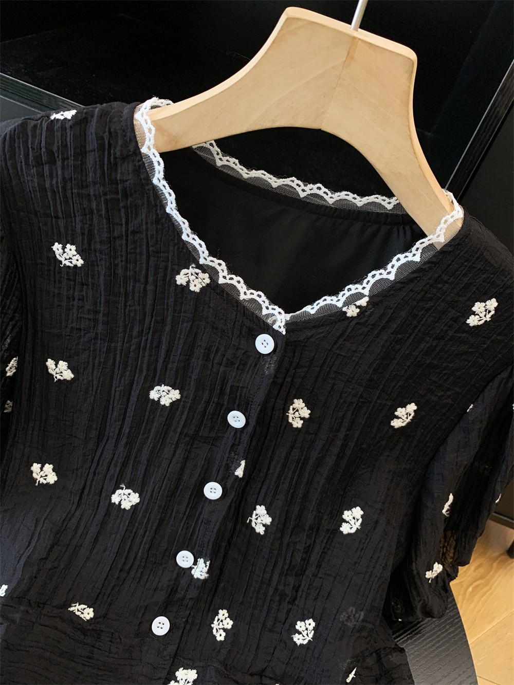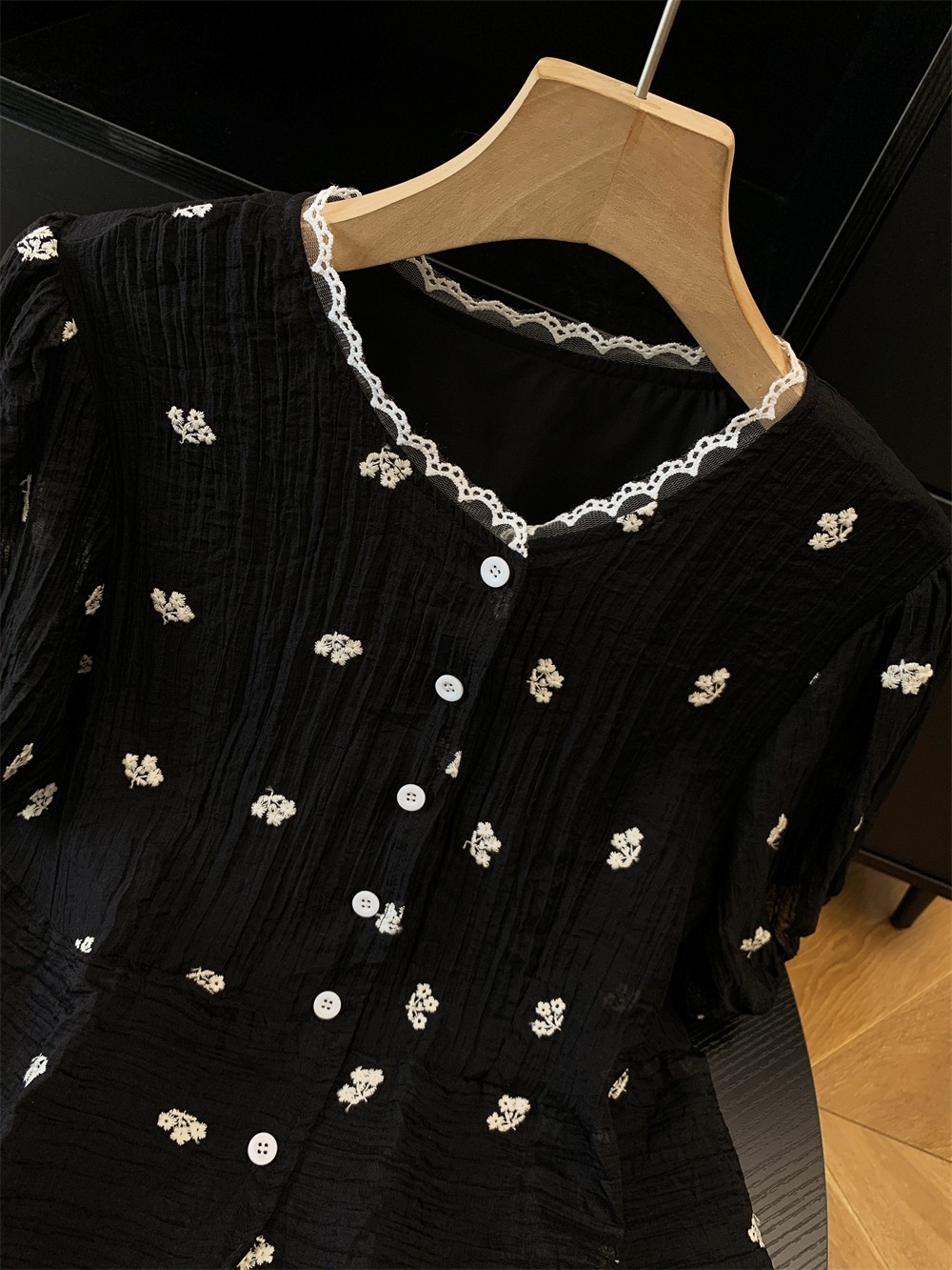 แฟชั่นผู้หญิงสไตล์ใหม่ High-End สวยสีเขียวสีฟ้าสีดํา Lotus Leaf Collar เสื้อแขนสั้น