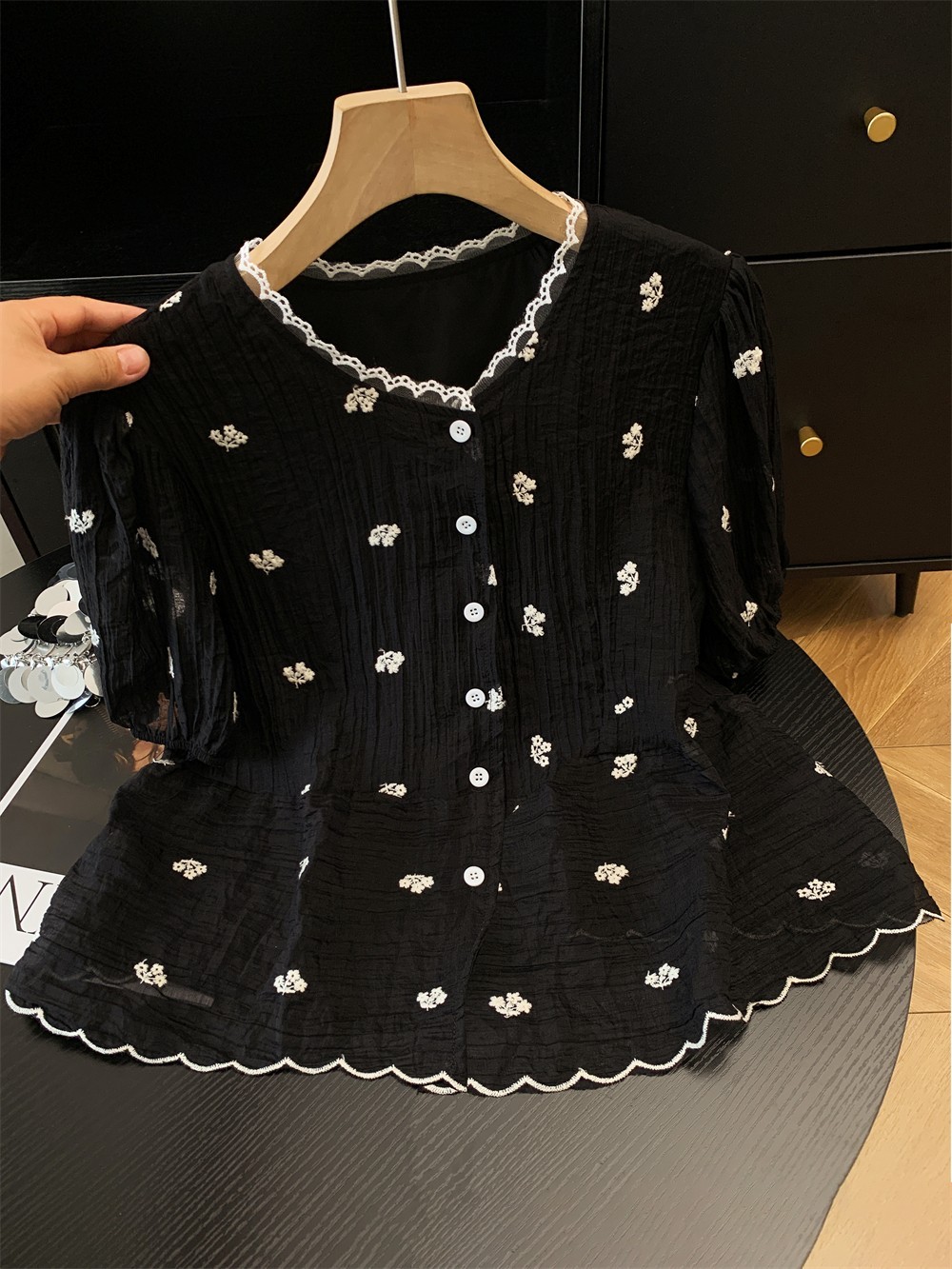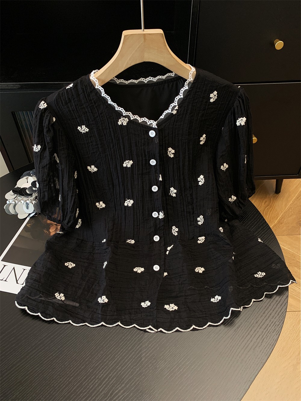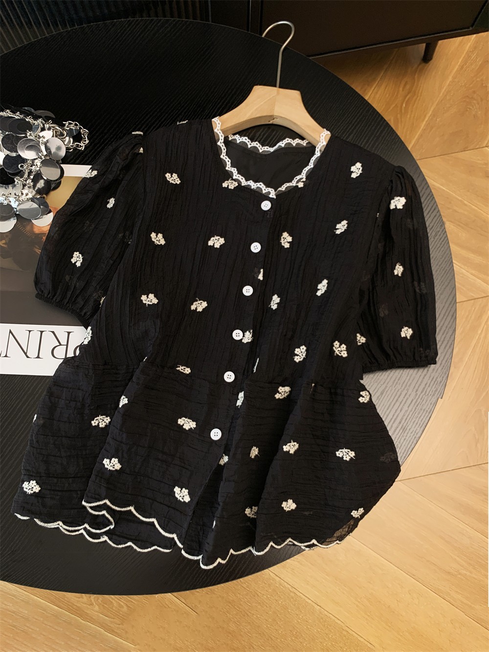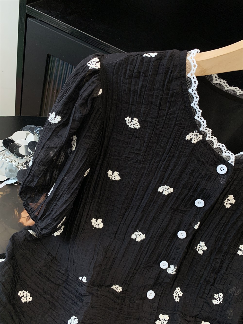 แฟชั่นผู้หญิงสไตล์ใหม่ High-End สวยสีเขียวสีฟ้าสีดํา Lotus Leaf Collar เสื้อแขนสั้น