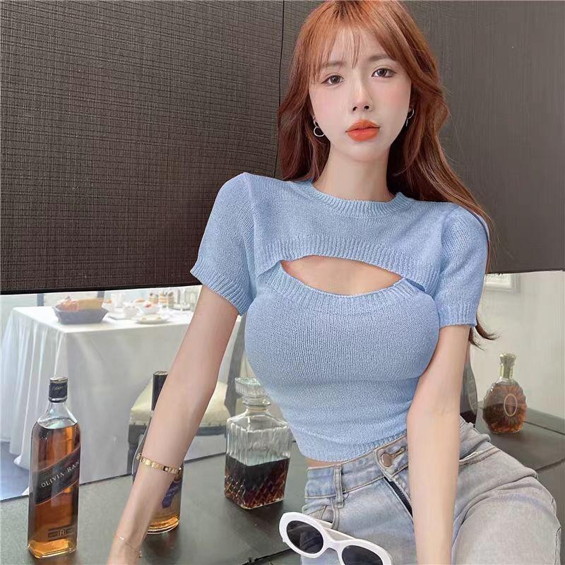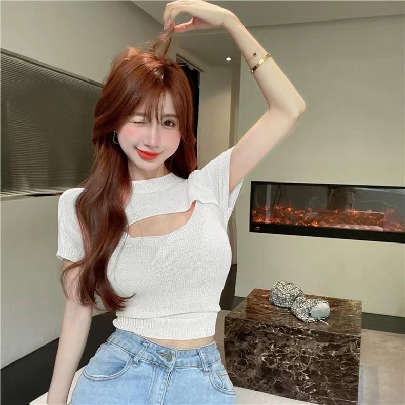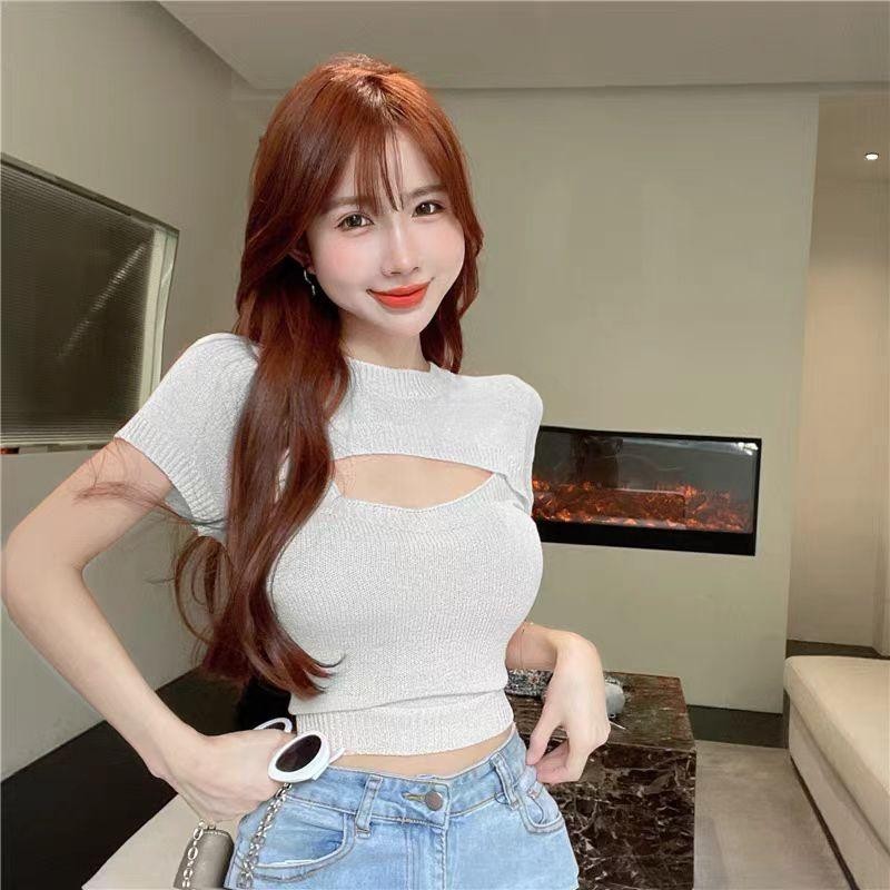 เสื้อไหมพรมแขนสั้น เสื้อผ้าผู้หญิง โชว์ร่อง อก เซ็กซี่ น่ารักแอบแซ่บนิดๆ มี5สี พร้อมส่ง #9cx46