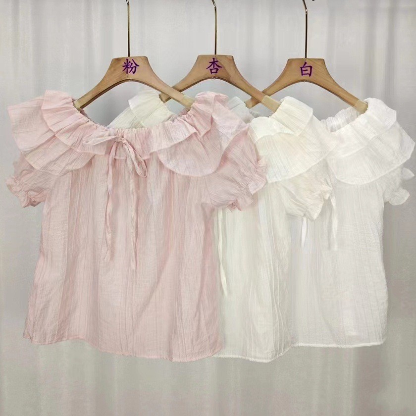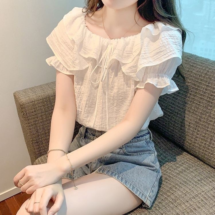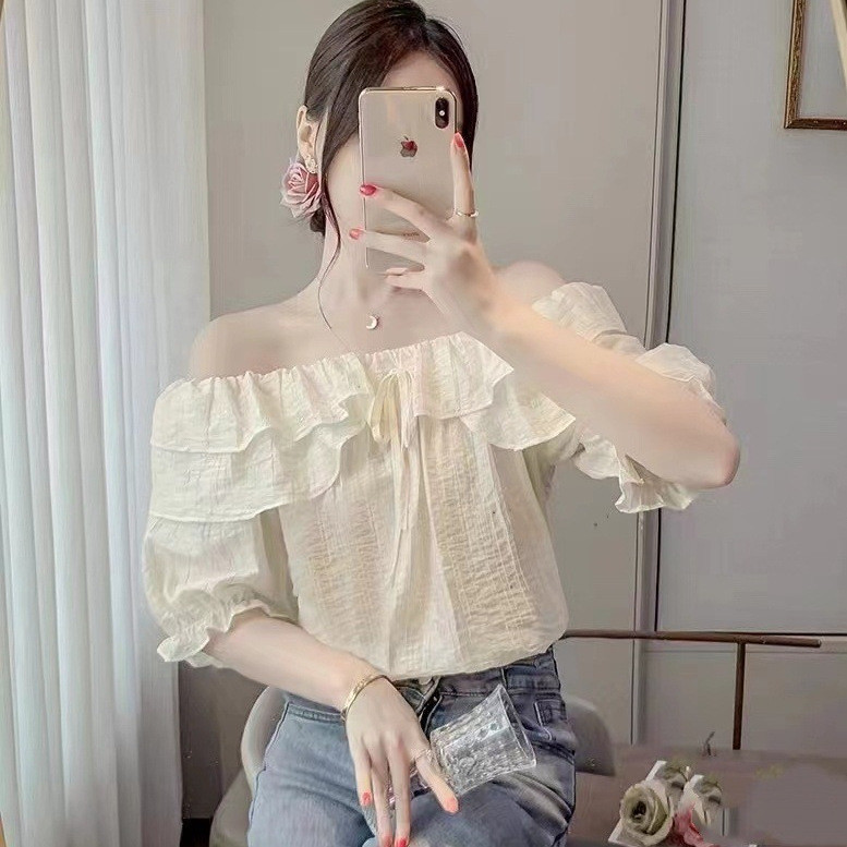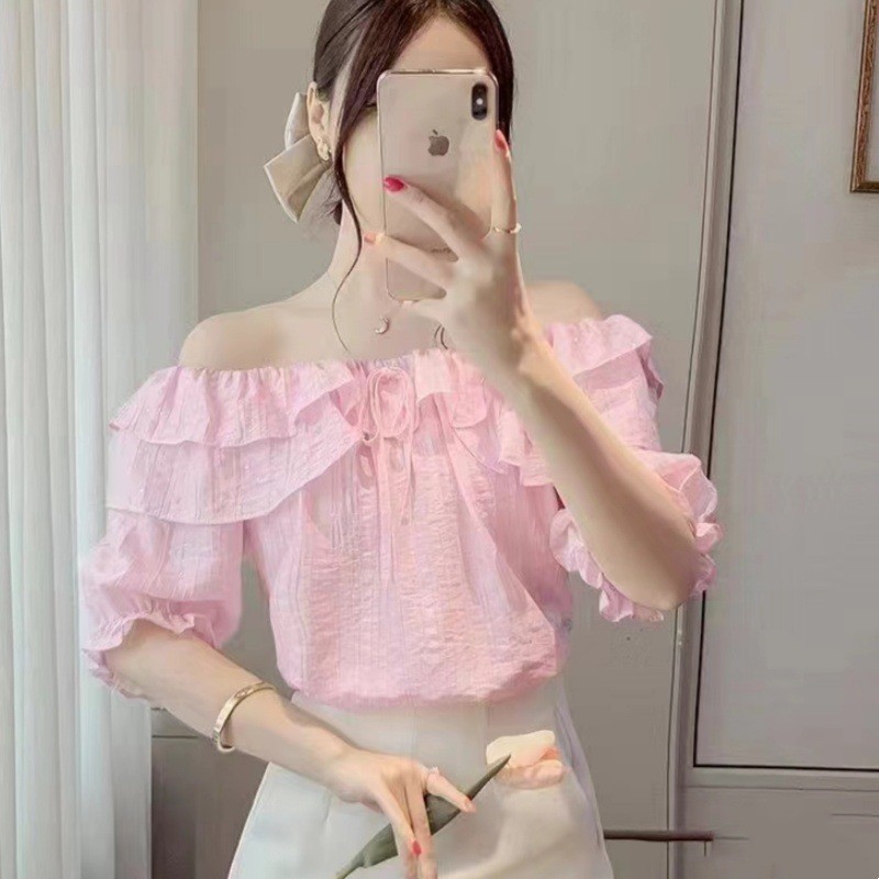 แฟชั่นเกาหลีปิดไหล่ท็อปส์น่าระทึกใจแขนเสื้อชีฟองผู้หญิง
