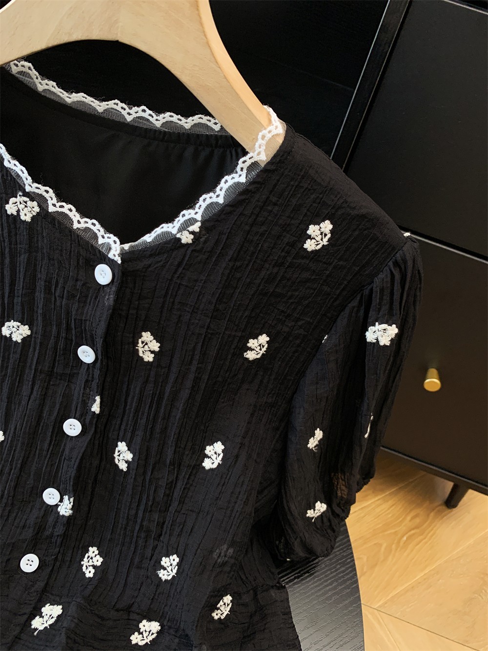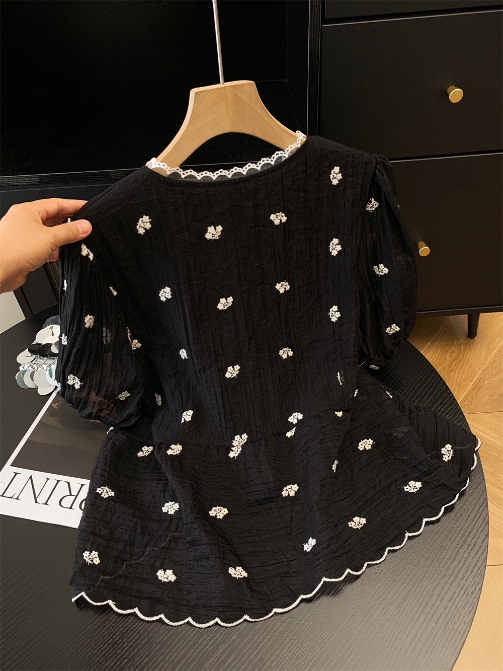 แฟชั่นผู้หญิงสไตล์ใหม่แขนยาวแคบ-เอวโบว์คอวีลูกไม้ขึ้นเสื้อแขนสั้นผู้หญิง
