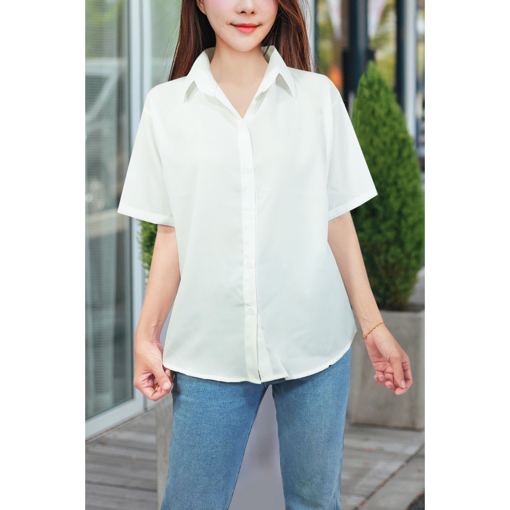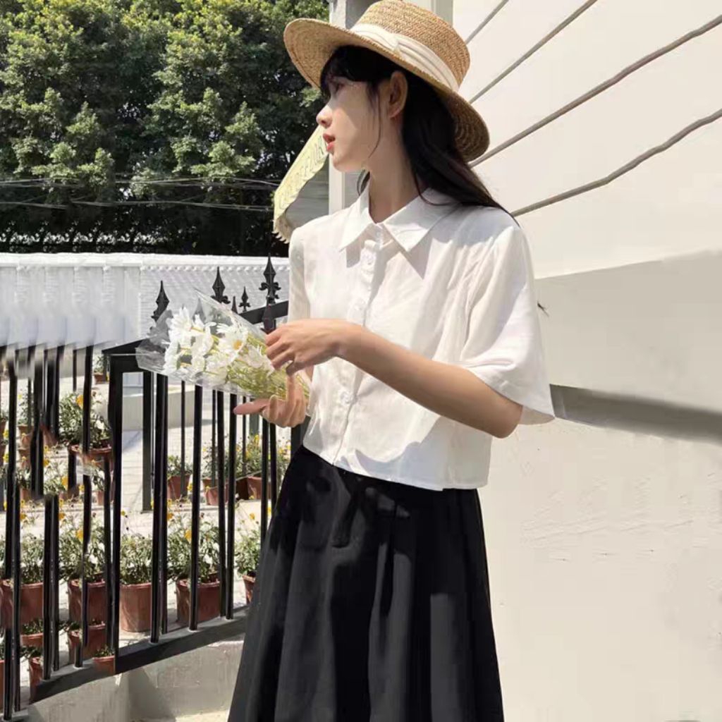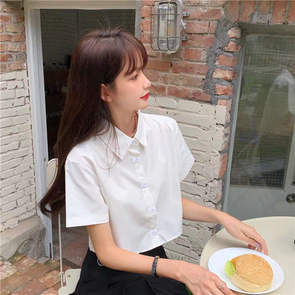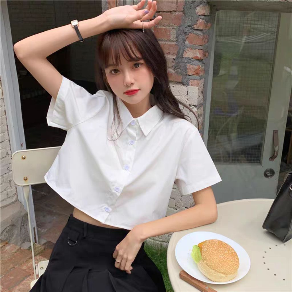 💥เสื้อเชิ้ตครอปผู้หญิงสีขาว แขนสั้น แฟชั่นเกาหลี เนื้อผ้าใส่สบายรีดง่ายยับยาก KT05