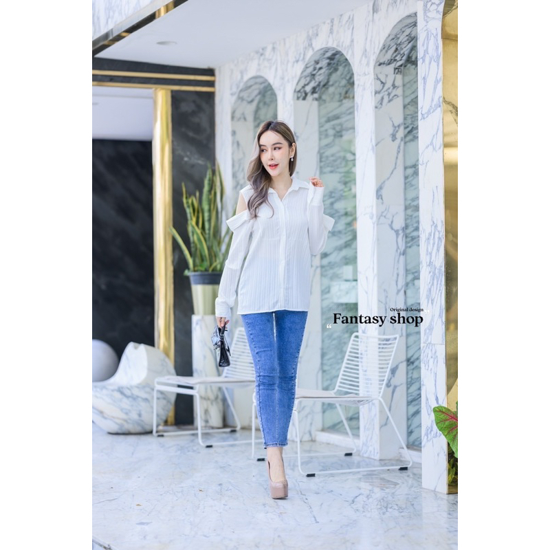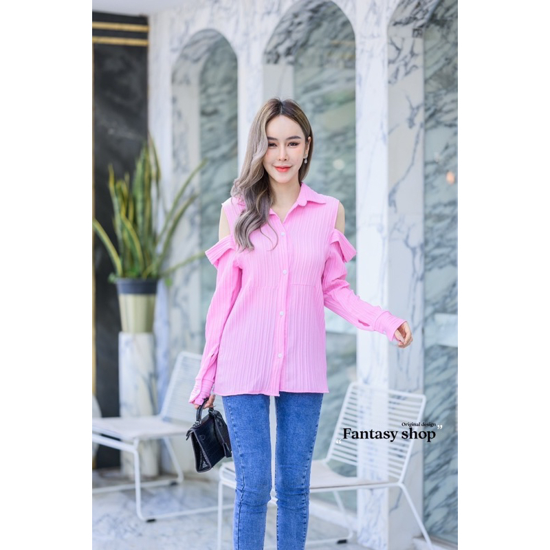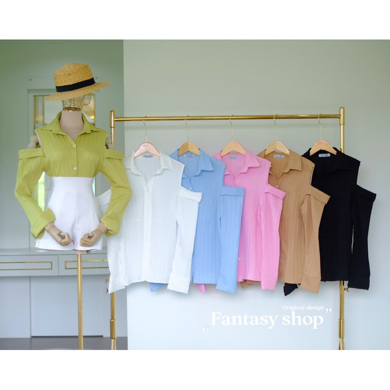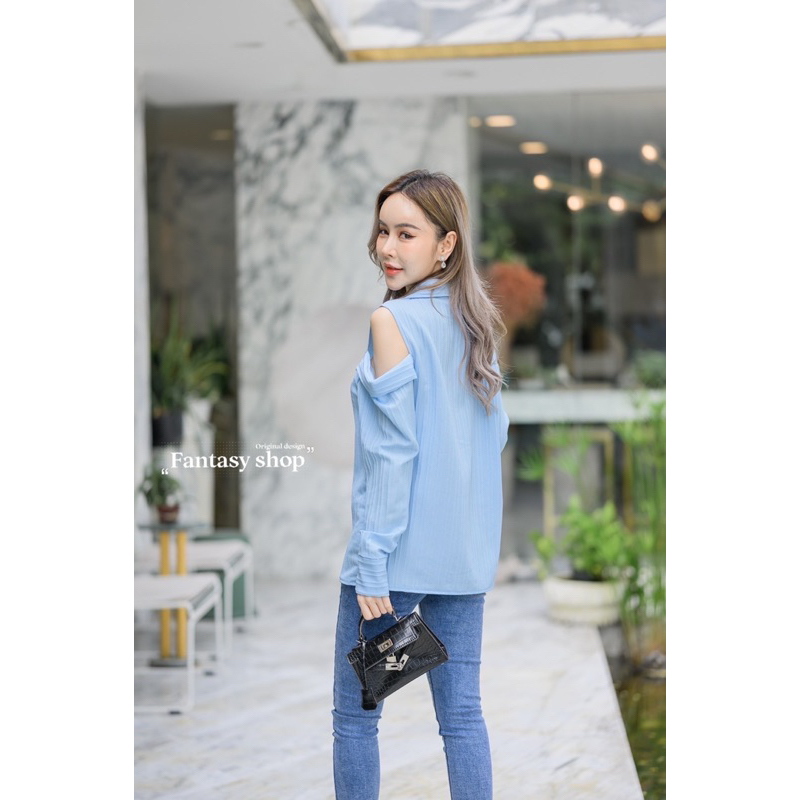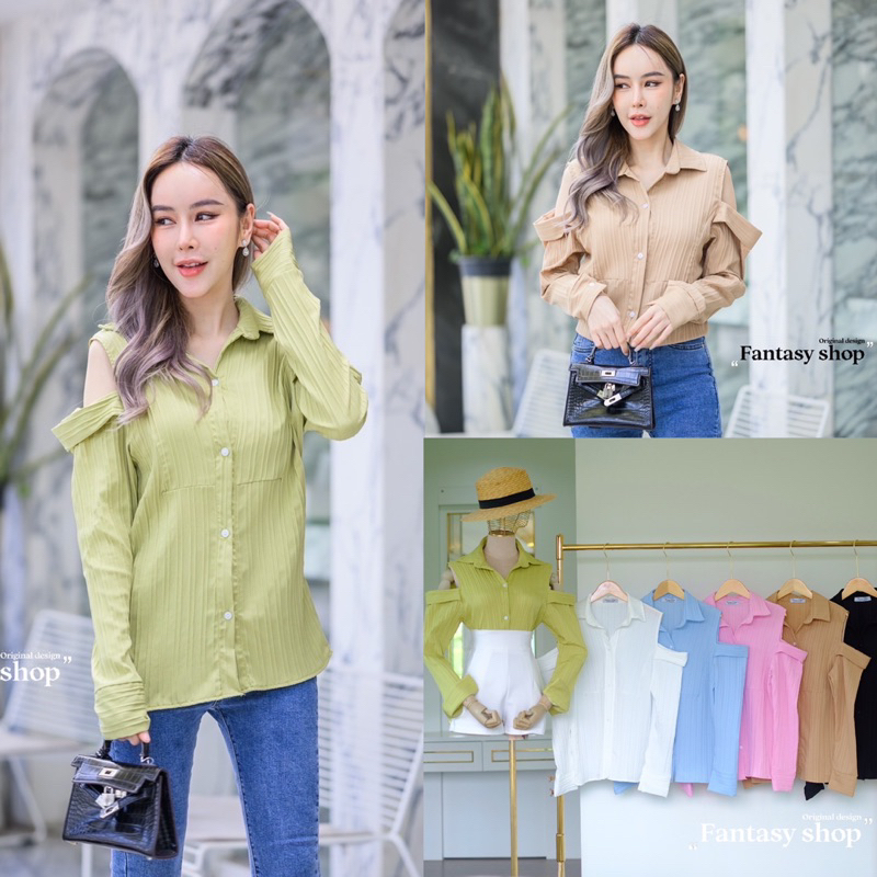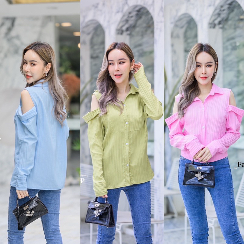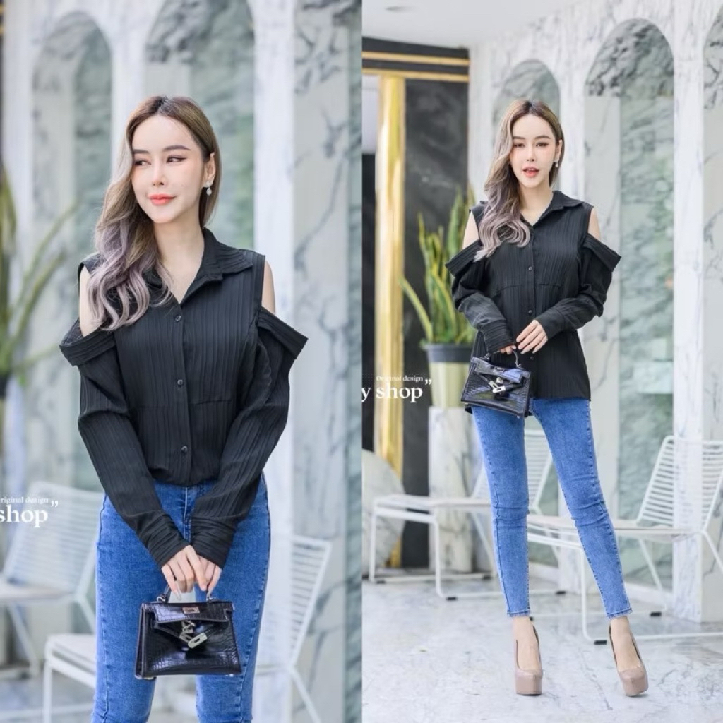 🔆Sunny🔆SALE‼️เสื้อเชิ้ตทรงเว้าไหล่ผ้าร่อง💕เสื้อเว้าแขนน่ารัก เสื้อแขนยาวเว้าไหล่