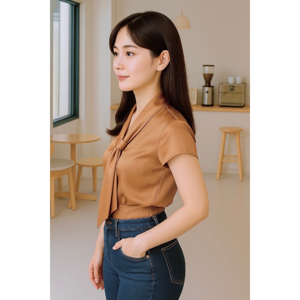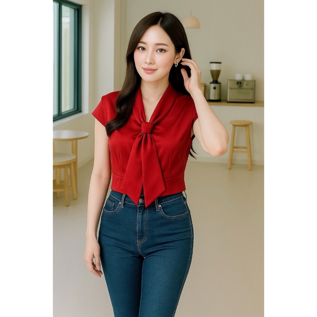 🔴ส่งไว🔴⚡เสื้อครอปคอปกไทด์ ผ้าซาตินซาร่าพรีเมียม แขนล้ำ ทรงเข้ารูป SML | สีคาราเมล กรม แดง นู๊ด | เสื้อแฟชั่นผู้หญิงเกาหล